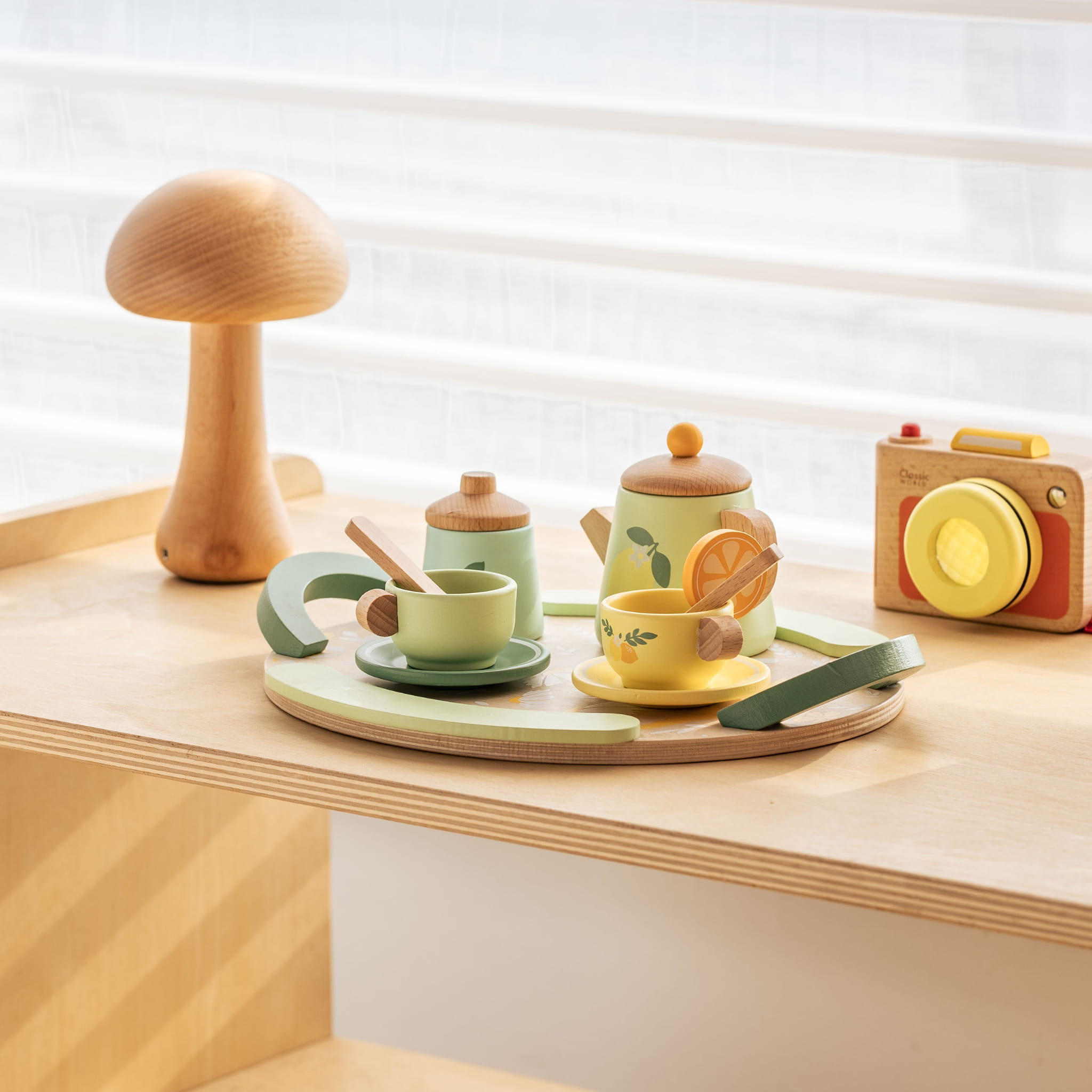 Zestaw do Herbaty od firmy Classic World to świetny pomysł na długie godziny zabawy dla twojego malucha. Twoja pociecha zaskoczy Cię nie raz, serwując pyszną herbatę. Zamień podwieczorek w piękny rytuał dzięki różnym akcesoriom, w tym: dwie filiżanki w różnych kolorach,czajniczek i tacka w kwiatki oraz różne dodatki do herbaty. Piękna pastelowa kolorystyka dodatkowo zachęci dziecko do zabawy. Zestaw został wykonany z solidnego drewna, aby Twój maluch mógł bezpiecznie oddać się serwowaniu przepysznej herbaty.