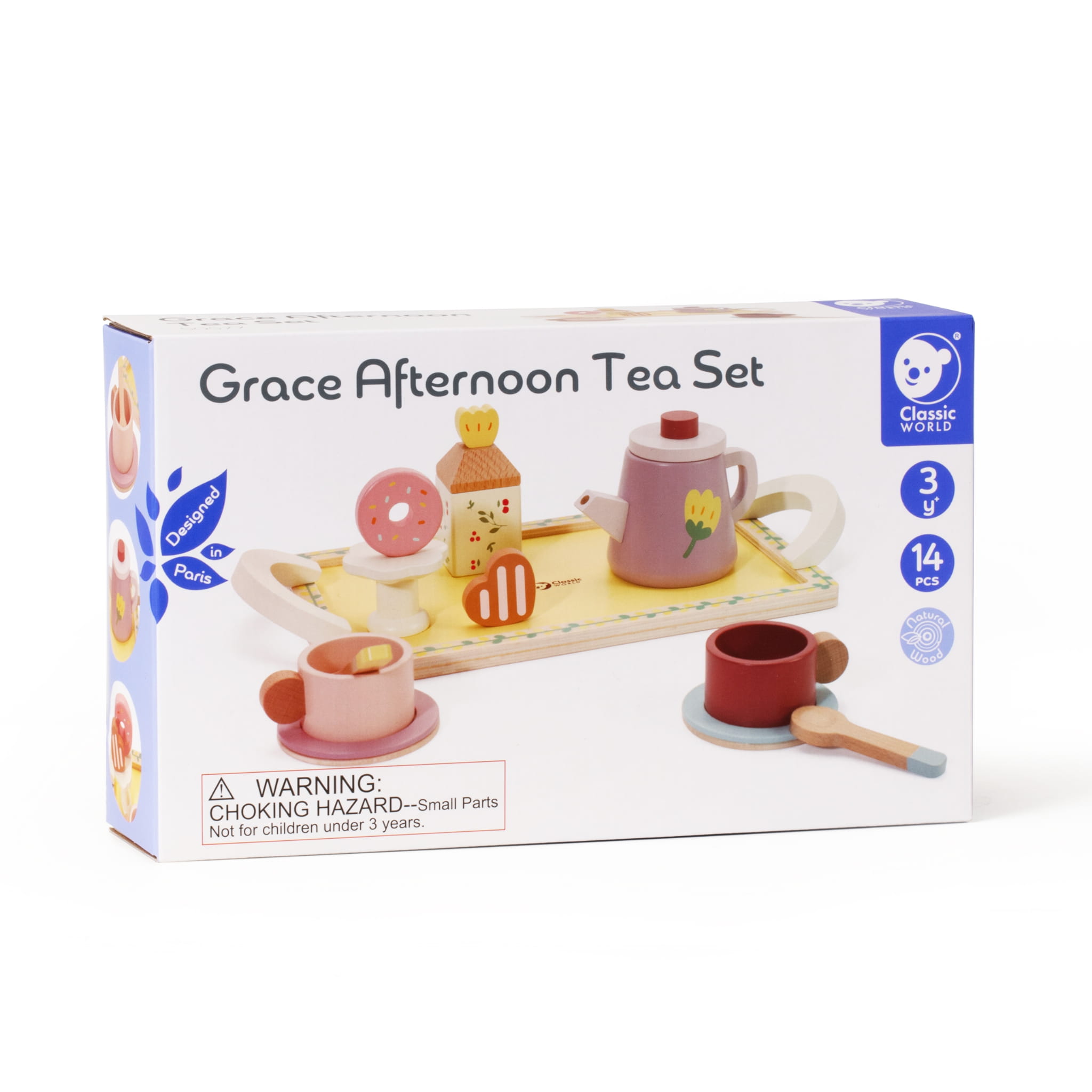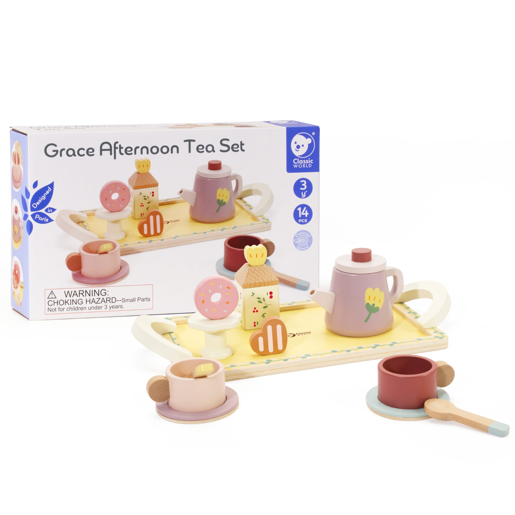 Drewniany zestaw do herbaty i deserów od CLASSIC WORLD, to świetna propozycja dla dzieci które chcą wcielać się w różne role w życiu codziennym. Urocze pastelowe kolory zachwycą Twoje dziecko a akcesoria t.j. dzbanek na herbatkę, filiżanki oraz desery pobudzą wyobraźnię i kreatywność Twojego malucha.