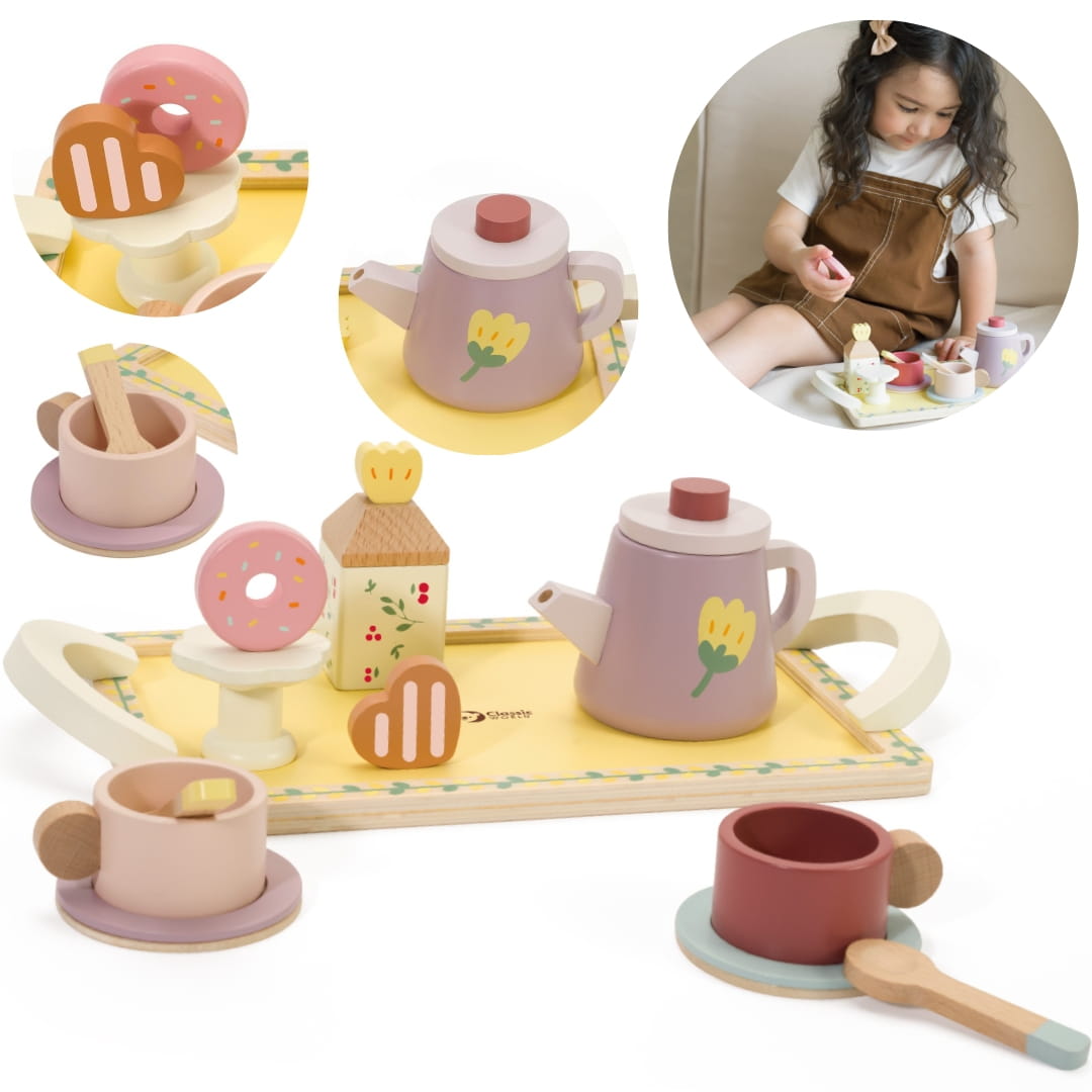Drewniany zestaw do herbaty i deserów sprawi, że dziecko będzie mogło przyjmować gości i serwować herbatę oraz desery całej rodzinie. Nauczy dobrych manier i umiejętności dzielenia się z innymi podczas zabawy.