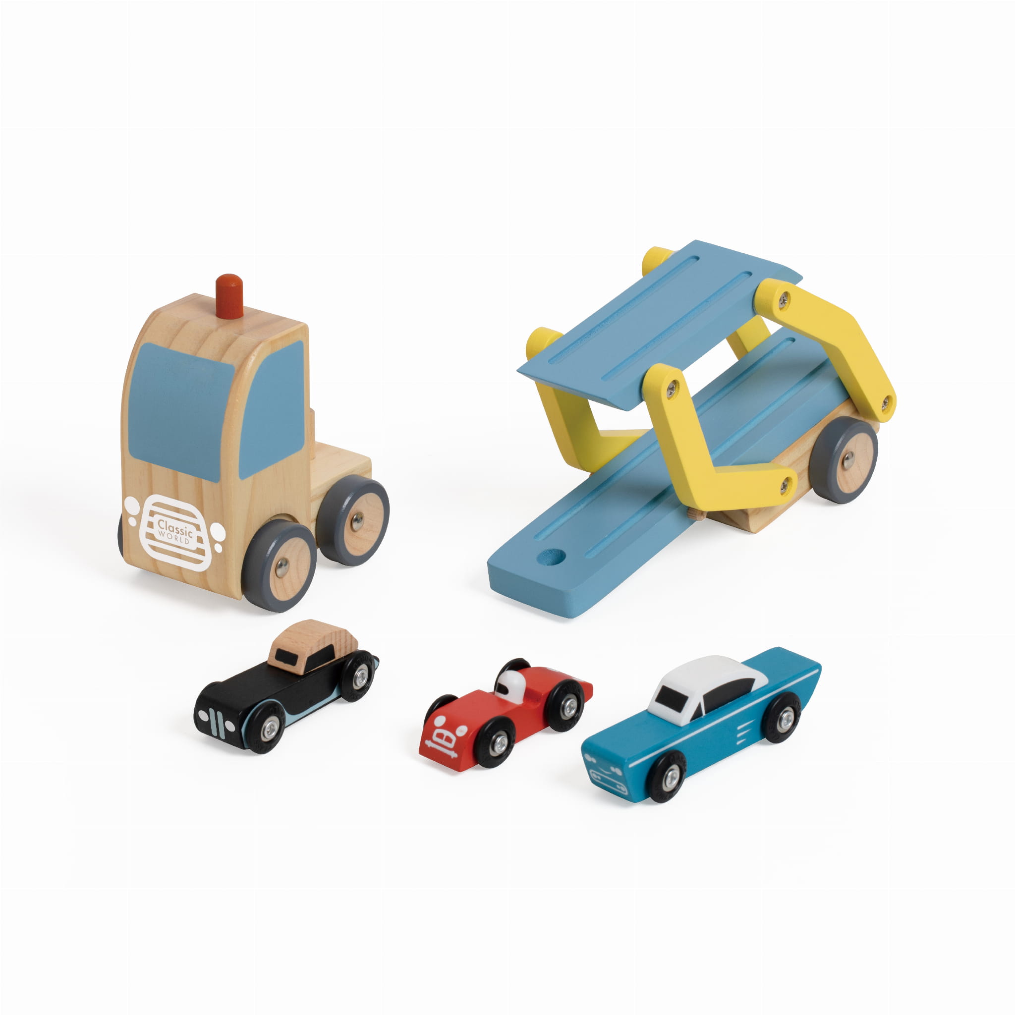 Drewniany transporter samochodowy od marki CLASSIC WORLD to trwały i wysokiej jakości zestaw zabawek, który zawiera 1 ciężarówkę, najazd z platformą i 3 pojazdy. Zabawka pomaga dzieciom rozwijać umiejętności motoryczne oraz koordynację ręka-oko, zapewniając jednocześnie wiele godzin zabawy przy załadunku i rozładunku.