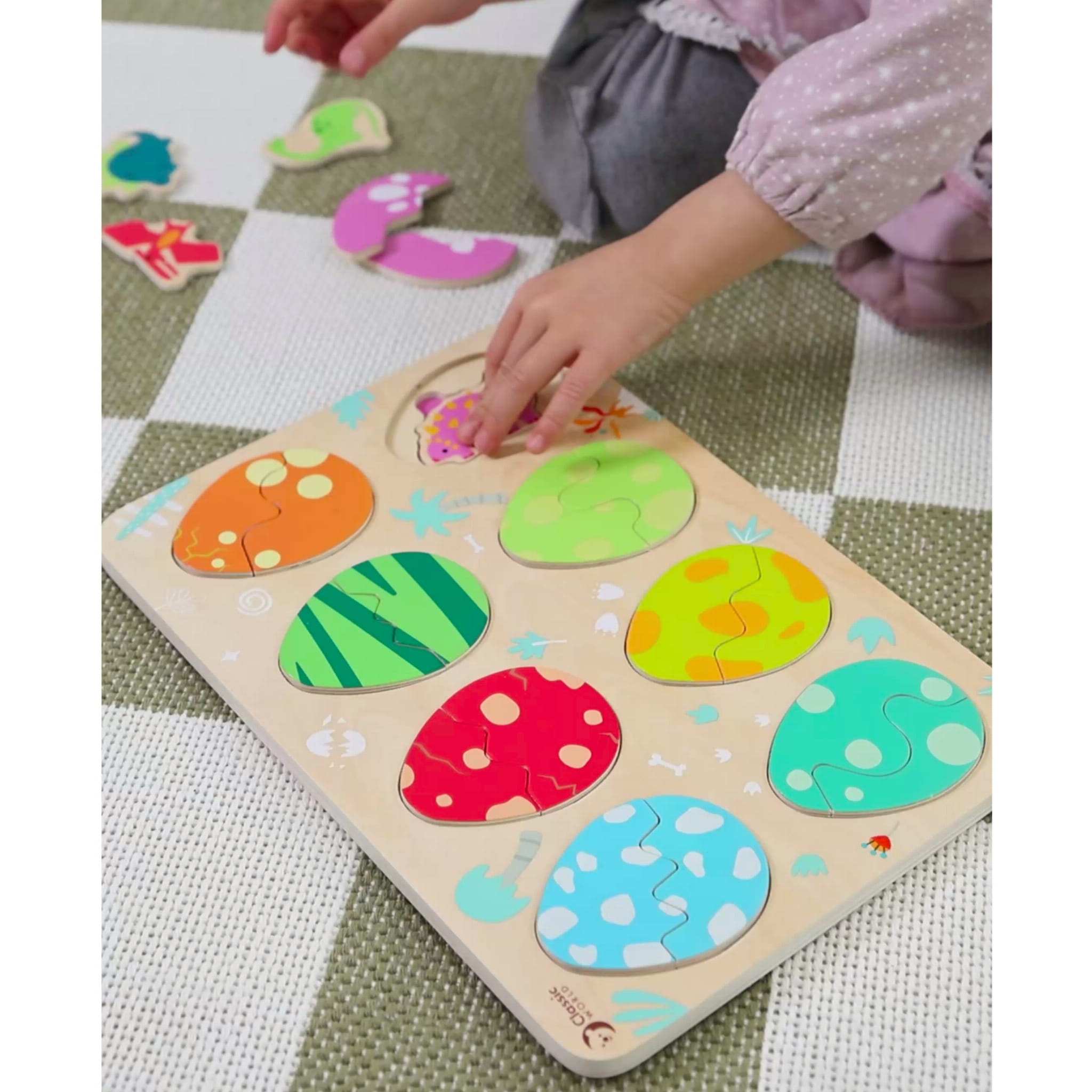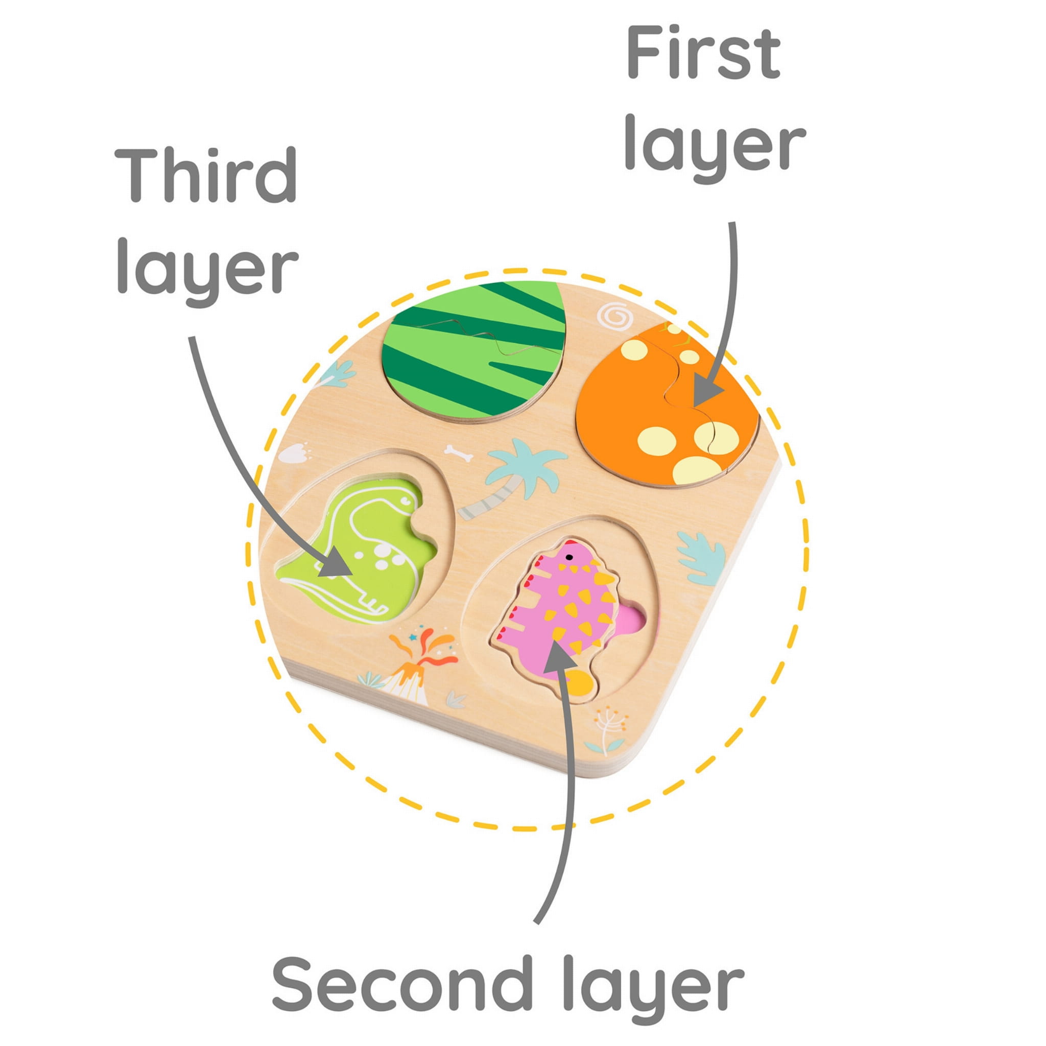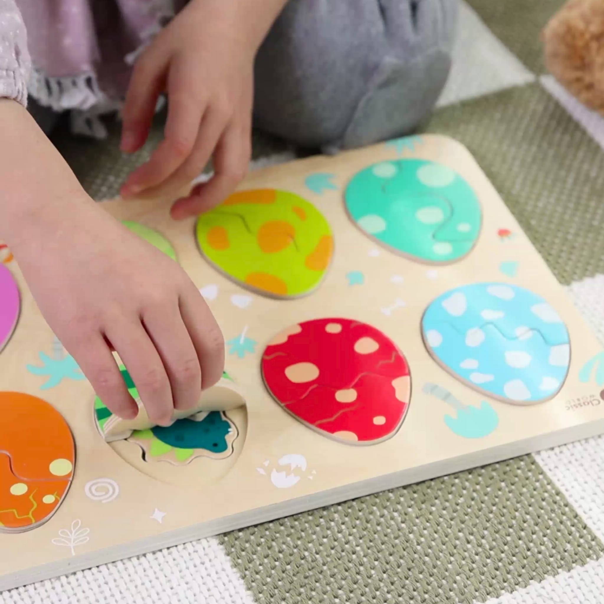 Trójwarstwowa konstrukcja pozwala dopasowywać jajka do ukrytych pod nimi dinozaurów, a na najniższej warstwie odkrywać proste rysunki pomagające w dopasowywaniu dinozaurów do opowiadających im miejsc. Zabawka wspiera naukę kształtów i kolorów, logiczne myślenie i kreatywność w przyjemny sposób.