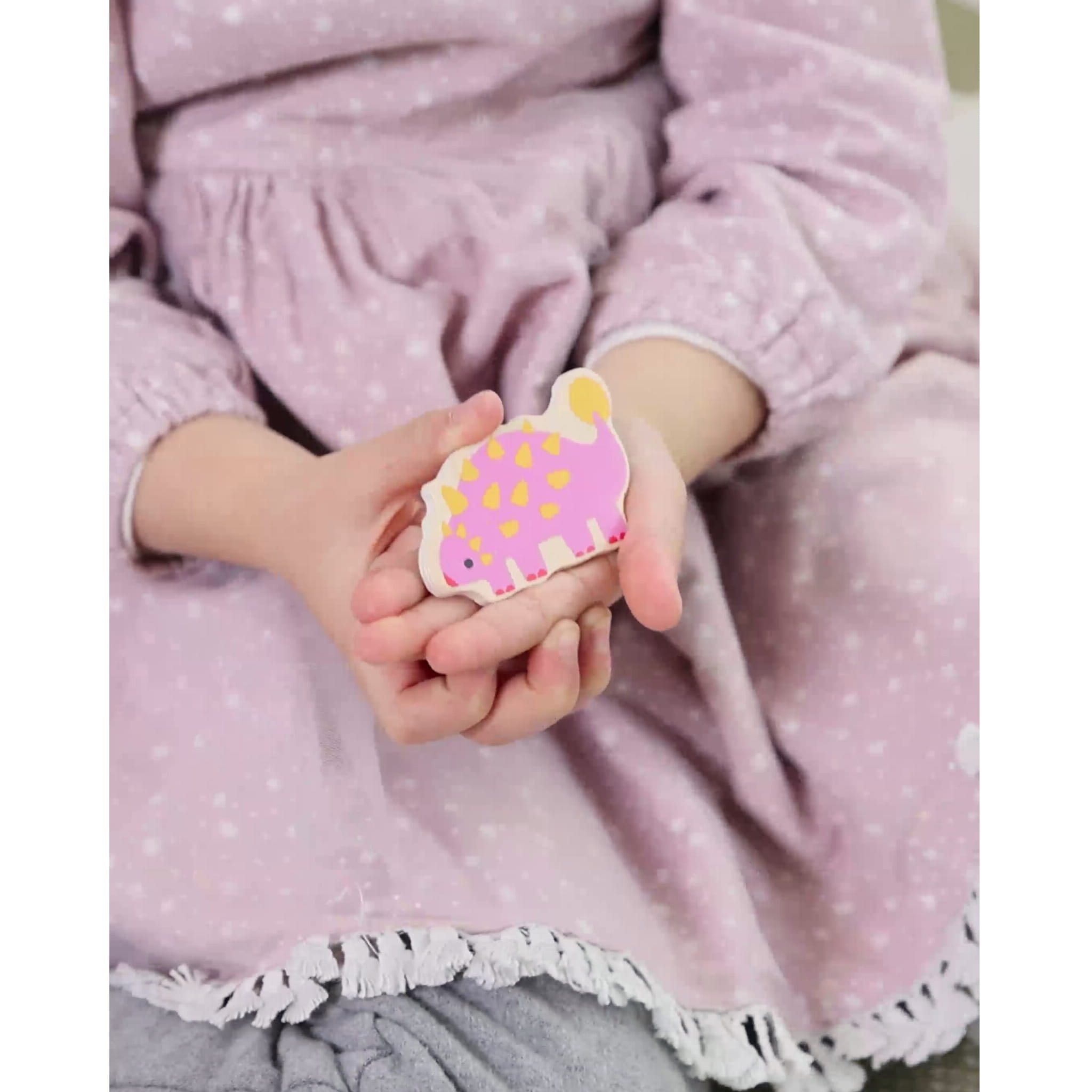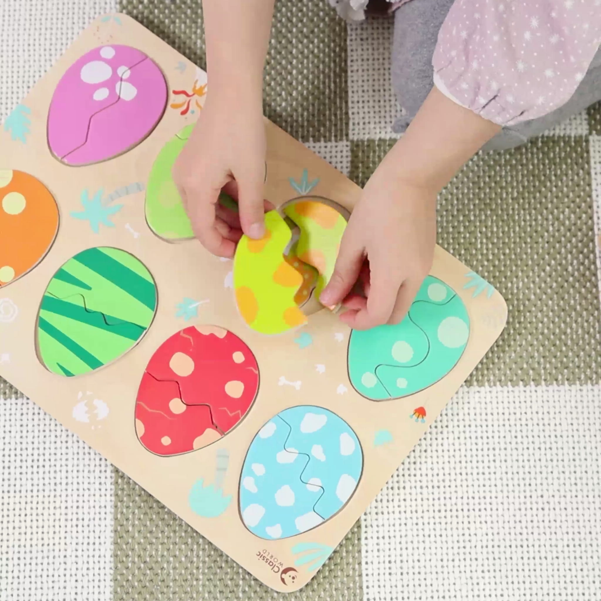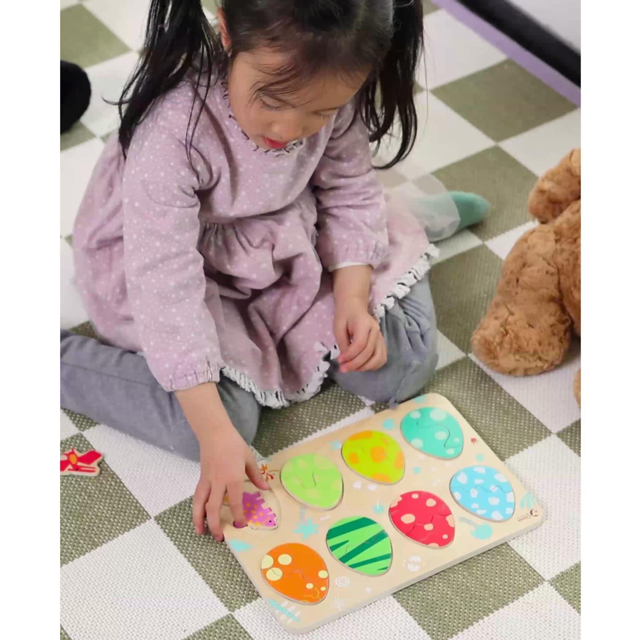 Trójwarstwowa konstrukcja pozwala dopasowywać jajka do ukrytych pod nimi dinozaurów, a na najniższej warstwie odkrywać proste rysunki pomagające w dopasowywaniu dinozaurów do opowiadających im miejsc. Zabawka wspiera naukę kształtów i kolorów, logiczne myślenie i kreatywność w przyjemny sposób.
