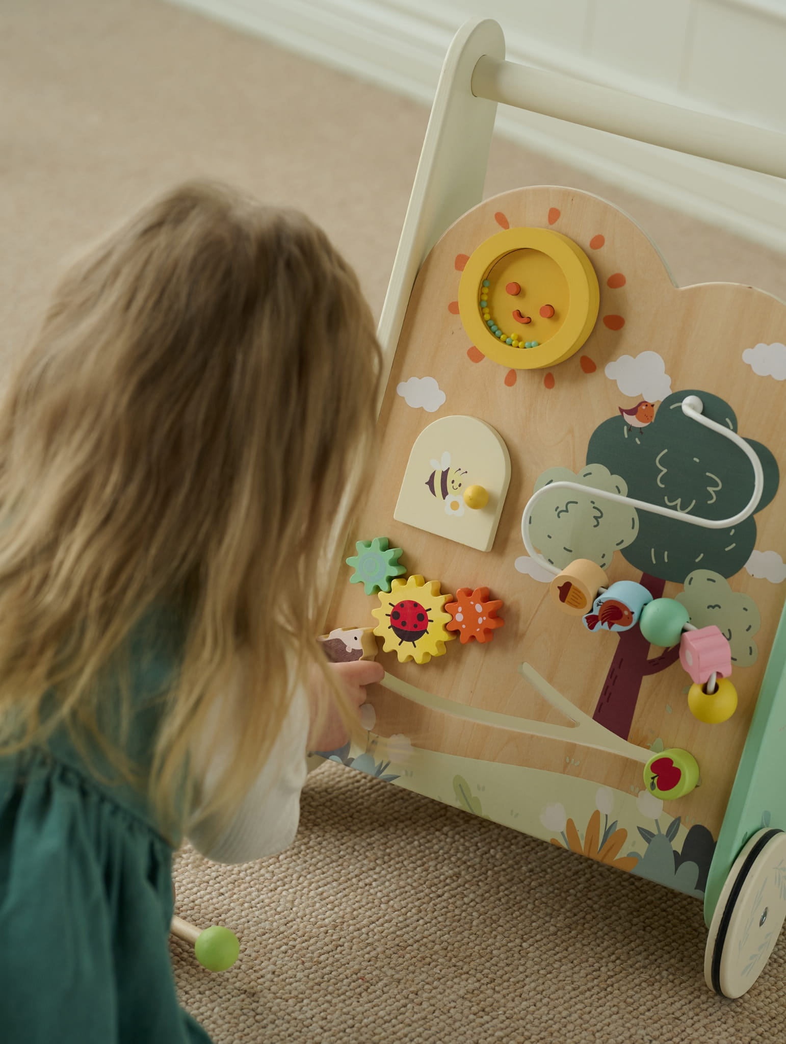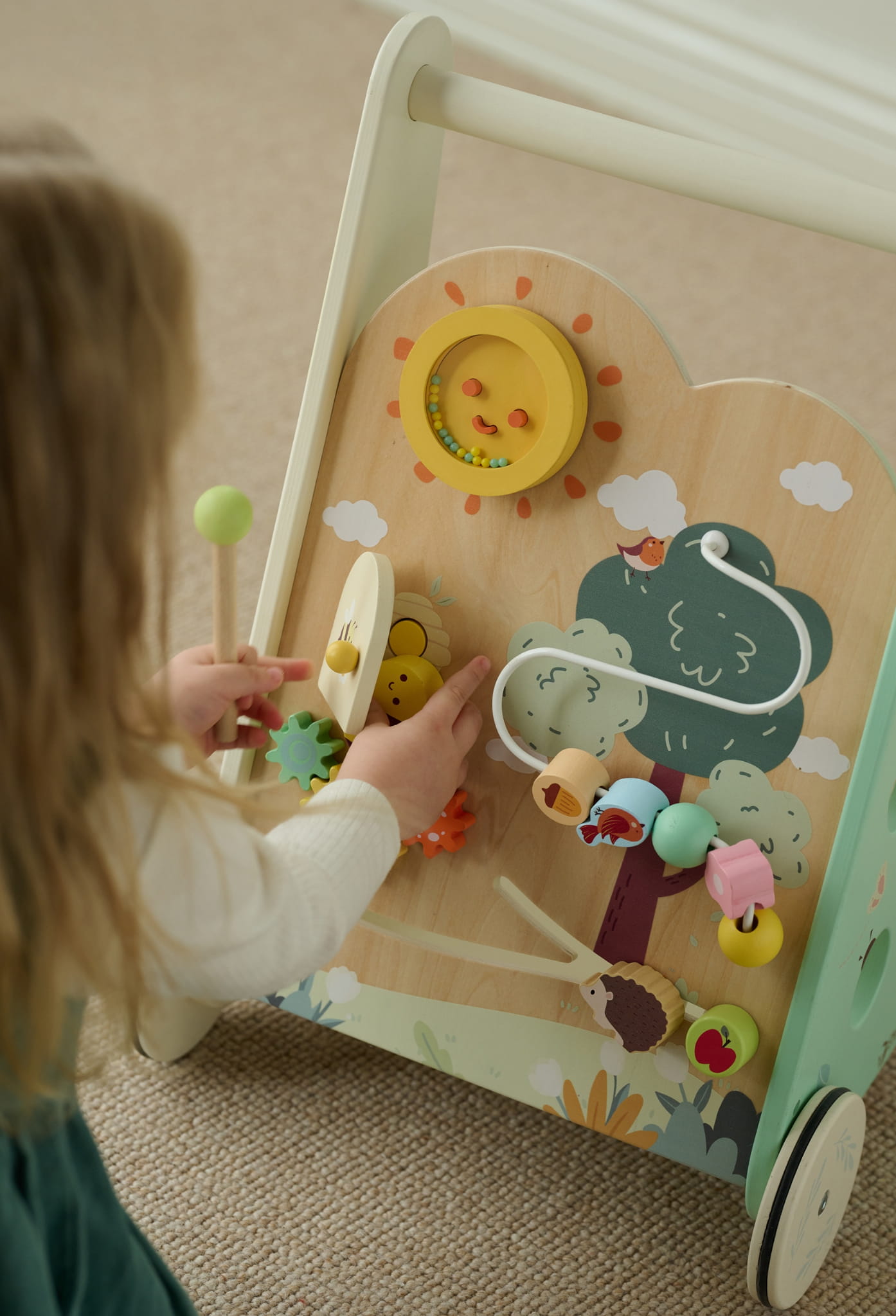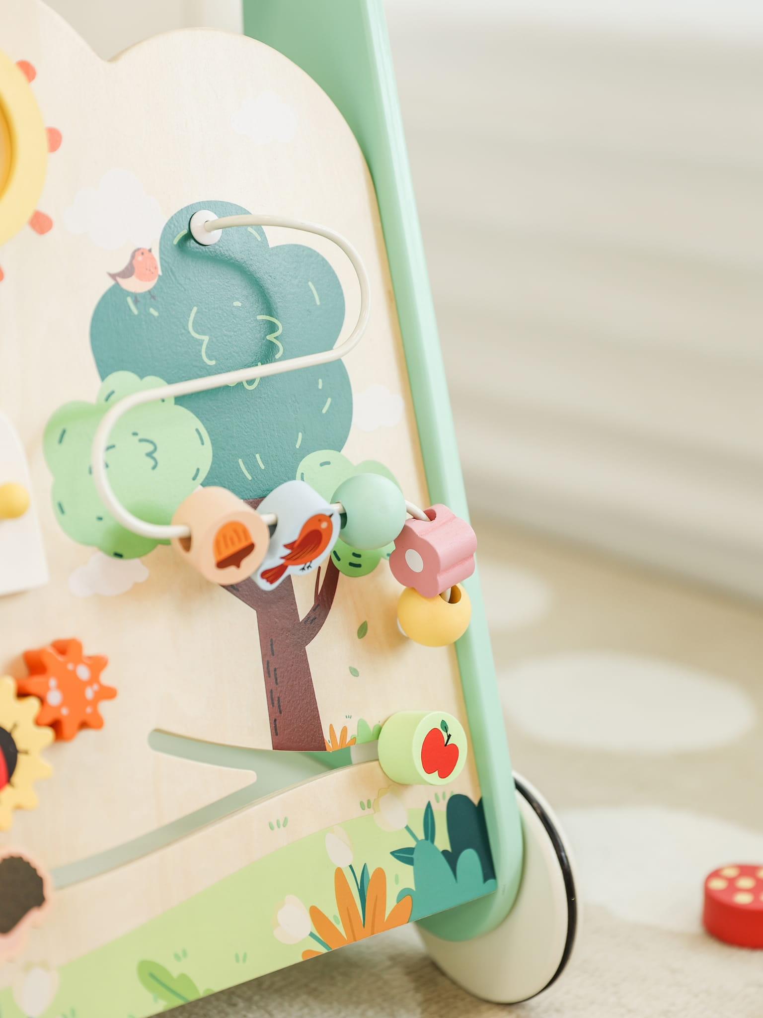- - Rozwój zdolności motorycznych - Przesuwanie koralików, sortowanie klocków i zabawa kołami zębatymi wymagają precyzji i siły, co wspiera rozwój małej motoryki i wzmacnia mięśnie dłoni.
