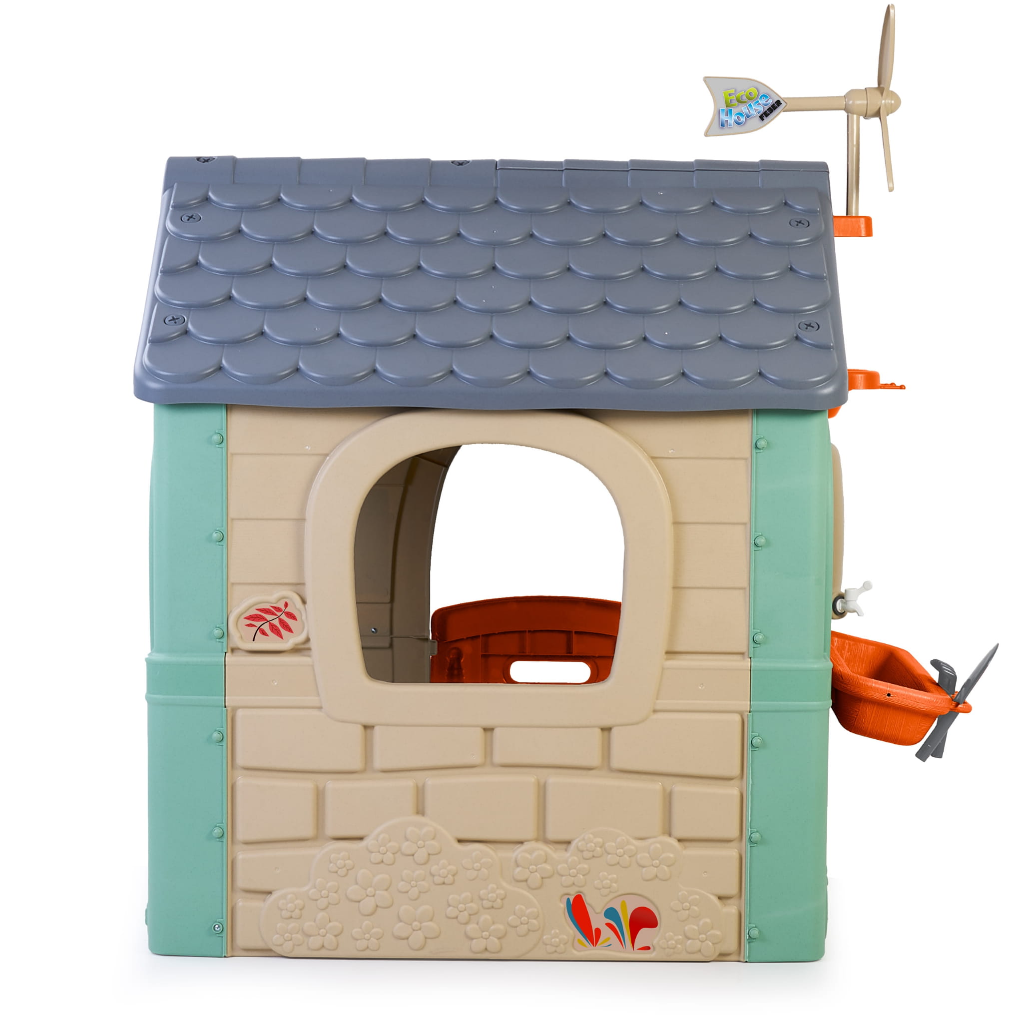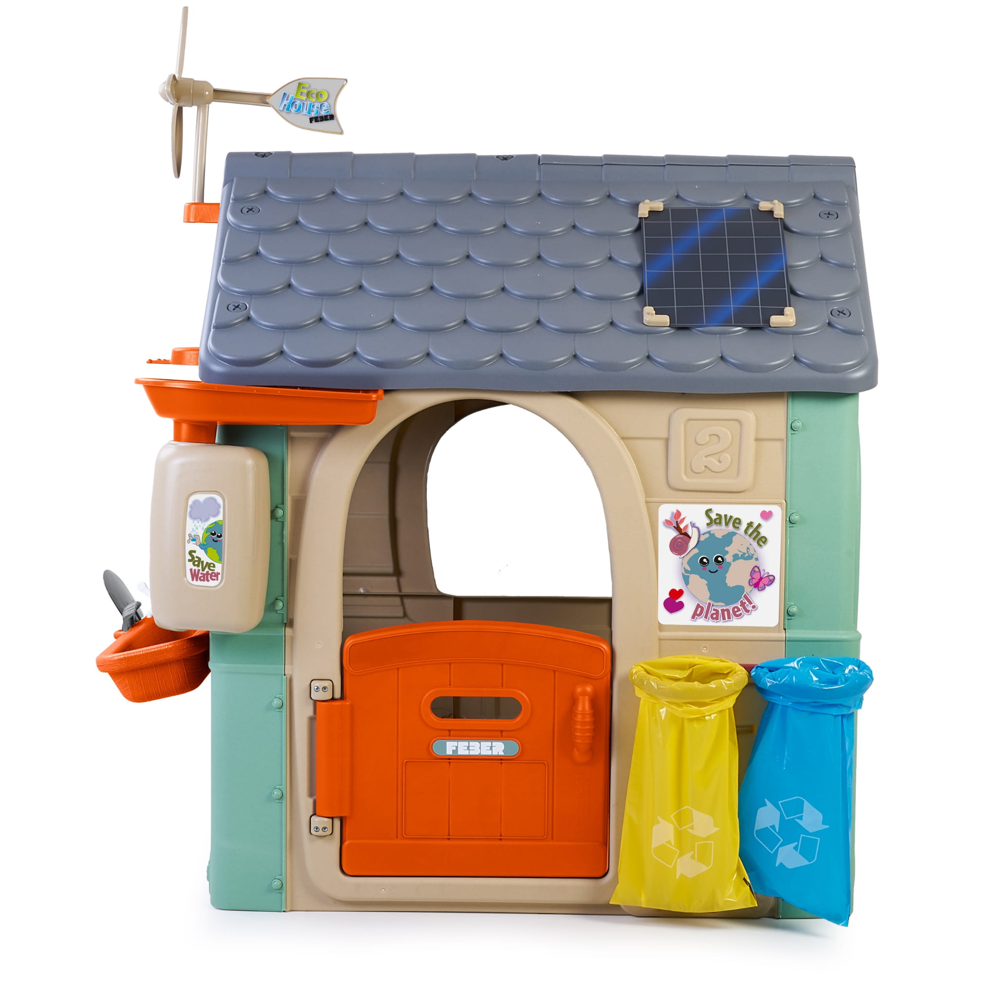 Domek FEBER Recycle ECO to domek wykonany w 90% z ekologicznych materiałów tworzywa sztucznego pochodzącego z recyklingu. Zwycięzca ToyAward 2024 na największych targach zabawek w Norymberdze za swoją wszechstronną edukacje o ekologii. To doskonale wykonany domek zabaw, w którym znajdują się wszystkie aktywności potrzebne maluchom do wzbudzenia ciekawości w przyrodzie. Świetne miejsce i świetna nauka dla dzieci na temat segregowania śmieci, recyklingu, ekologicznego uprawiania roślin oraz produkcji zielonej energii dzięki turbinie wiatrakowej oraz panelom słonecznym na dachu. W zestawie 2 kosze do recyklingu (żółty i niebieski), mały ogródek (w doniczkach) i narzędzia. To świetna aktywność na świeżym powietrzu dla dzieci. Można bawić się w sadzenie nasion i obserwowanie wzrostu roślin. Wyposażony jest również w karmnik dla ptaków. A woda deszczowa jest idealna do podlewania roślin lub kwiatów. Wiatrak i imitacja panelu słonecznego dają niesamowite funkcje do nauki o zrównoważonych energiach! Odporne, łatwe w montażu i wyposażone w system Anti UV zapobiegający utracie koloru i zwiększający odporność tworzywa.