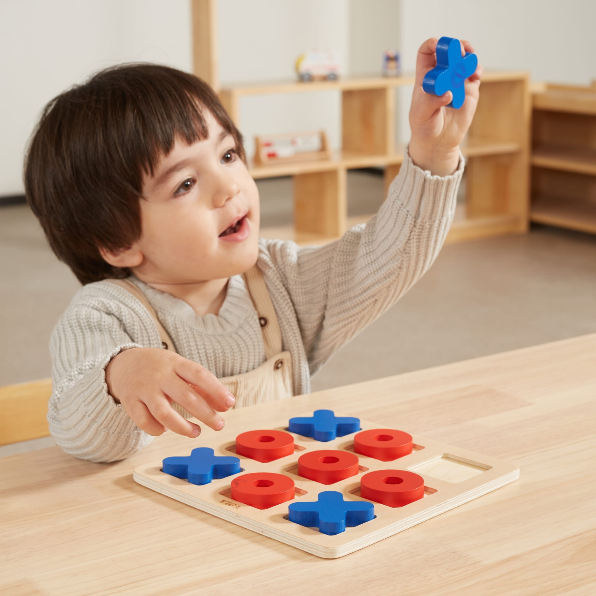 Przyjemne w dotyku, kolorowe pionki X i O ułatwiające chwytanie małymi rączkami