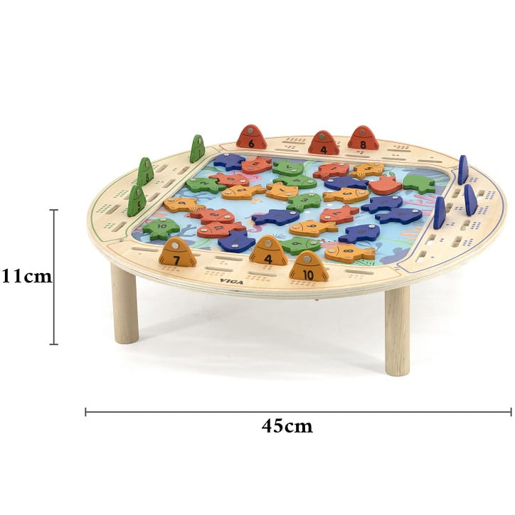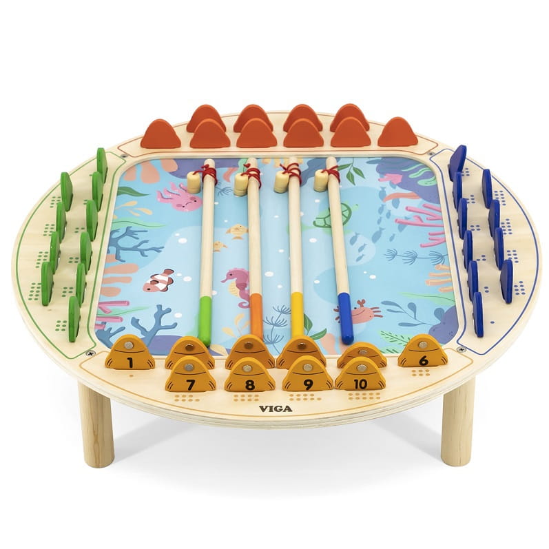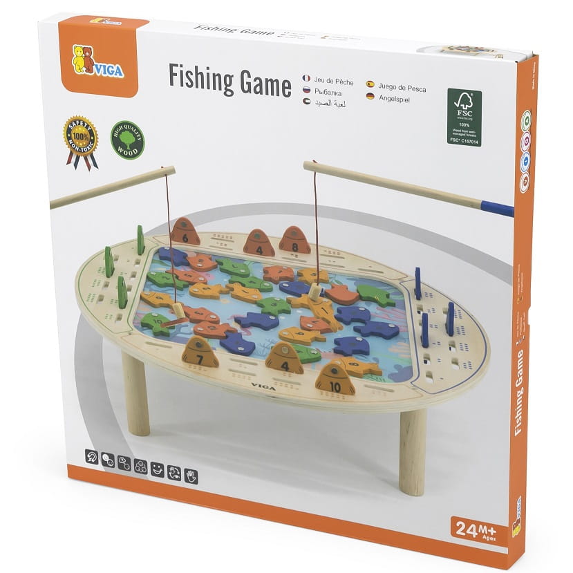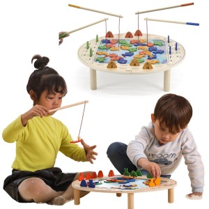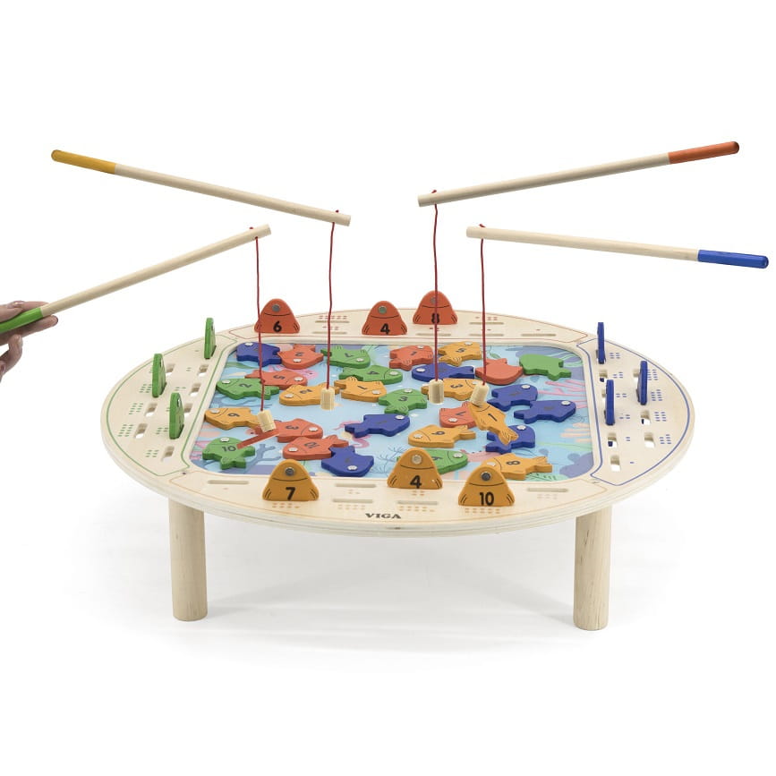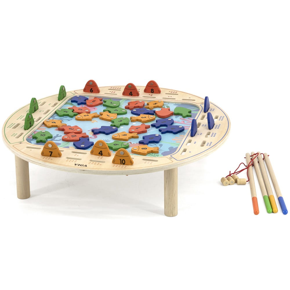 - - zabawka zawiera - drewniany stół do gry, 4 wędki oraz 40 rybek,