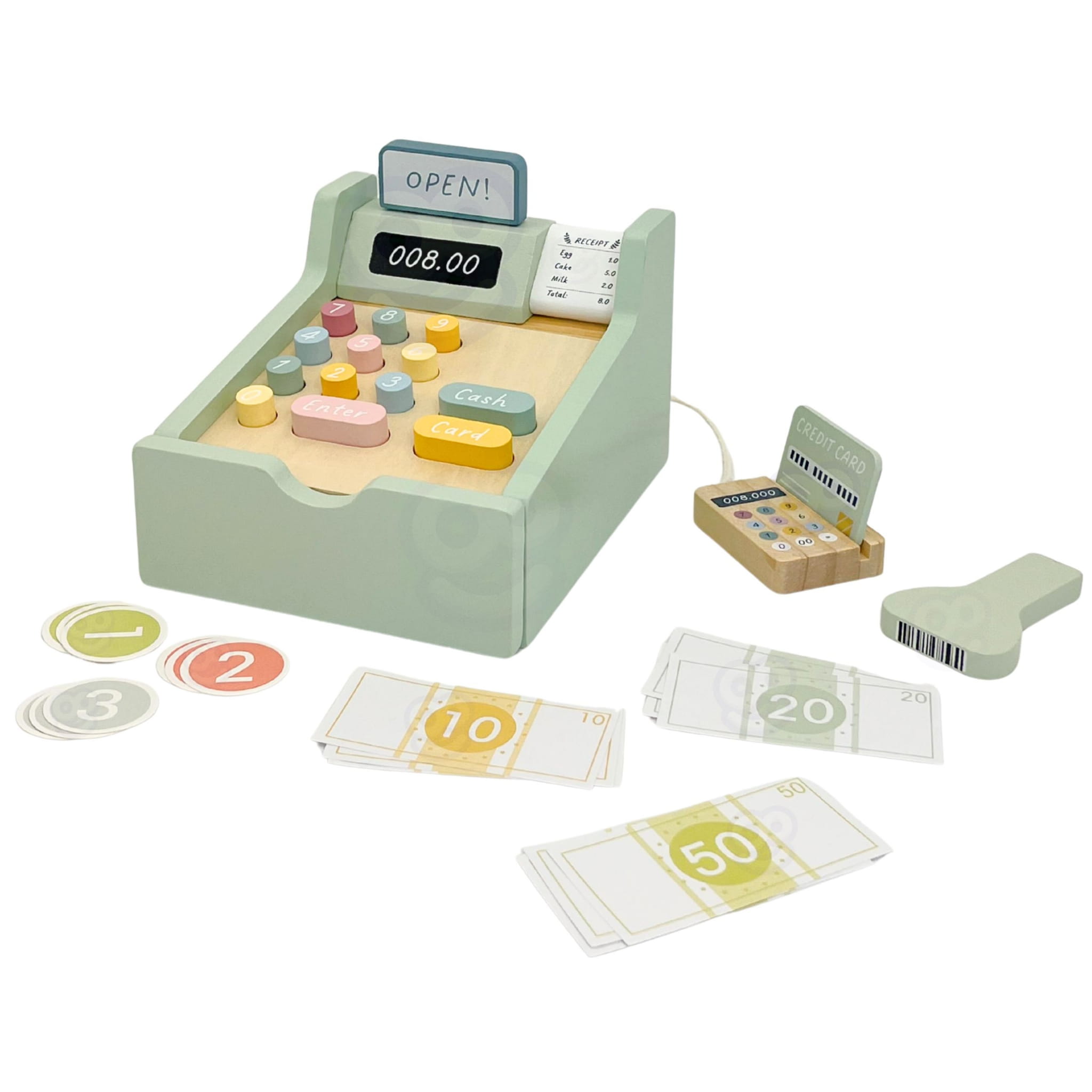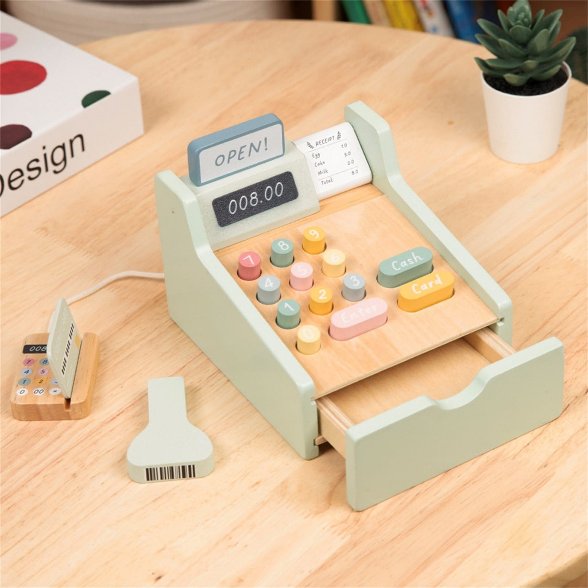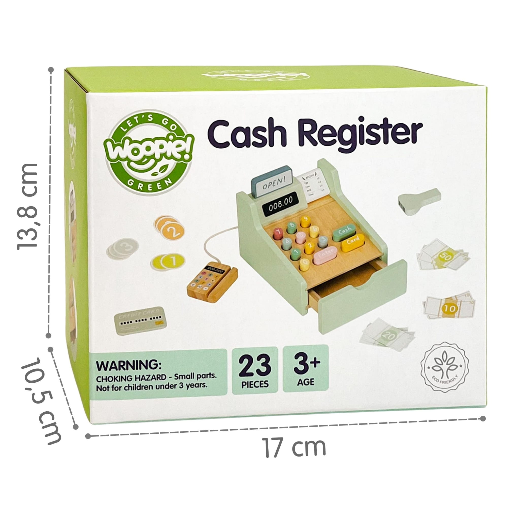 Drewniana kasa sklepowa 23 elementy rozwija kreatywność, zdolności matematyczne i motorykę małą dzieci od 3 lat. W zestawie skaner, terminal, pieniądze i karty, które zamieniają zabawę w realistyczny, edukacyjny sklep.