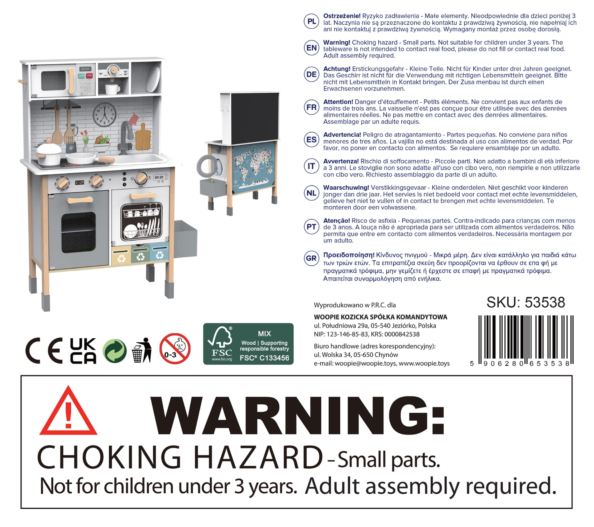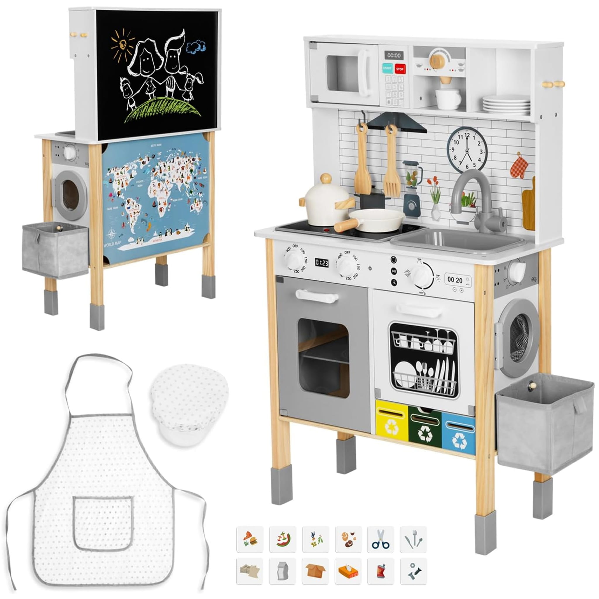 Wielofunkcyjna drewniana kuchnia z 9 strefami zabawy: gotowanie, pranie, tablica, mapa świata. Realistyczne detale i akcesoria. Dla dzieci od 3 lat.