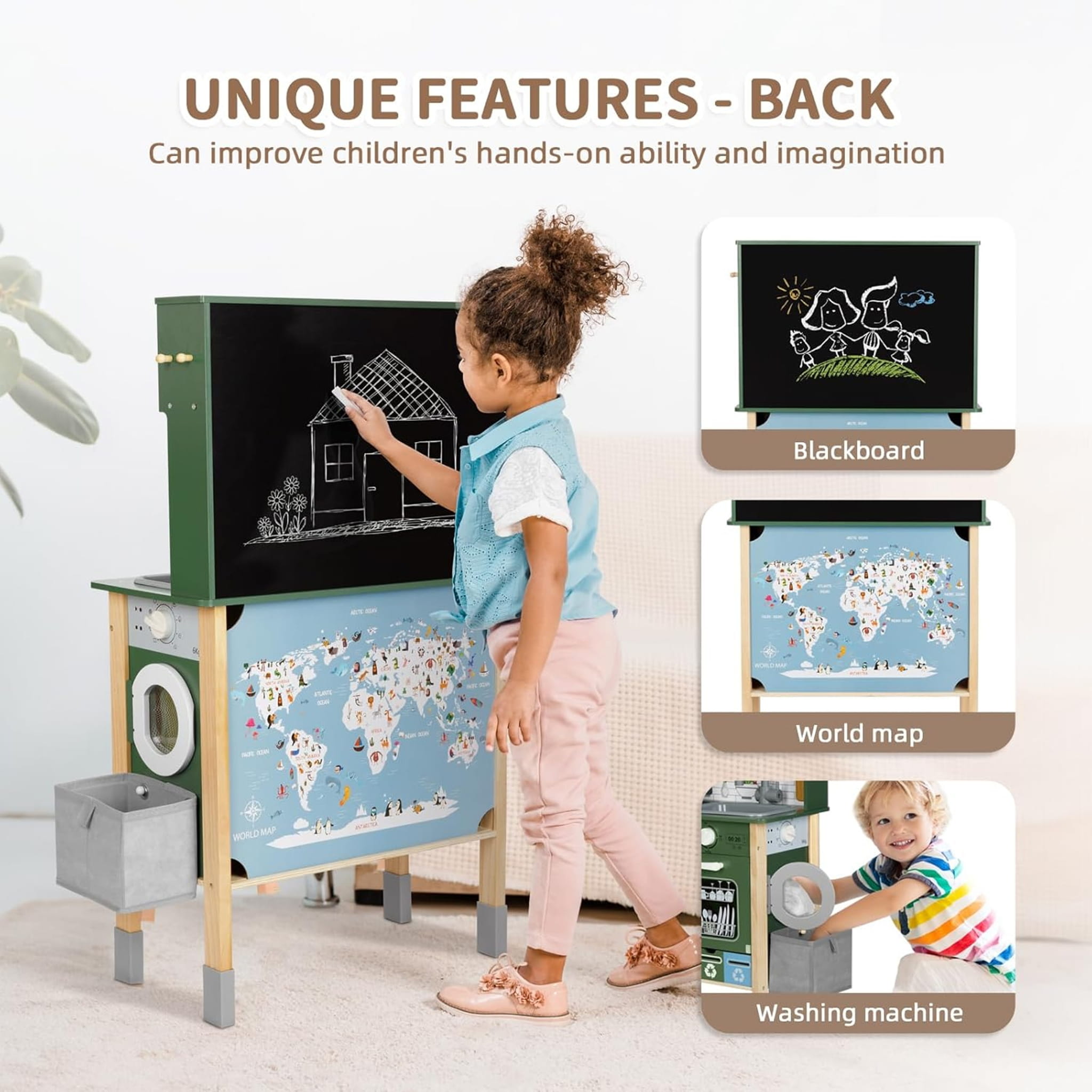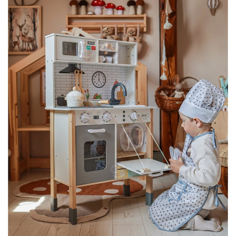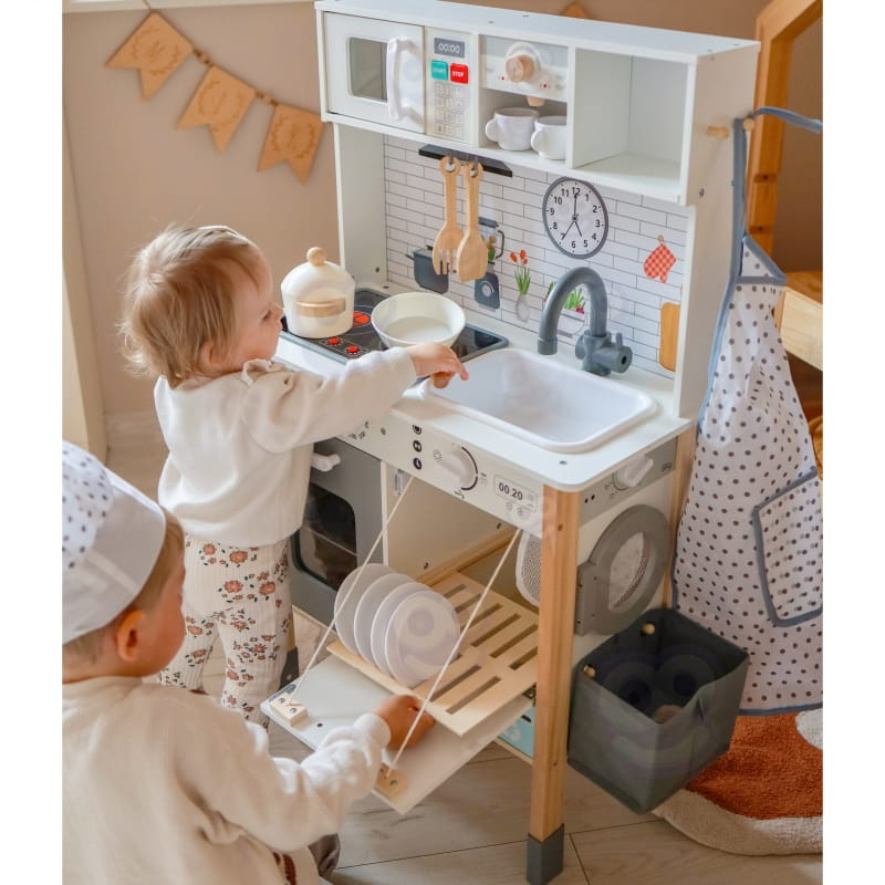 Z przodu kuchni dziecko znajdzie ekspres do kawy, zlew, mikrofalówkę z podświetleniem, piekarnik, zmywarkę i płytę indukcyjną z dźwiękiem i światłem. Z boku umieszczono pralkę z koszem na pranie, a z tyłu – tablicę kredową i kolorową mapę świata, które inspirują do nauki i rysowania.
