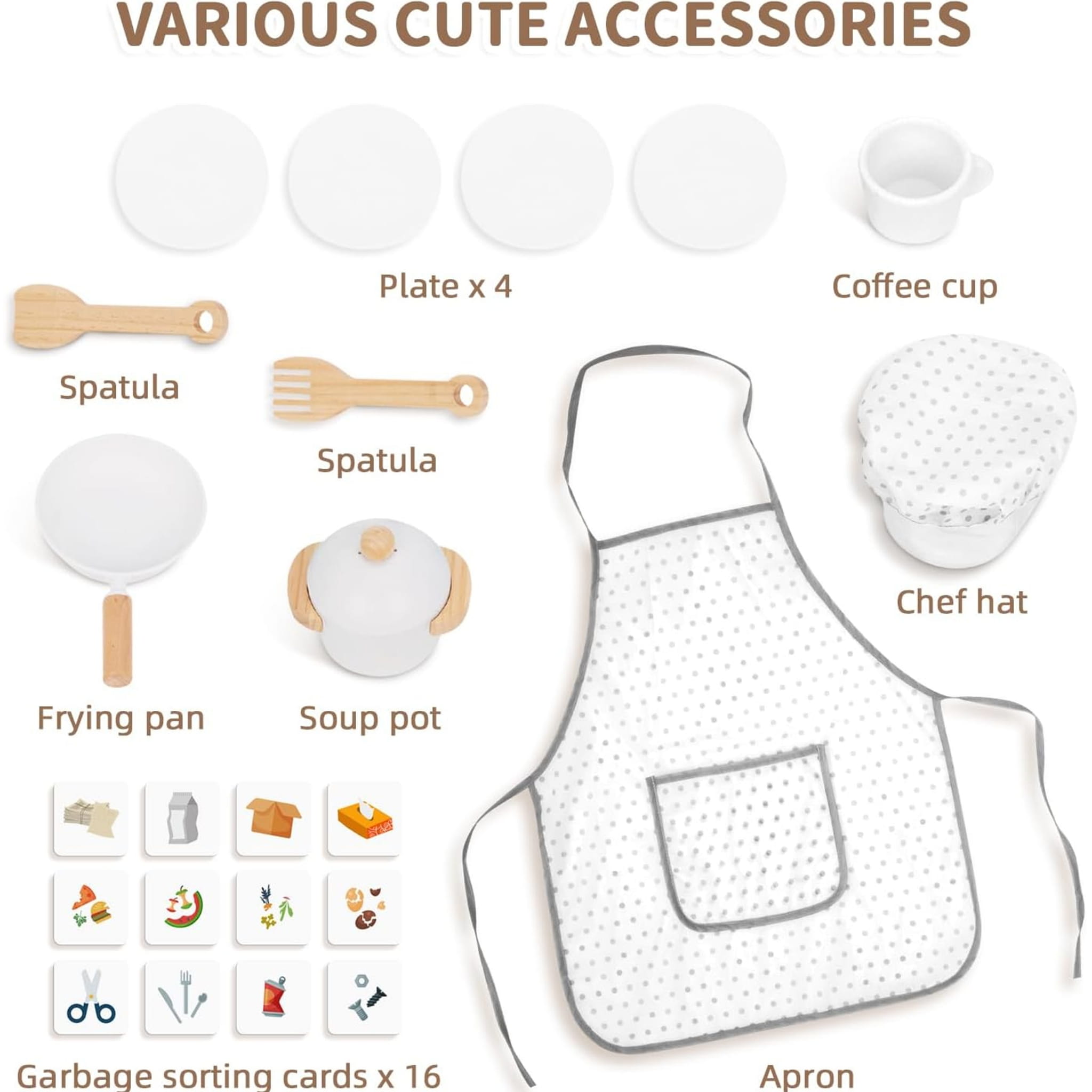 Zestaw zawiera także liczne akcesoria: talerze, kubek, garnek, patelnię, szpatułkę, widelec, fartuszek, czapkę kucharską oraz tabliczki do sortowania śmieci. Kuchnia ma regulowaną wysokość i została wykonana z bezpiecznych materiałów. Baterie nie są dołączone.