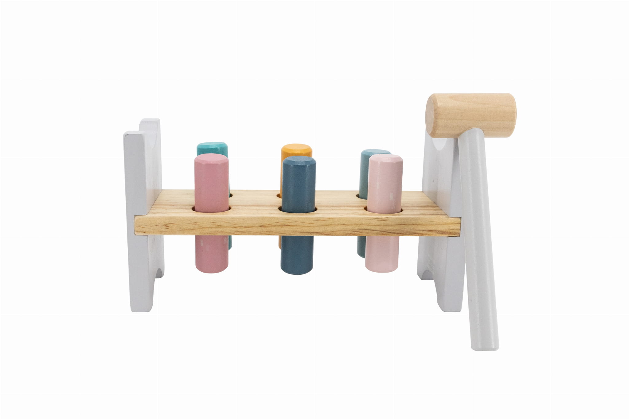 zestaw zawiera: podstawkę, 6 kolorowych kołków, drewniany młotek
