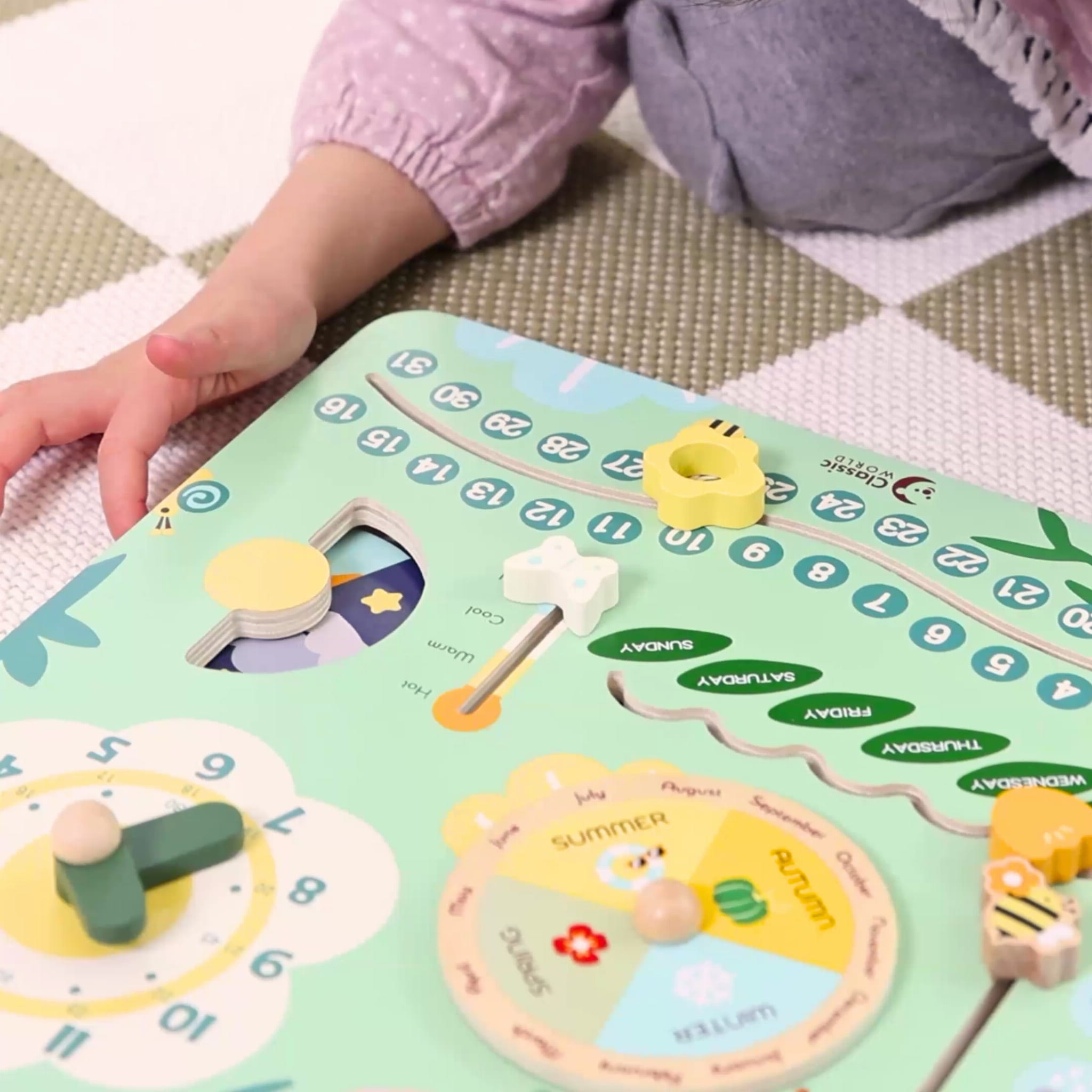 Drewniana tablica rozwija zdolności manualne, koncentrację i cierpliwość - dziecko uczy się odczytywania godzin, dni tygodnia, dat i pór roku. Może także poznawać zmieniającą się pogodę i temperaturę.