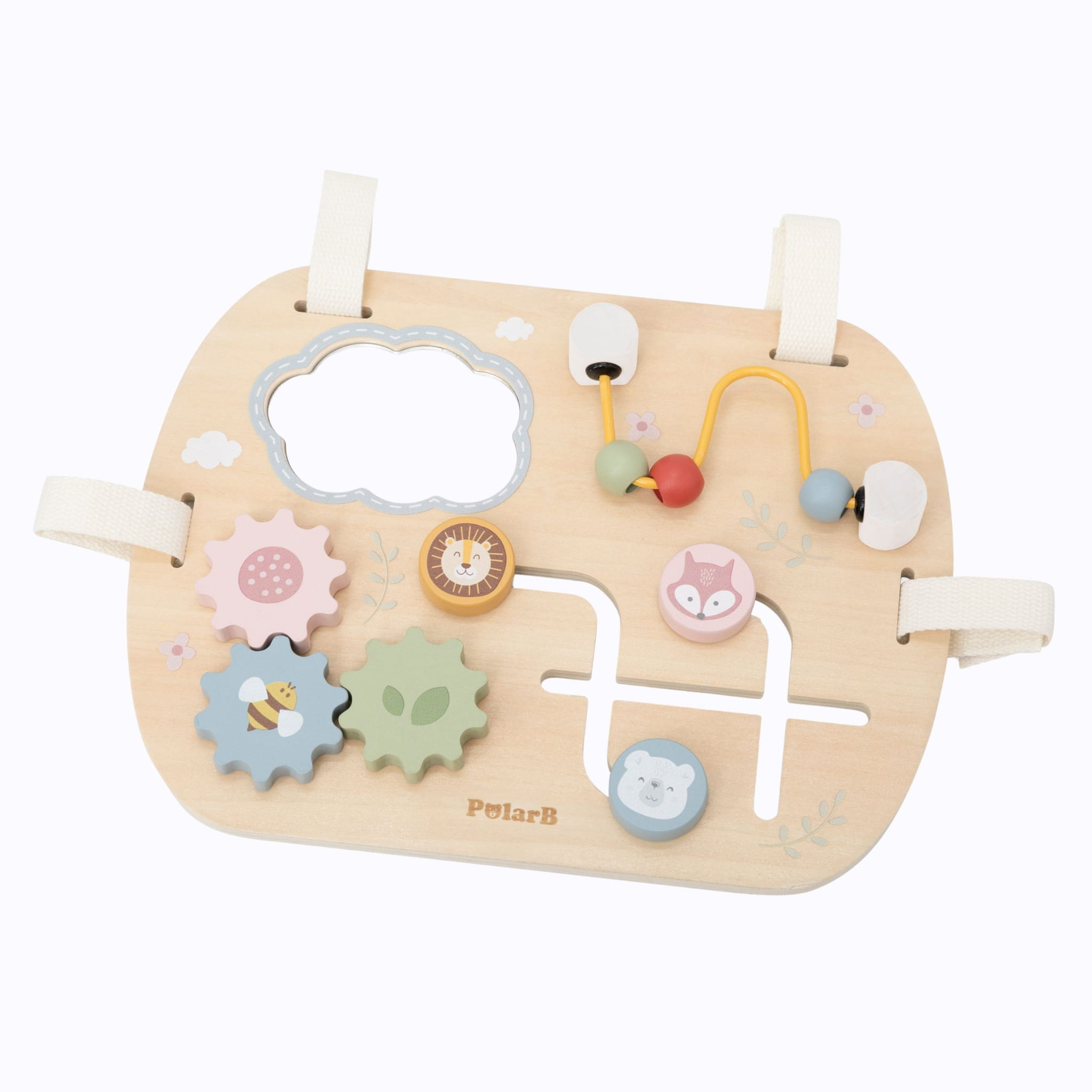 Pastelowe kolory są przyjazne dla oka i spokojne, co sprawia, że zabawa staje się przyjemnością zarówno dla dziecka, jak i rodzica. Tablicę można zamocować na łóżeczku, wózku lub ustawić na płaskiej powierzchni, co daje pełną elastyczność zabawy w domu czy w podróży.