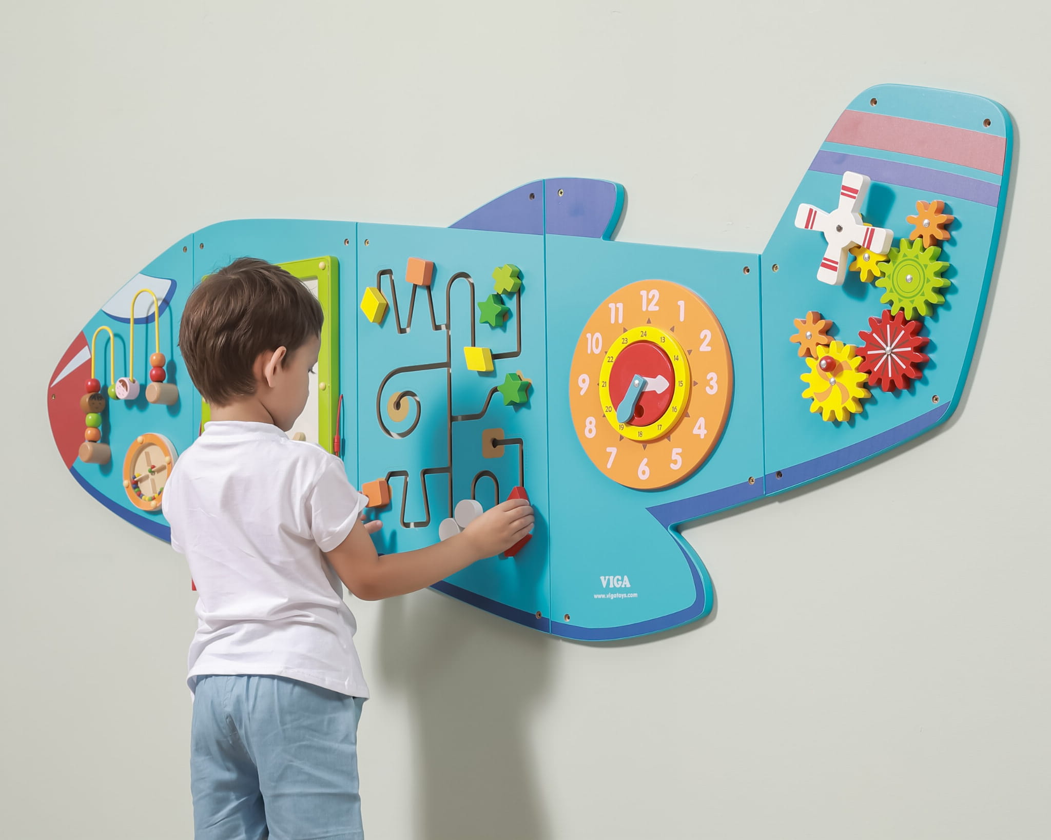 Samolot XL marki Viga to drewniana, wielofunkcyjna zabawka na ścianę. Całość składa się z 5 elementów, które w połączeniu tworzą samolot. Każdy element zapewni dzieciom inny rodzaj aktywności. Znajdziemy tutaj labirynt, przeplatankę (pętlę motoryczną), mini zjeżdżalnię, zegar z ruchomymi wskazówkami a także kolorowe, ruchome trybiki.