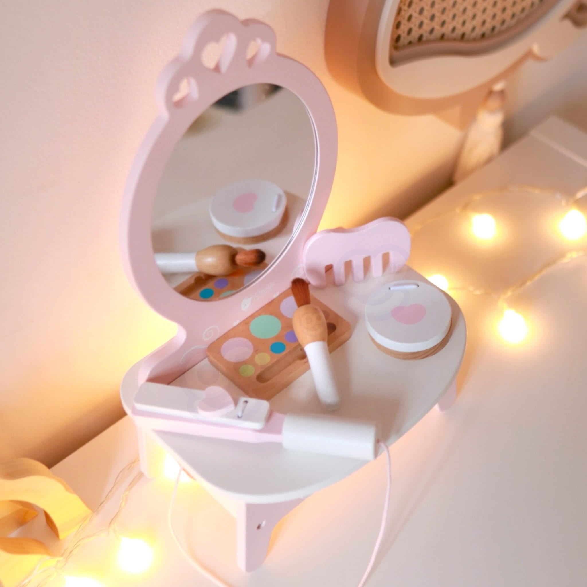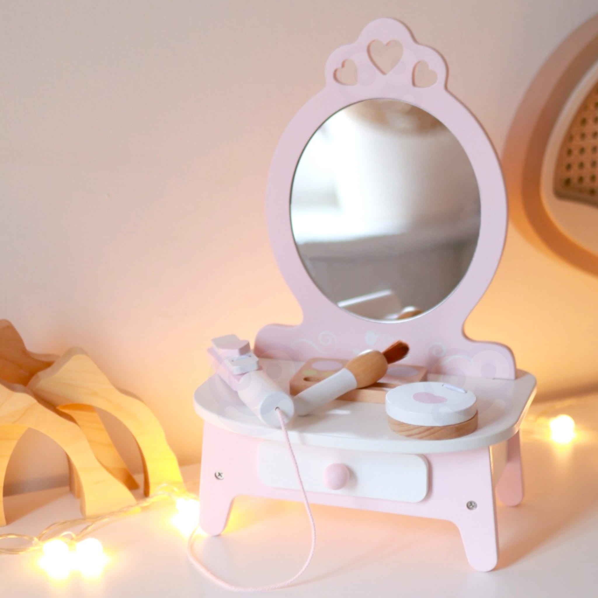 Funkcjonalna drewniana toaletka z lustrem i akcesoriami do zabawy w makijaż i stylizację włosów dla dzieci od 3 lat.