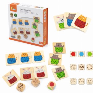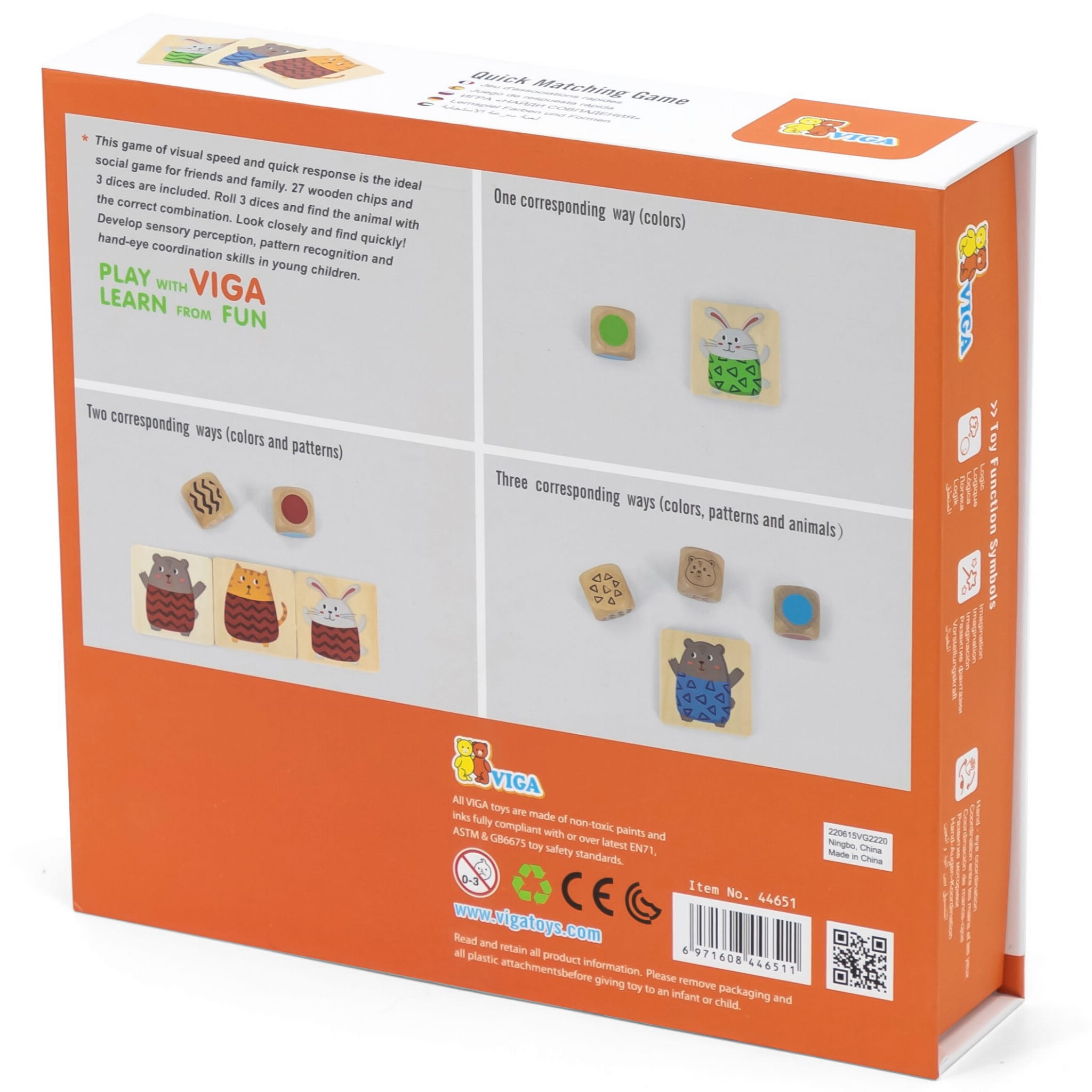Drewniana gra szybkiego odgadywania marki VIGA to idealna gra towarzyska dla przyjaciół i rodziny. Zadaniem dziecka jest rzucić wybraną ilość kostek (od 1 do 3) i znaleźć odpowiednie zwierzę z odpowiednimi wzorami na koszulce oraz w odpowiednim kolorze. Całość wykonana jest z drewna i pomalowana nietoksycznymi farbami.