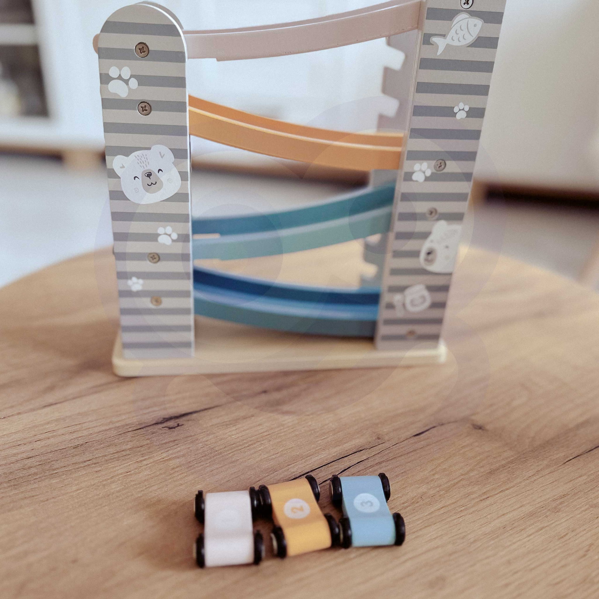 Drewniana Zjeżdżalnia Tor Wyścigowy z Samochodzikami Montessori dla Dzieci 18m+