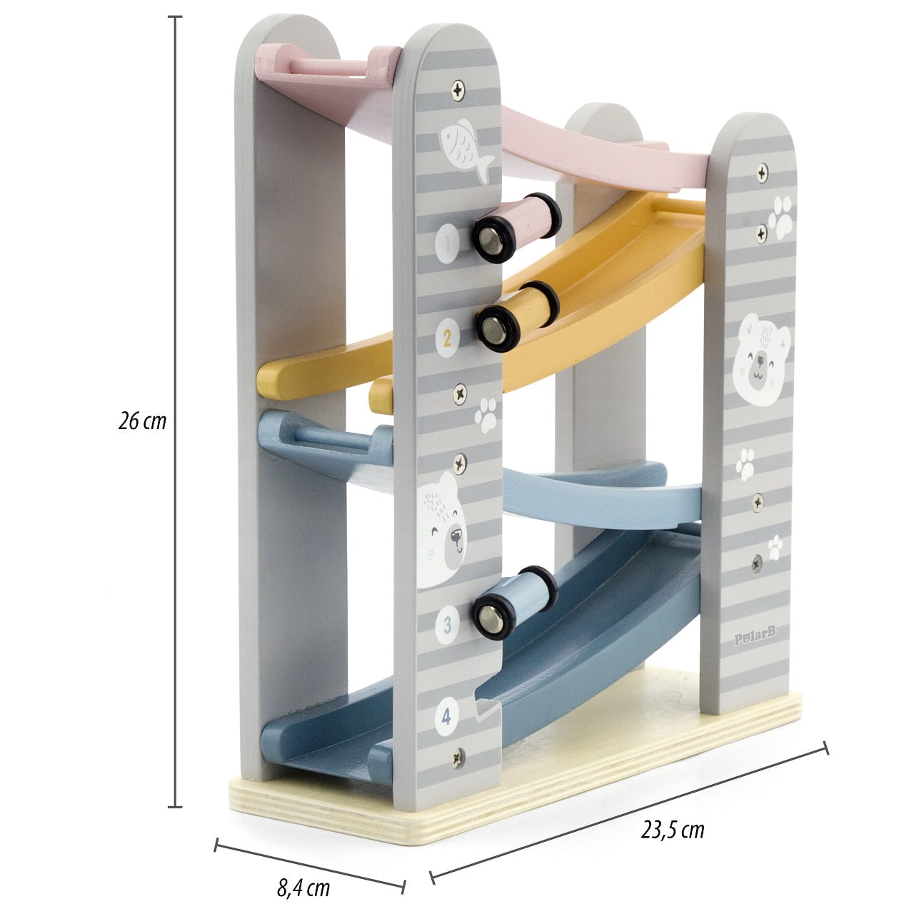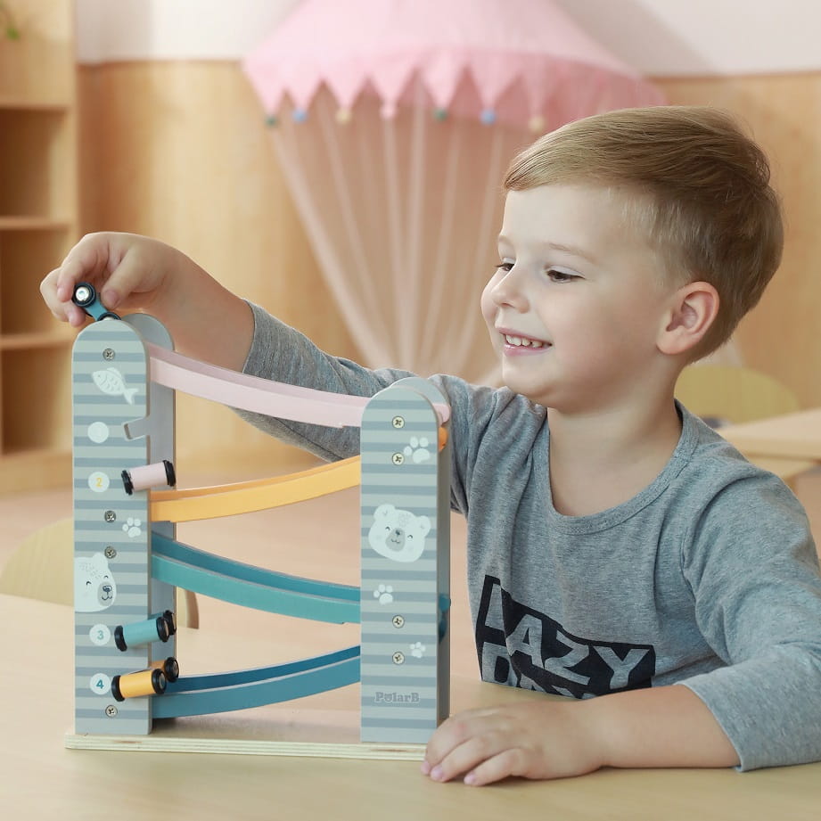 Niech każde dziecko poczuje emocje prawdziwego wyścigu dzięki drewnianej zjeżdżalni Montessori. Zabawa samochodzikami po torze łączy radość z nauką, wspiera rozwój zdolności manualnych i koordynację ruchową.