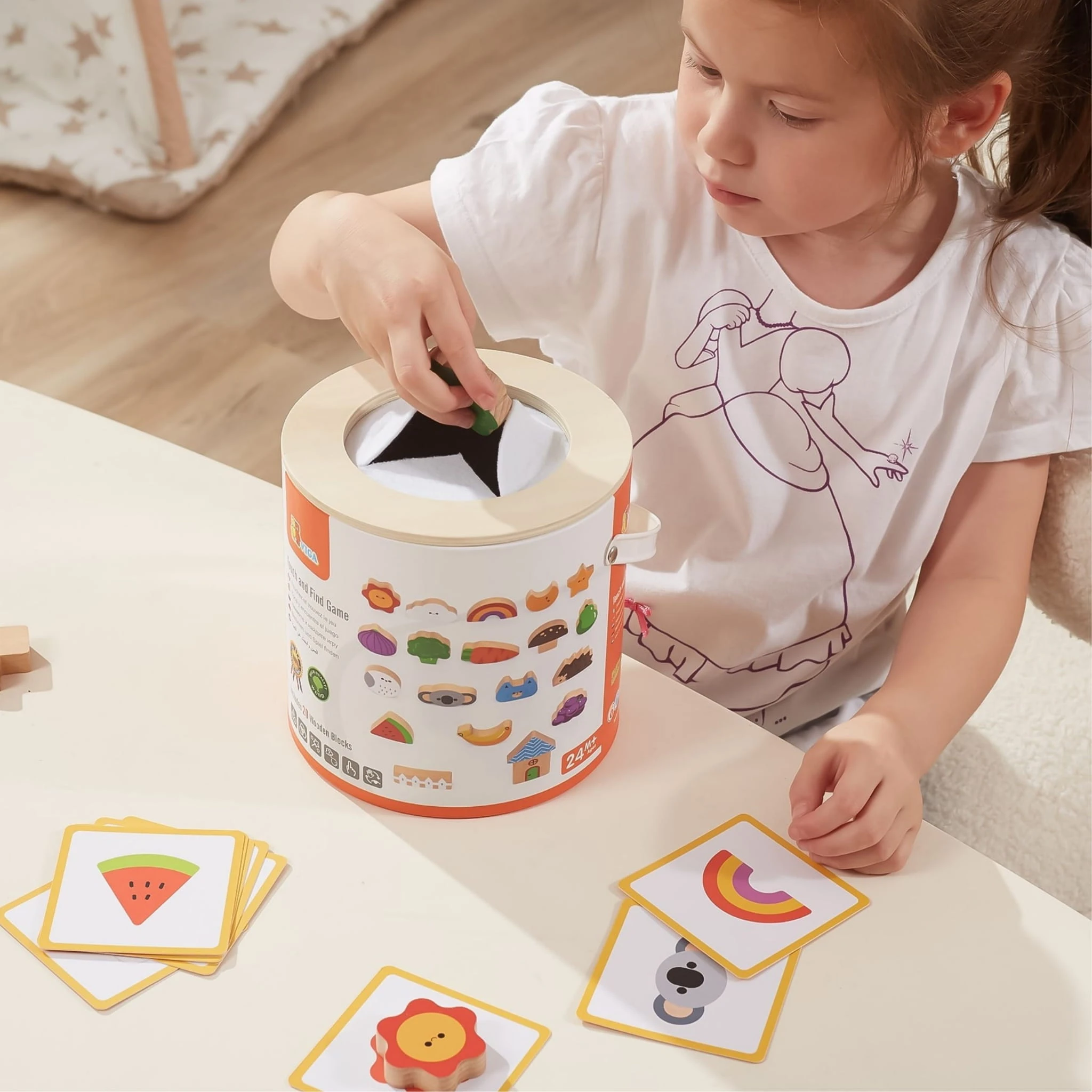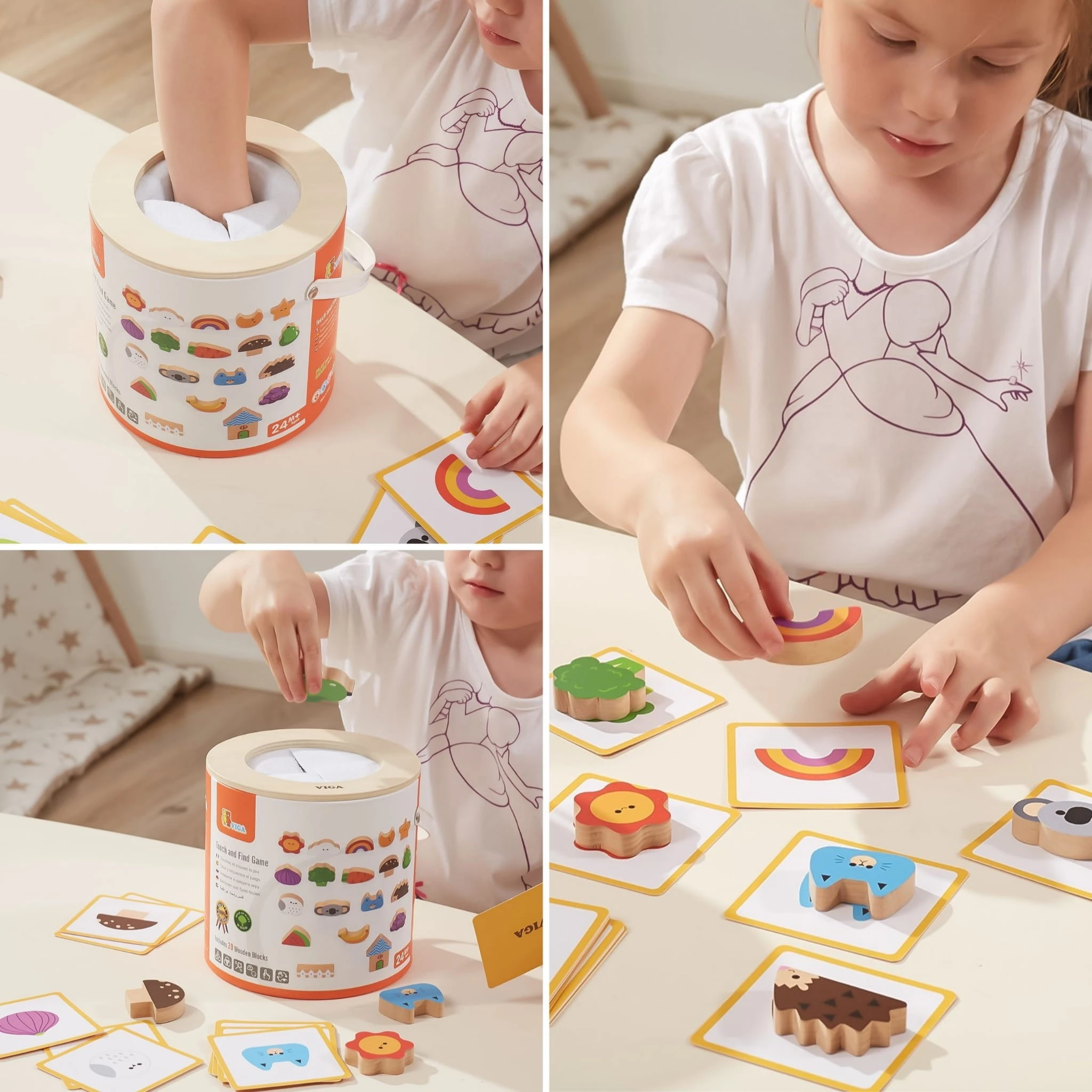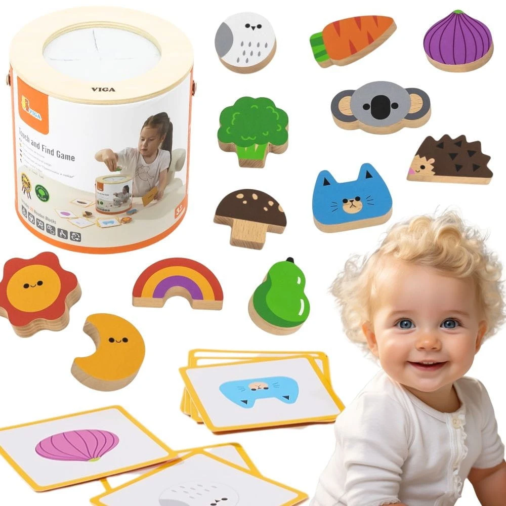 Zestaw zachęca do losowania i dopasowywania drewnianych elementów bez patrzenia, co sprawia, że dziecko uczy się rozpoznawania kształtów, kolorów i struktur wyłącznie za pomocą zmysłu dotyku.