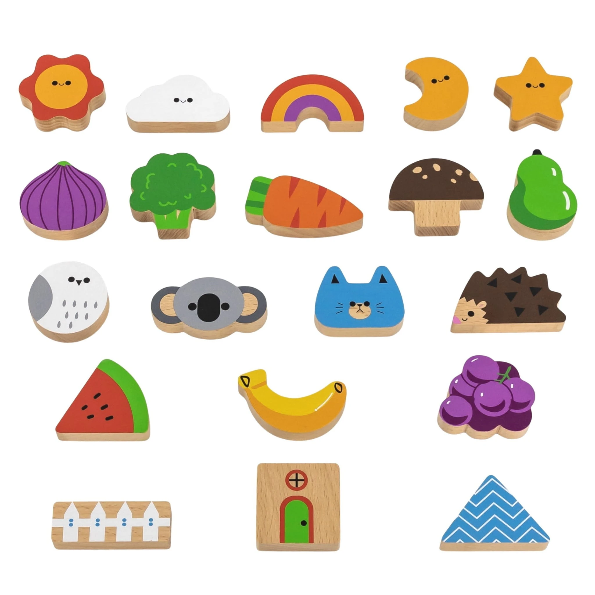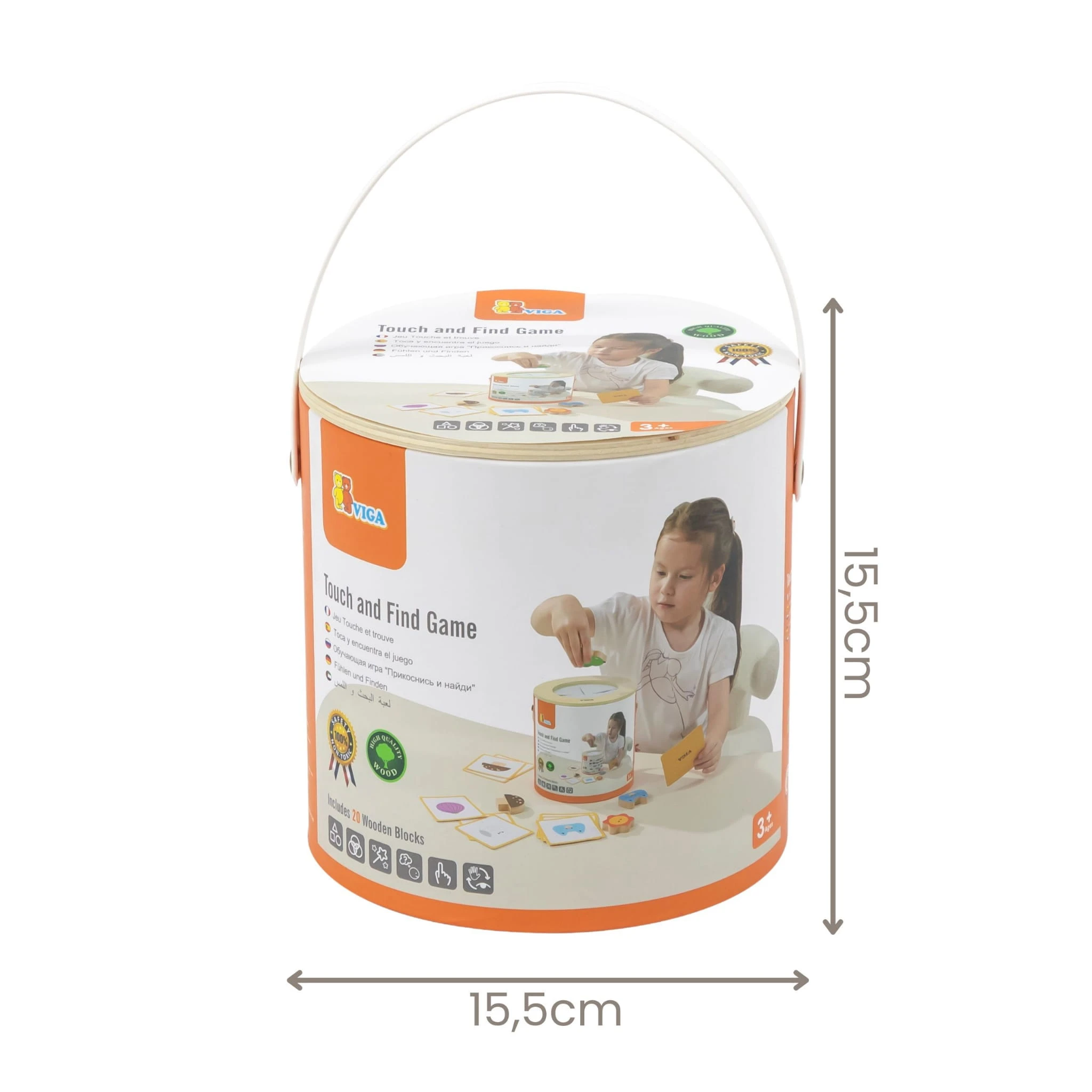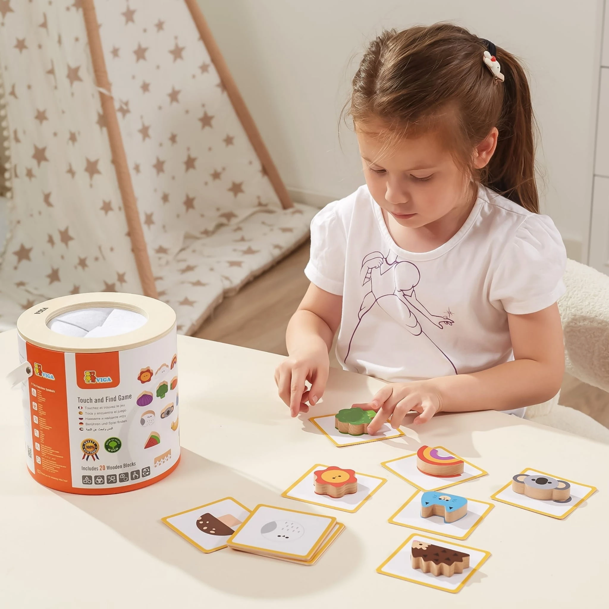 Zestaw zachęca do losowania i dopasowywania drewnianych elementów bez patrzenia, co sprawia, że dziecko uczy się rozpoznawania kształtów, kolorów i struktur wyłącznie za pomocą zmysłu dotyku.