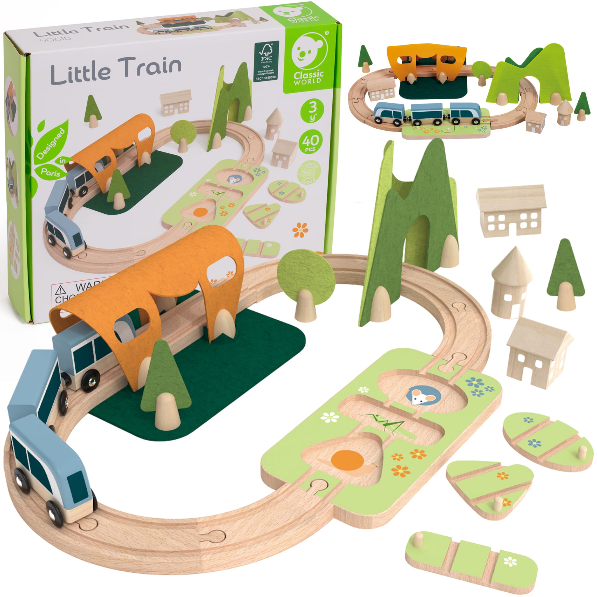 Duża drewniana kolejka z torem, pociągiem i sorterem kształtów (40 el.) to kreatywny zestaw dla dziecka od 3 lat. Łączy budowanie, dopasowywanie i swobodną zabawę w podróż.