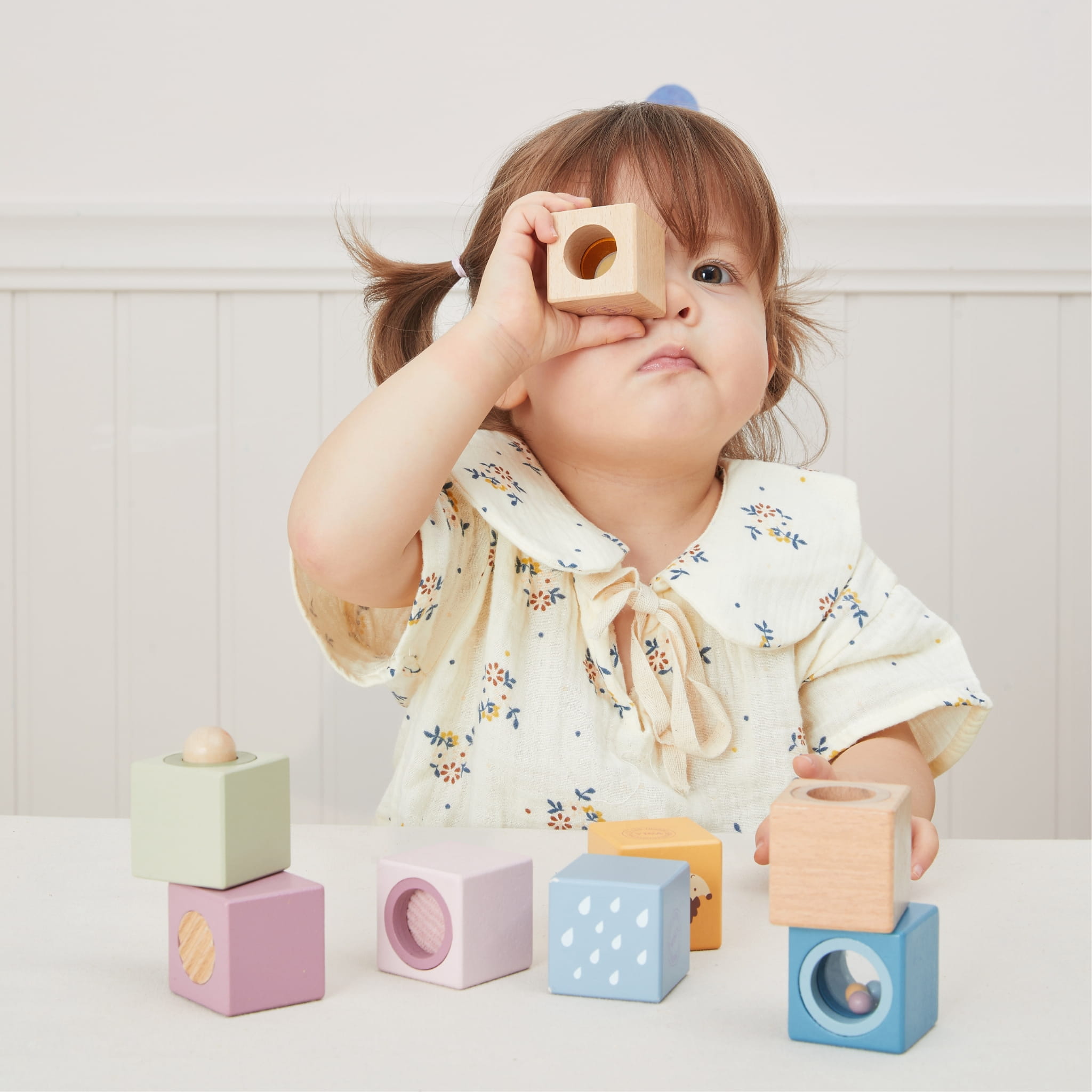 Dziecko może układać, balansować i dopasowywać klocki, co rozwija zdolności manualne, motorykę małą, a także kreatywność i wyobraźnię. Klocki wspierają także naukę zależności przyczynowo-skutkowych oraz stymulują poznawczo zmysł dotyku, wzroku i słuchu. Dzięki pastelowej kolorystyce zestaw jest estetyczny i przyjazny dla oka.