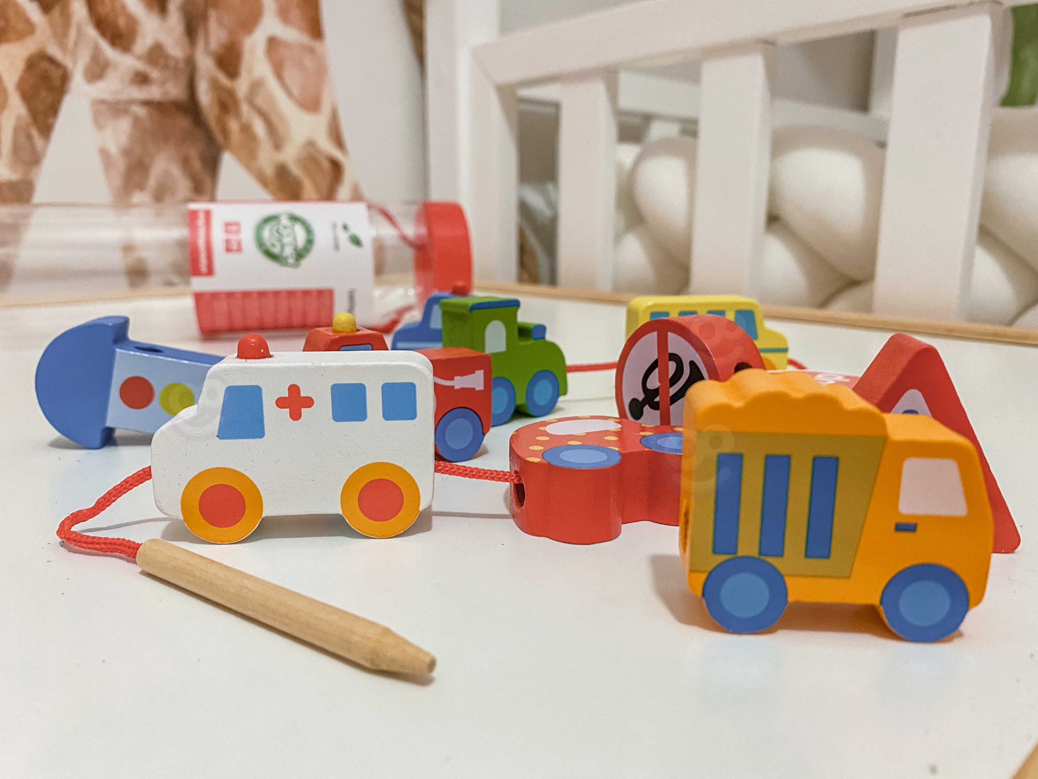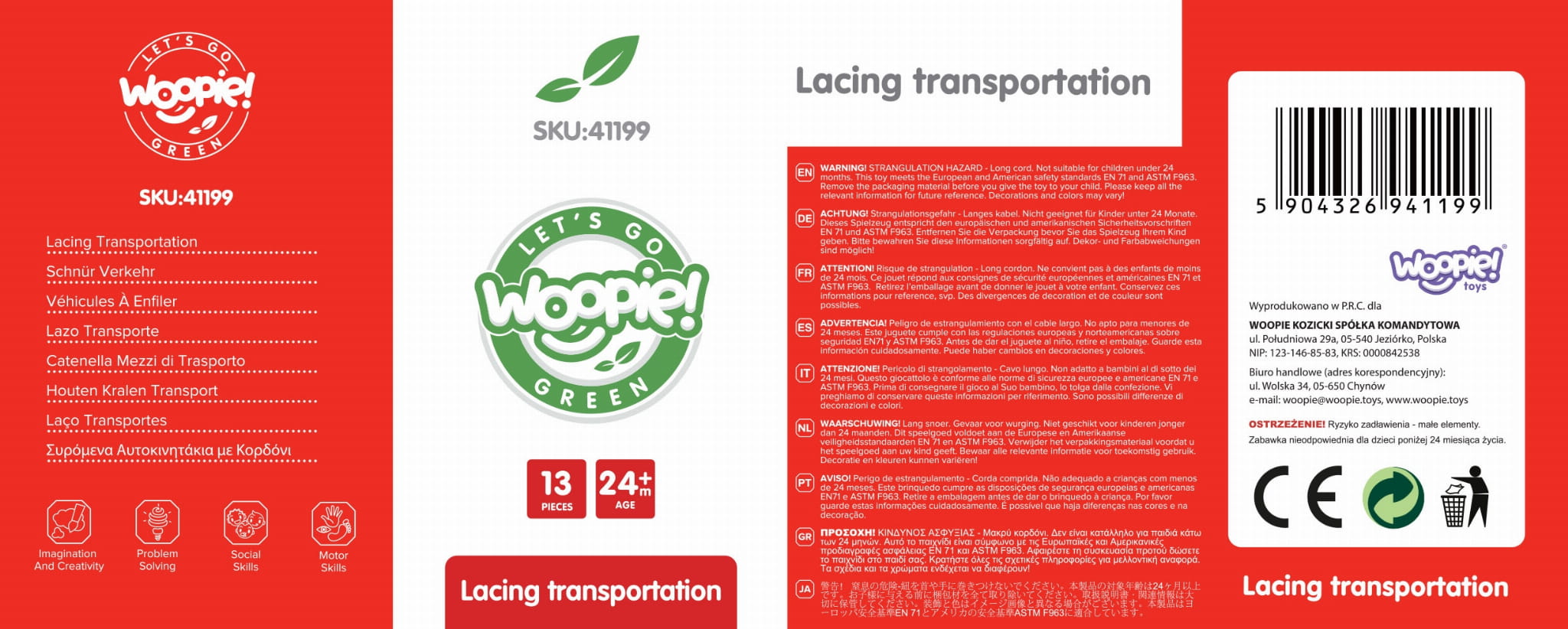 Klocki Koraliki Do Nawlekania Pojazdy Samochody od marki WOOPIE z serii GREEN to idealna zabawka do rozwijania umiejętności manualnych dziecka. Przeplatanka dla dzieci utrzymana została w motywie pojazdów. Nawlekanka to klasyczny zestaw drewnianych klocków z dziurkami, przez które dziecko przeplata sznureczek. Jest to świetna zabawa, która pobudza obszary w mózgu i rozwija zdolności manualne tzw. "małą motorykę", koordynację ręka-oko, wspomaga koncentrację oraz wzbudza ciekawość dziecka na temat pojazdów i znaków drogowych!
