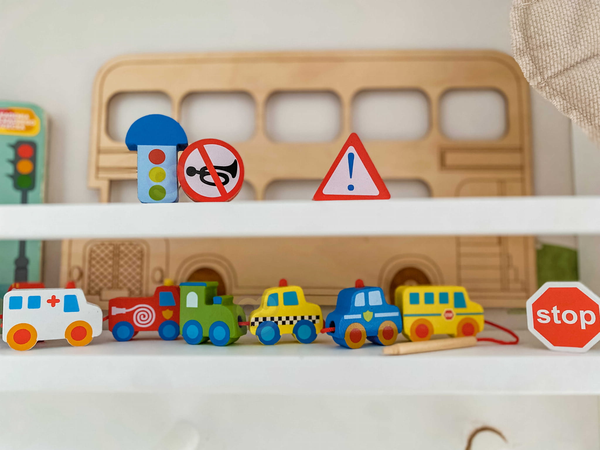 - - zestaw składa się ze sznureczka oraz 12 klocków przedstawiających różne pojazdy, m.in.: straż pożarną, karetkę, traktor, samochody osobowe oraz znaki drogowe