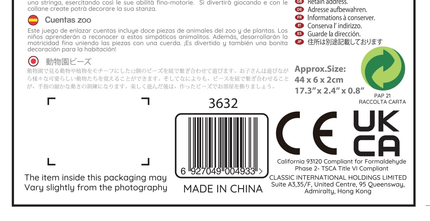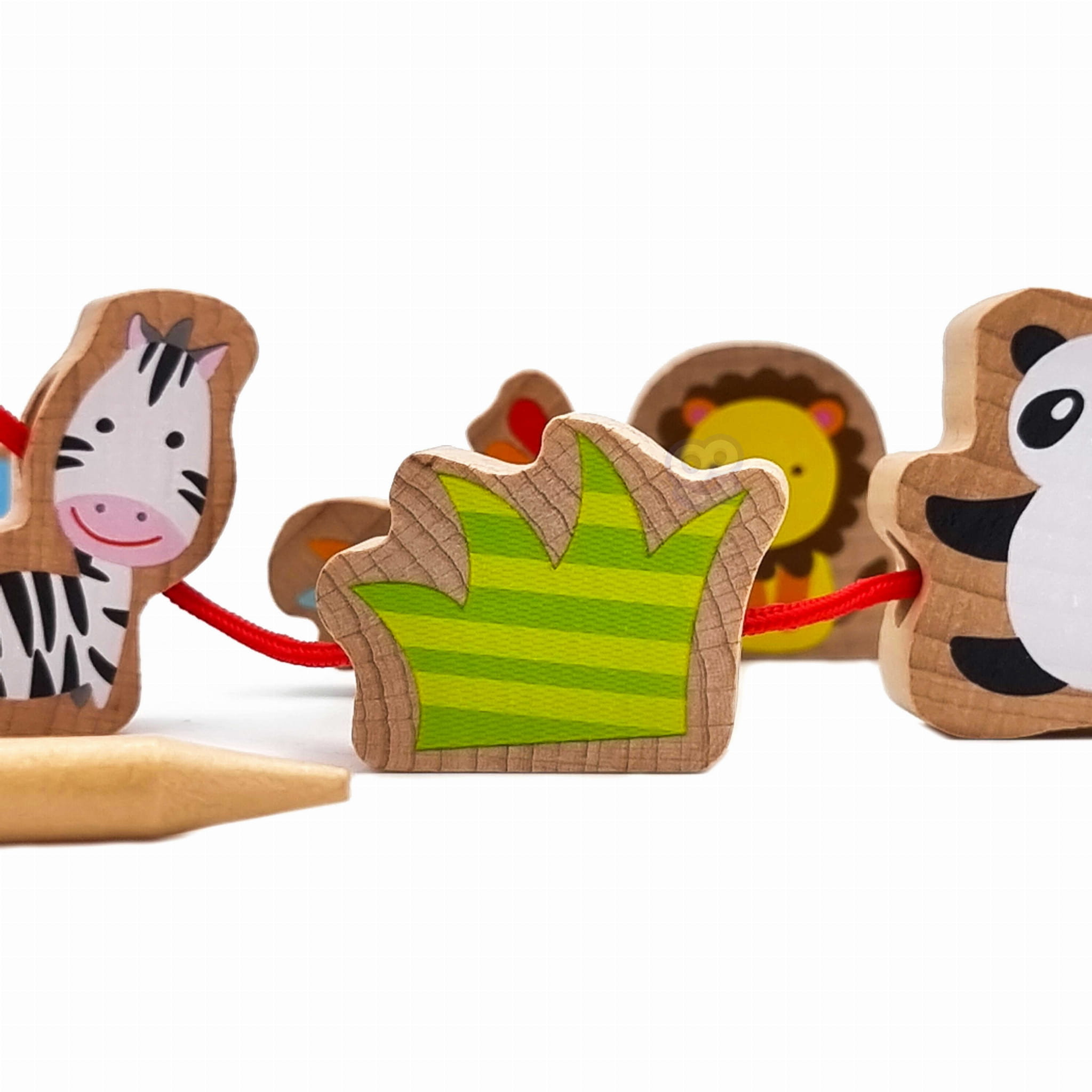 Drewniana sznurowanka ZOO marki Classic World to świetna zabawka dla dzieci, która pozwoli maluchom na rozwinięcie swojej zręczności, precyzji oraz koordynacji wzrokowo-ruchowej, pozwala poznać różne gatunki zwierząt zamieszkujących ZOO. Drewniane klocki do nawlekania na sznureczek posiadają kształty i motywy związane ze zwierzątkami z ZOO. Zadaniem dziecka jest nawlekanie koralików o różnych kształtach na sznureczek. Zabawka składa się z 12 klocków przedstawiających pandę, lwa, żyrafę, krokodyla, oraz inne elementy scenerii ZOO. Zabawka uczy również cierpliwości, oraz determinacji, gdyż nawleczenie wszystkich elementów na pewno pochłonie malucha bez reszty na wiele godzin.