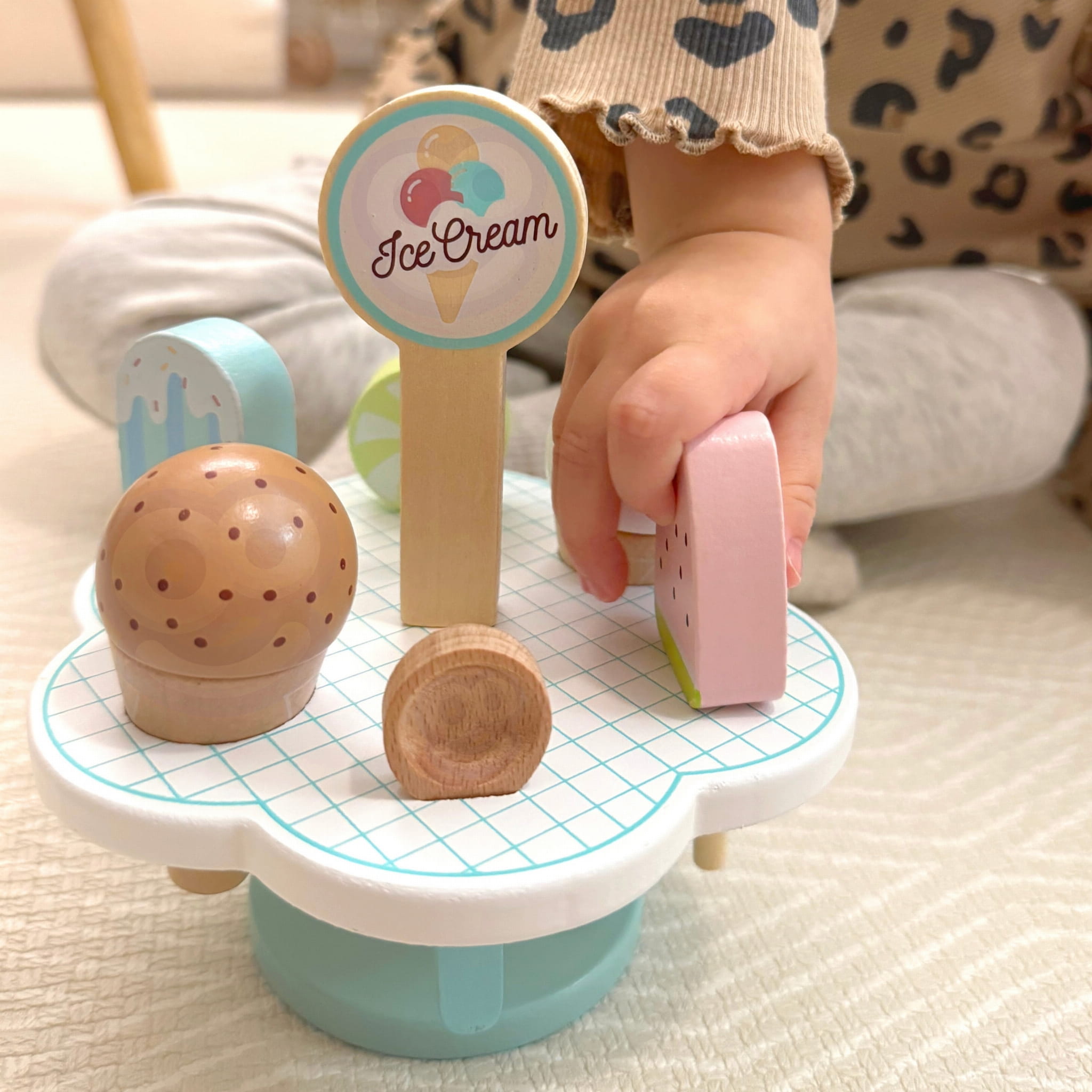 Drewniany zestaw magnetycznych lodów na stojaku to kreatywna zabawka dla dzieci, rozwijająca wyobraźnię, zdolności manualne i zabawę w rolę sprzedawcy lub kucharza.