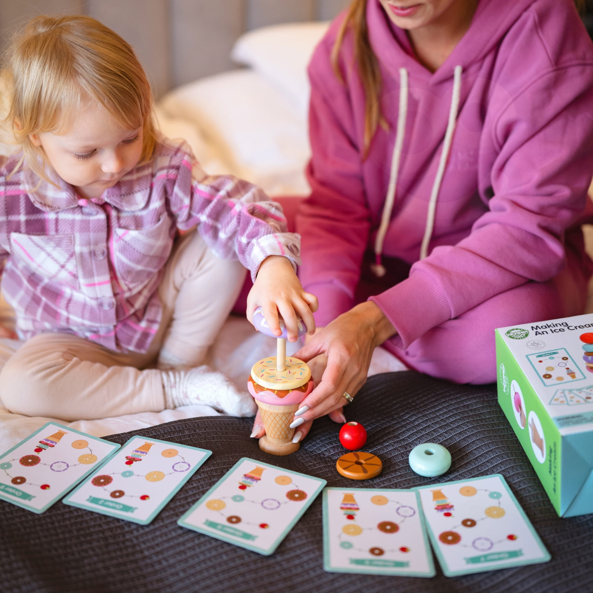 Edukacyjna układanka Montessori dla dzieci od 3 lat – rozwija motorykę, kreatywność i koncentrację poprzez tworzenie kolorowych lodów według wzorów lub własnej wyobraźni.