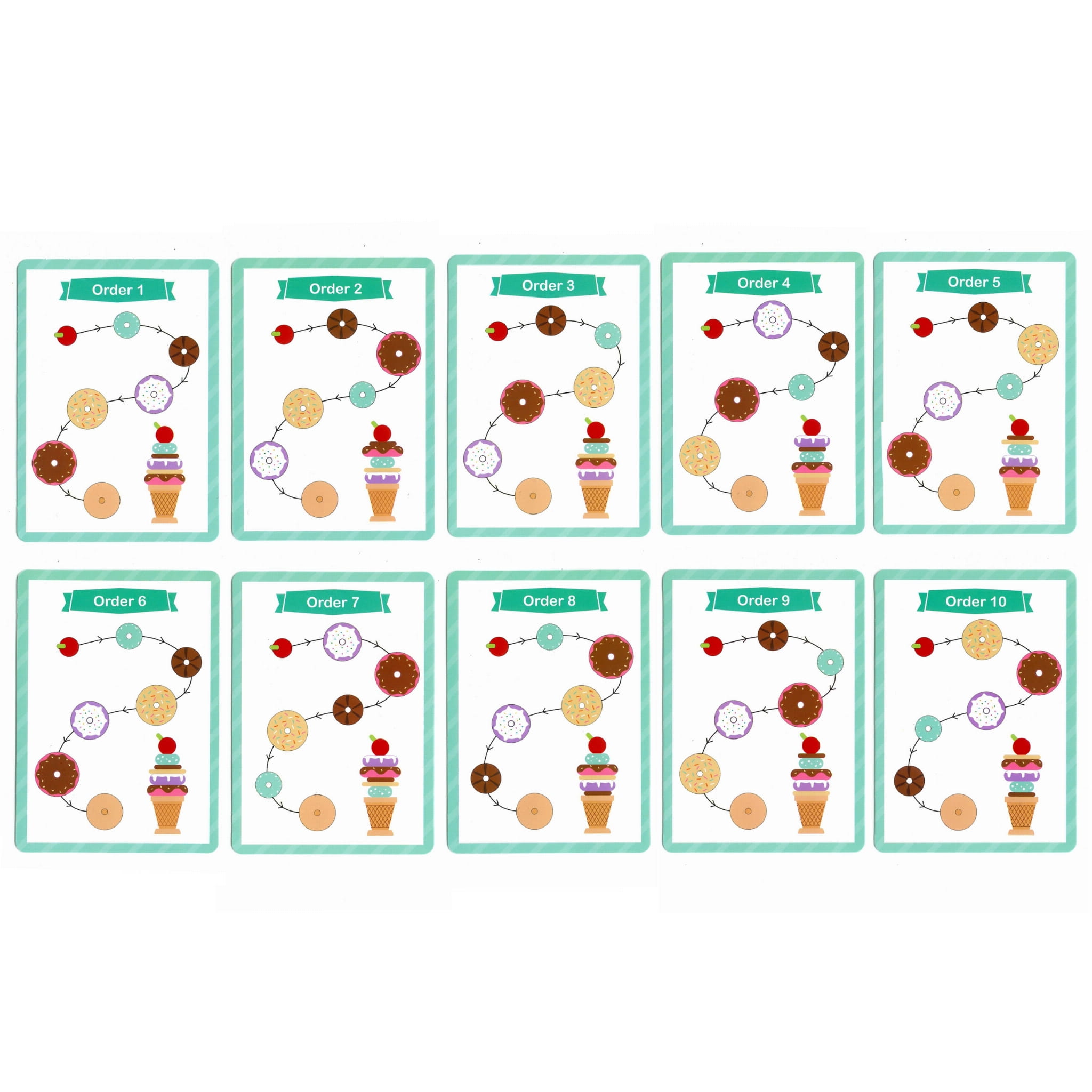 Zestaw zawiera 12 drewnianych elementów: wafel, 6 kolorowych gałek lodów oraz 5 kart z 10 różnymi wzorami. Dziecko może odtwarzać lody według wzorów lub tworzyć własne kombinacje, ćwicząc przy tym precyzję, pamięć i zdolność koncentracji. Zabawa w „małego kucharza” rozwija wyobraźnię i daje satysfakcję z samodzielnego tworzenia.
