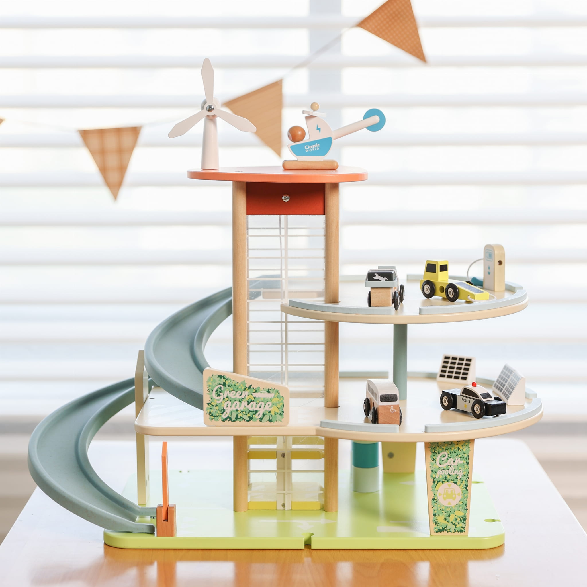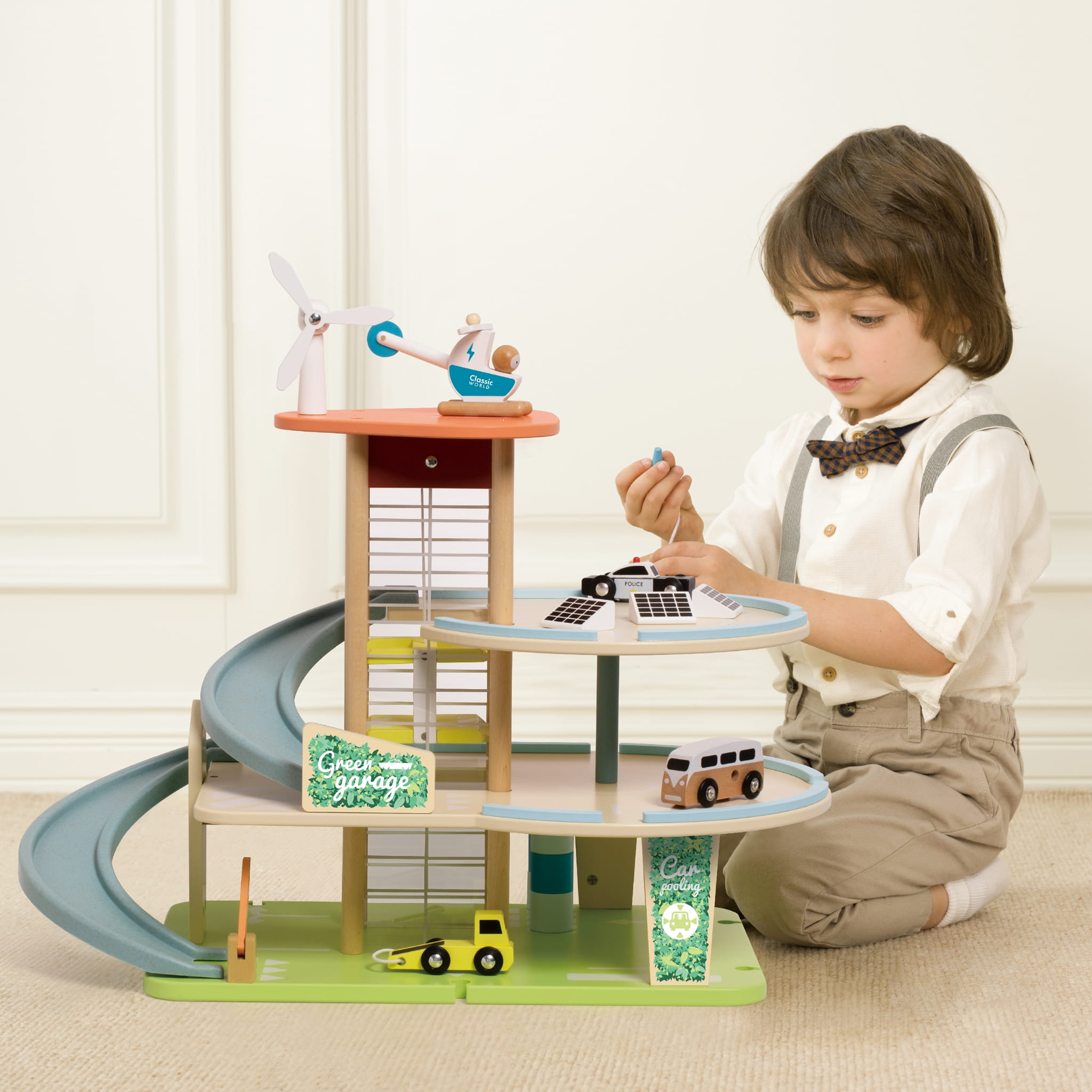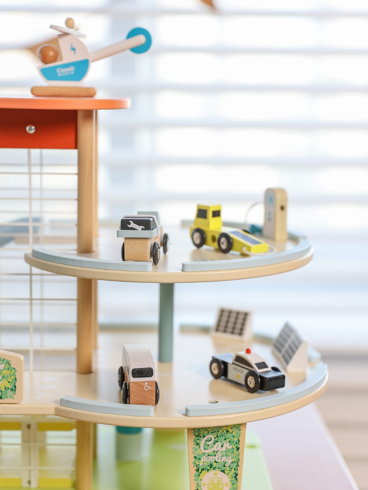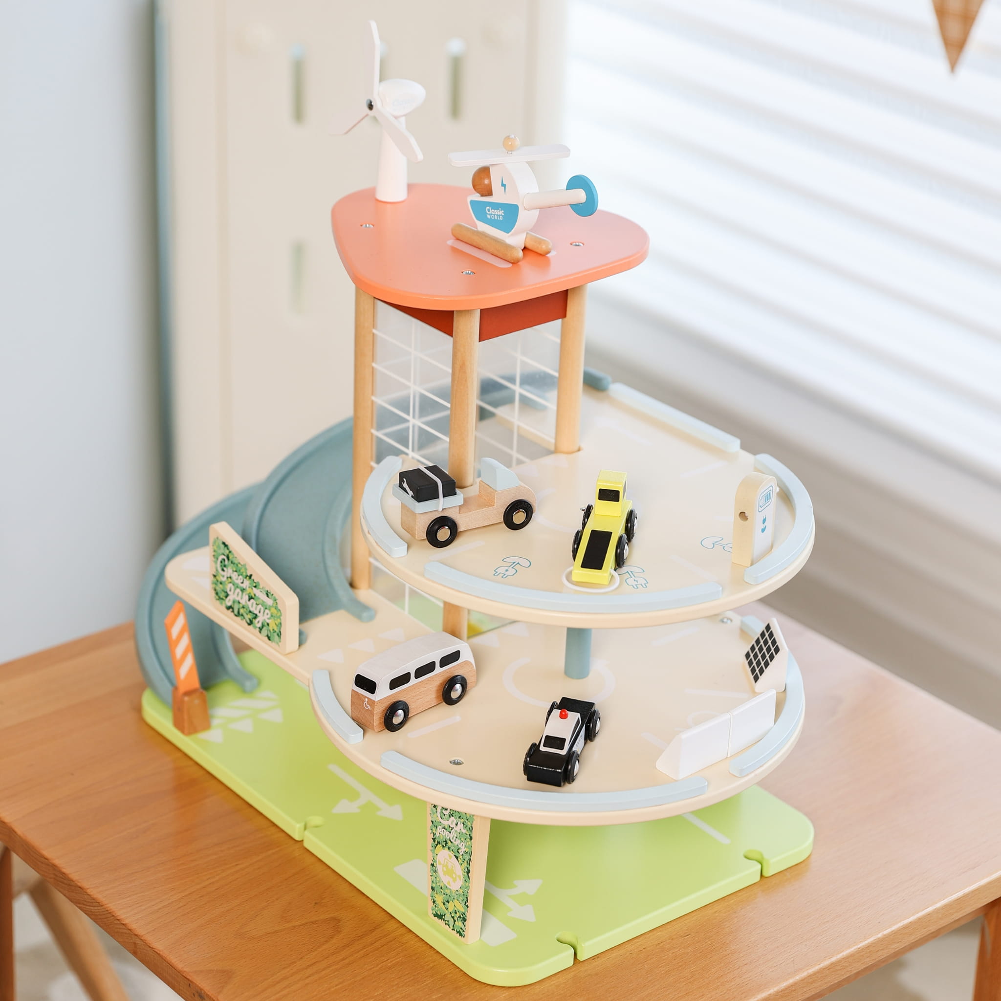 Wielopoziomowy drewniany garaż z windą, stacją ładowania i helikopterem dla dzieci od 3 lat.