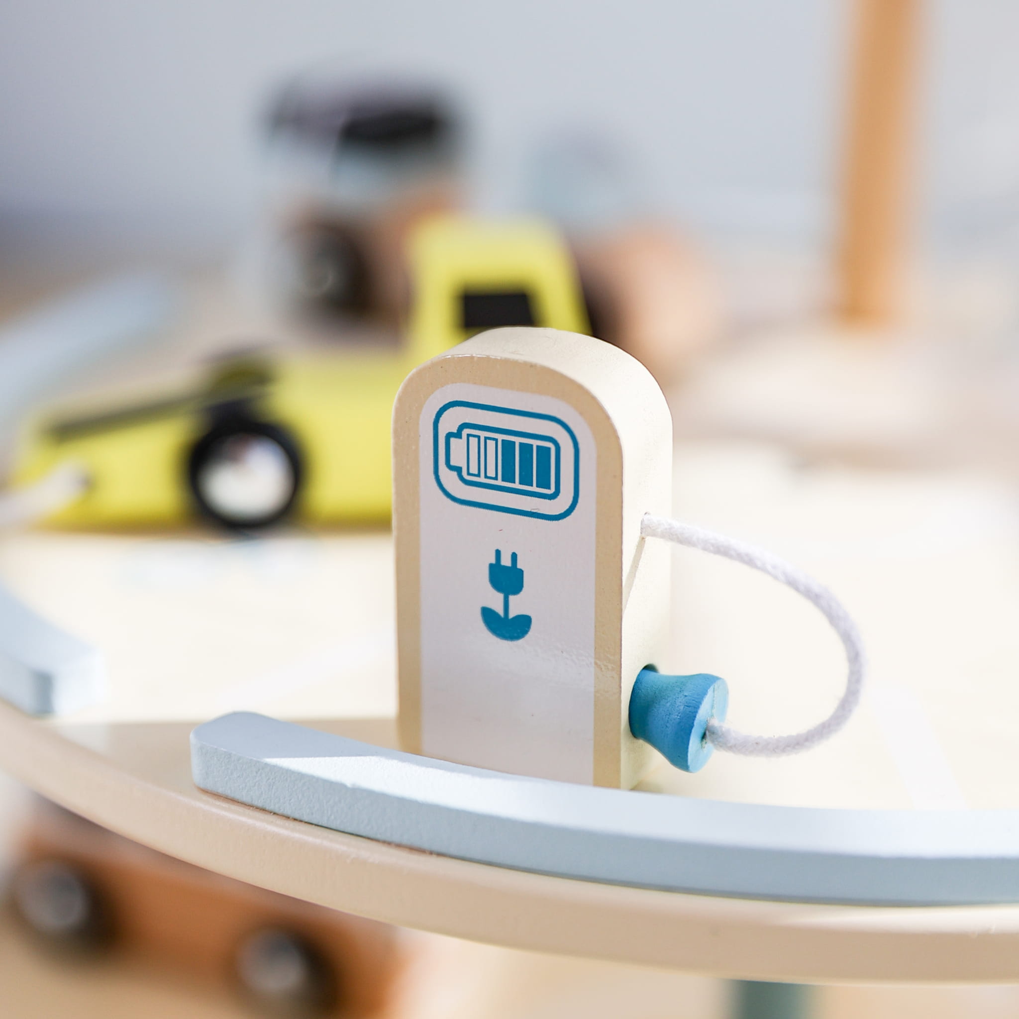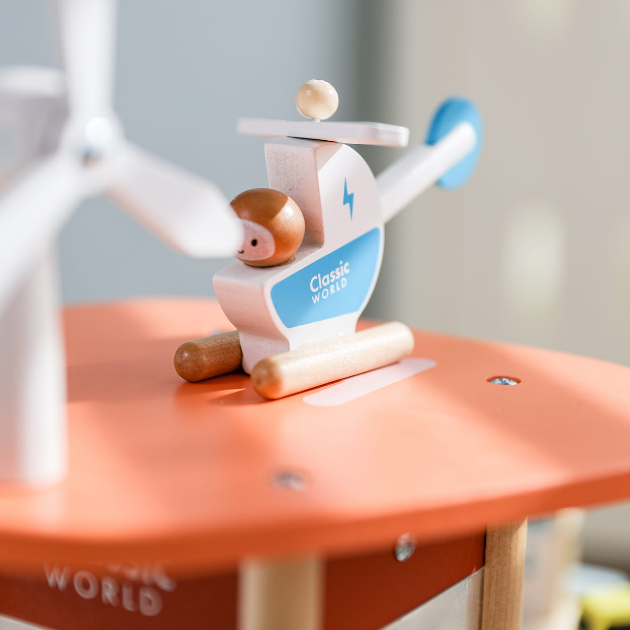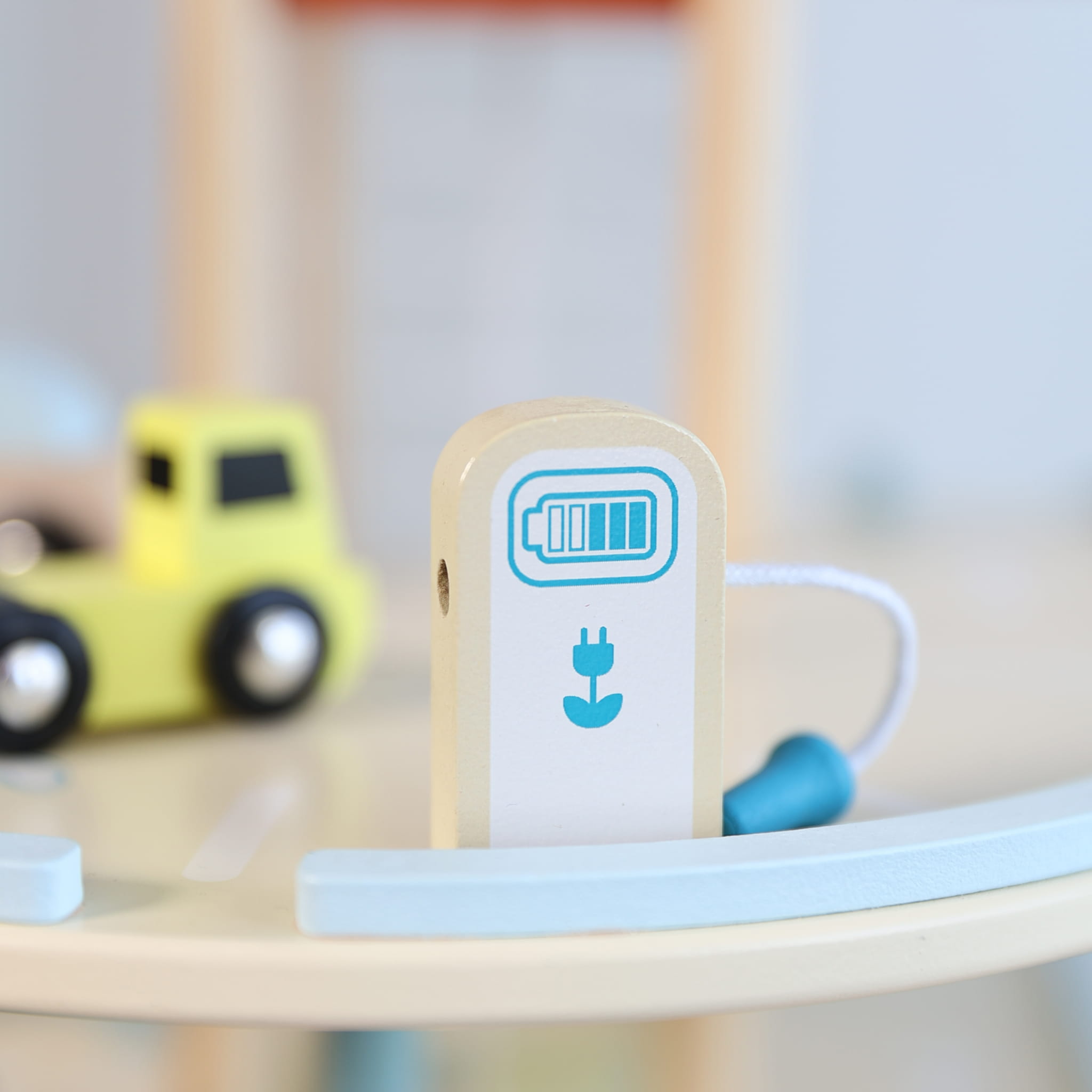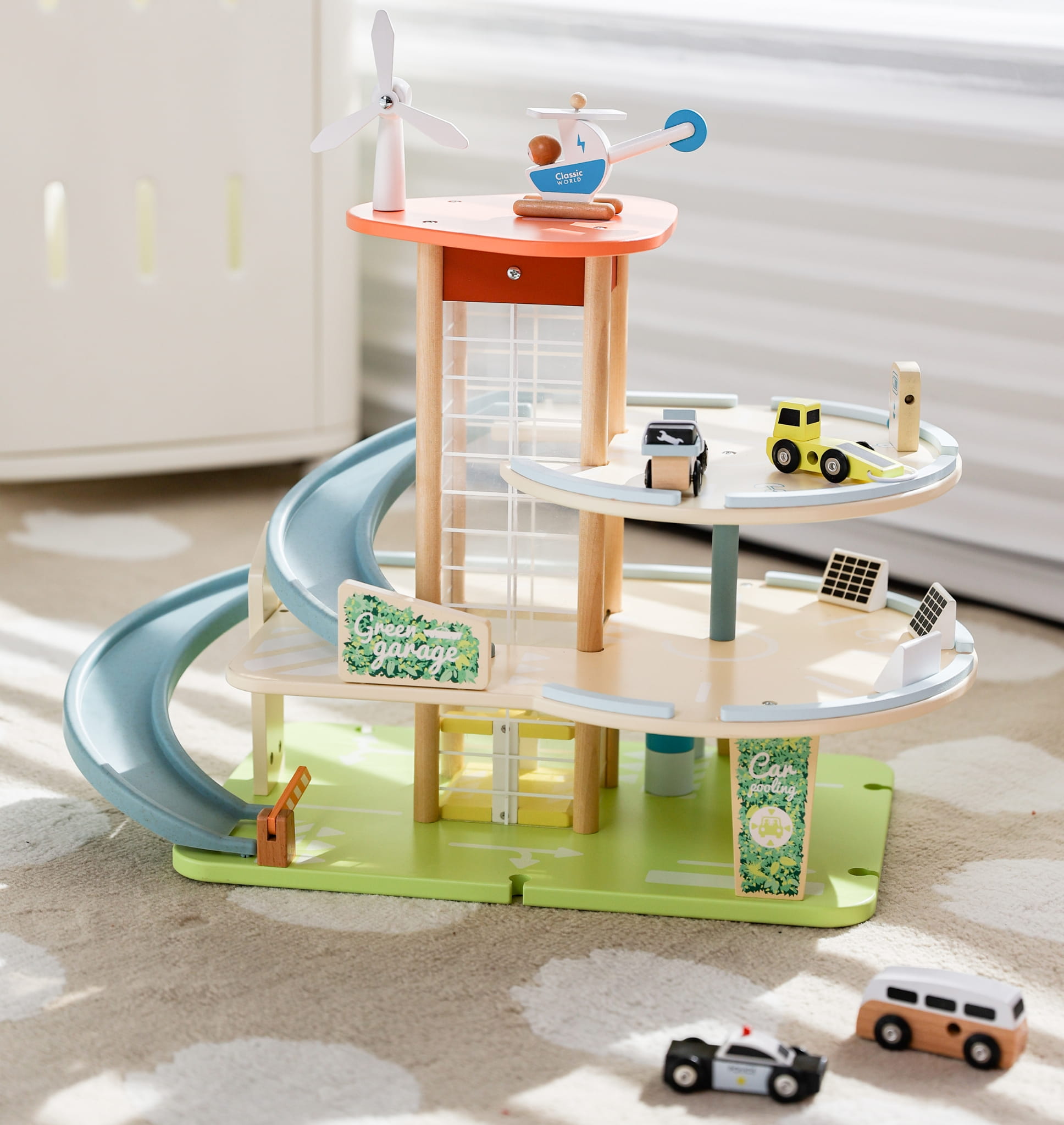 Wielopoziomowy drewniany garaż z windą, stacją ładowania i helikopterem dla dzieci od 3 lat.