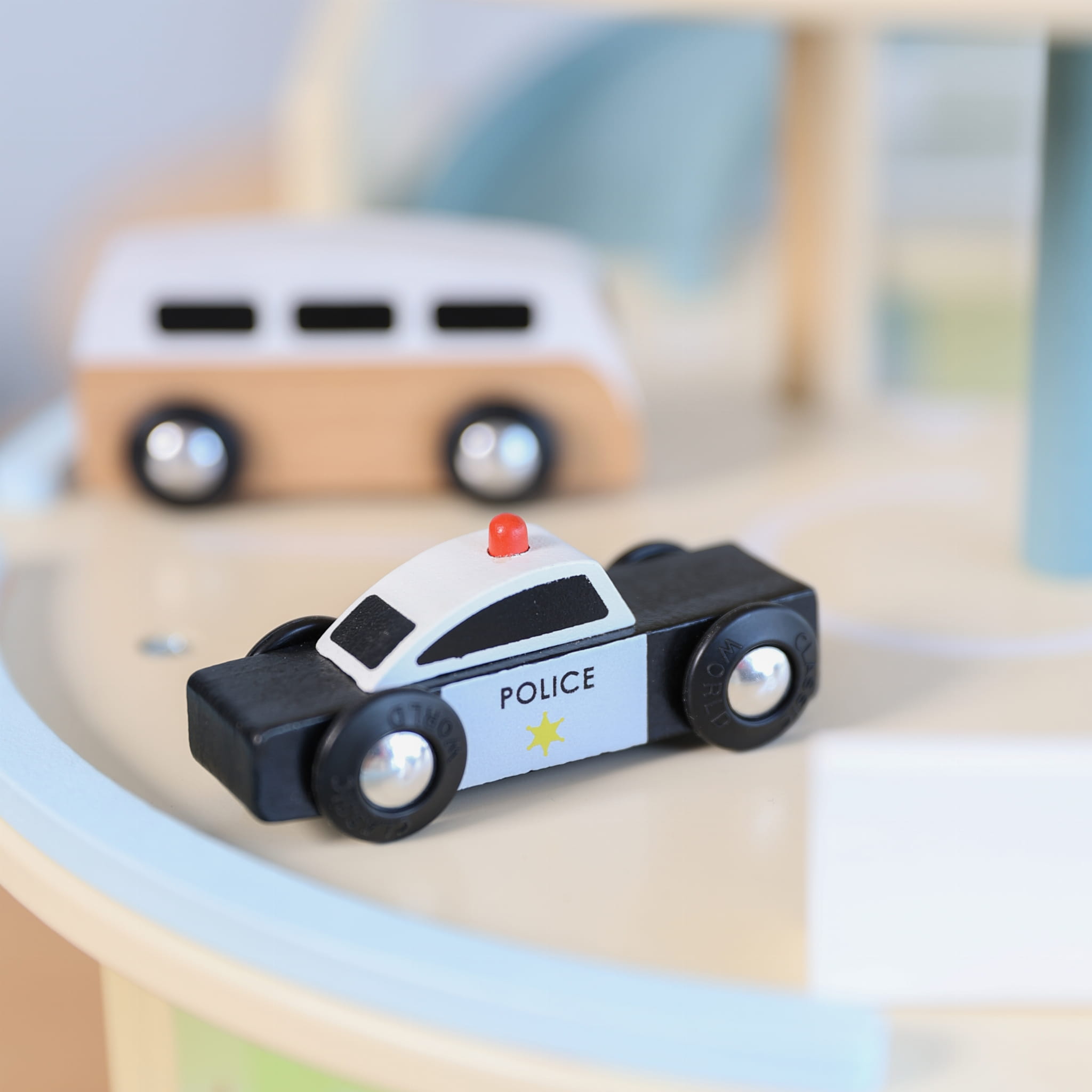 4 drewniane pojazdy (policyjny, autobus, laweta, helikopter)
