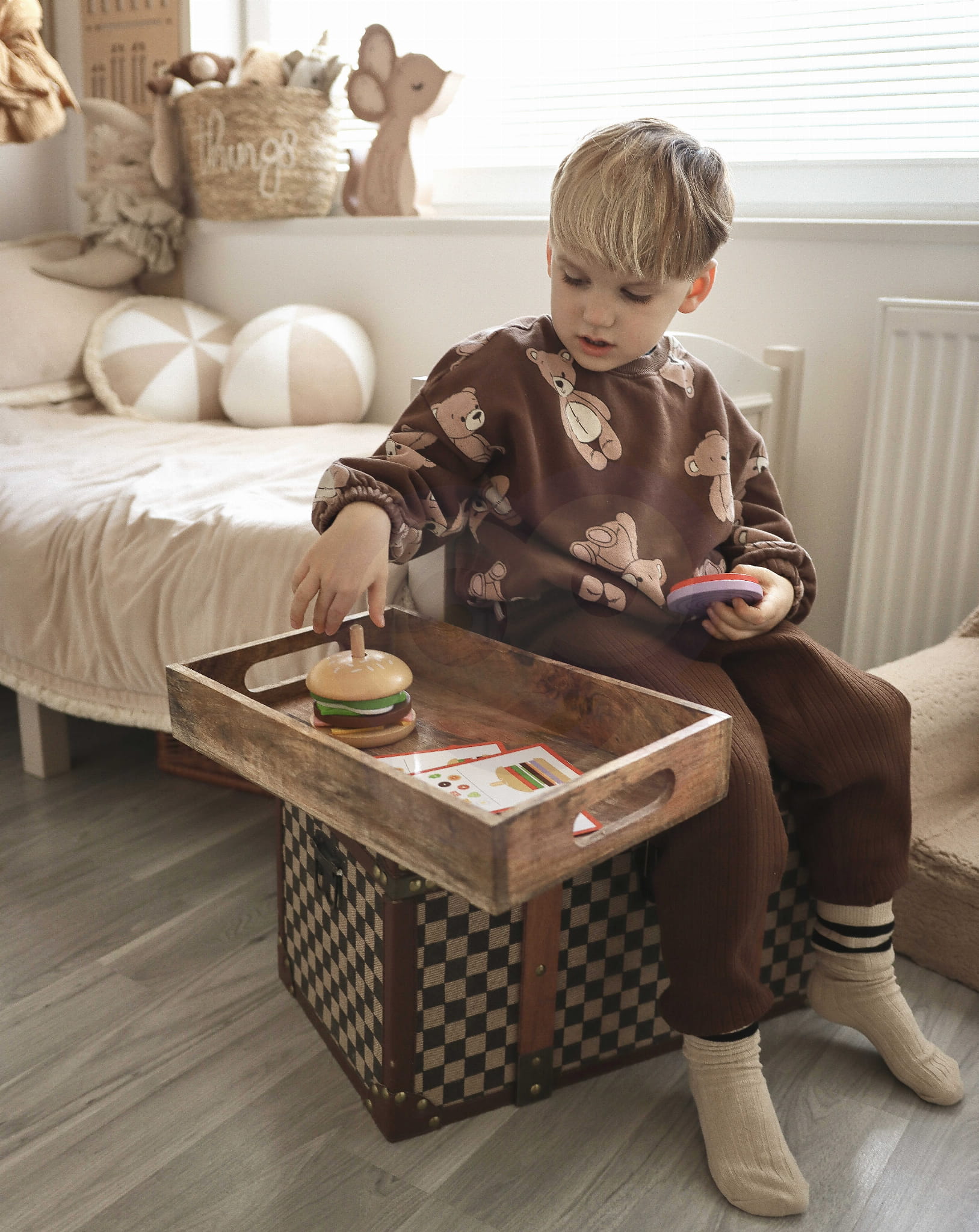 Zabawę można urozmaicić – maluch może ćwiczyć pamięć, odtwarzając burger z pamięci, lub stworzyć własne, fantazyjne kompozycje. Dodatkowo, układanka zachęca do odgrywania ról i wcielania się w kucharza, rozwijając wyobraźnię i kreatywność. Drewniane elementy z zaokrąglonymi krawędziami są bezpieczne dla dziecka, a wysoka jakość wykonania i certyfikat FSC gwarantują trwałość i odpowiedzialność ekologiczną.