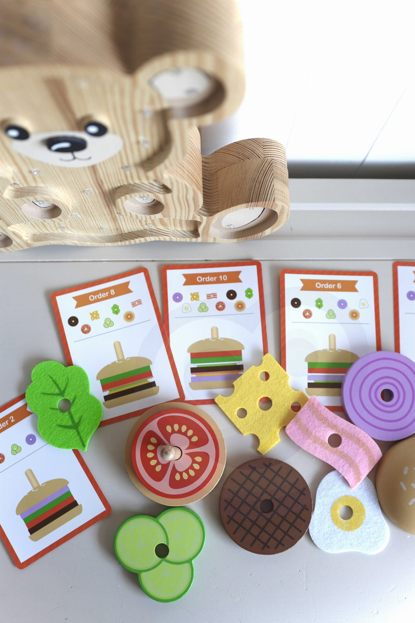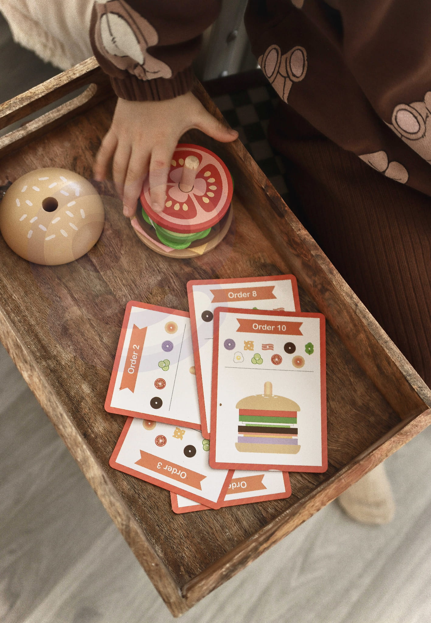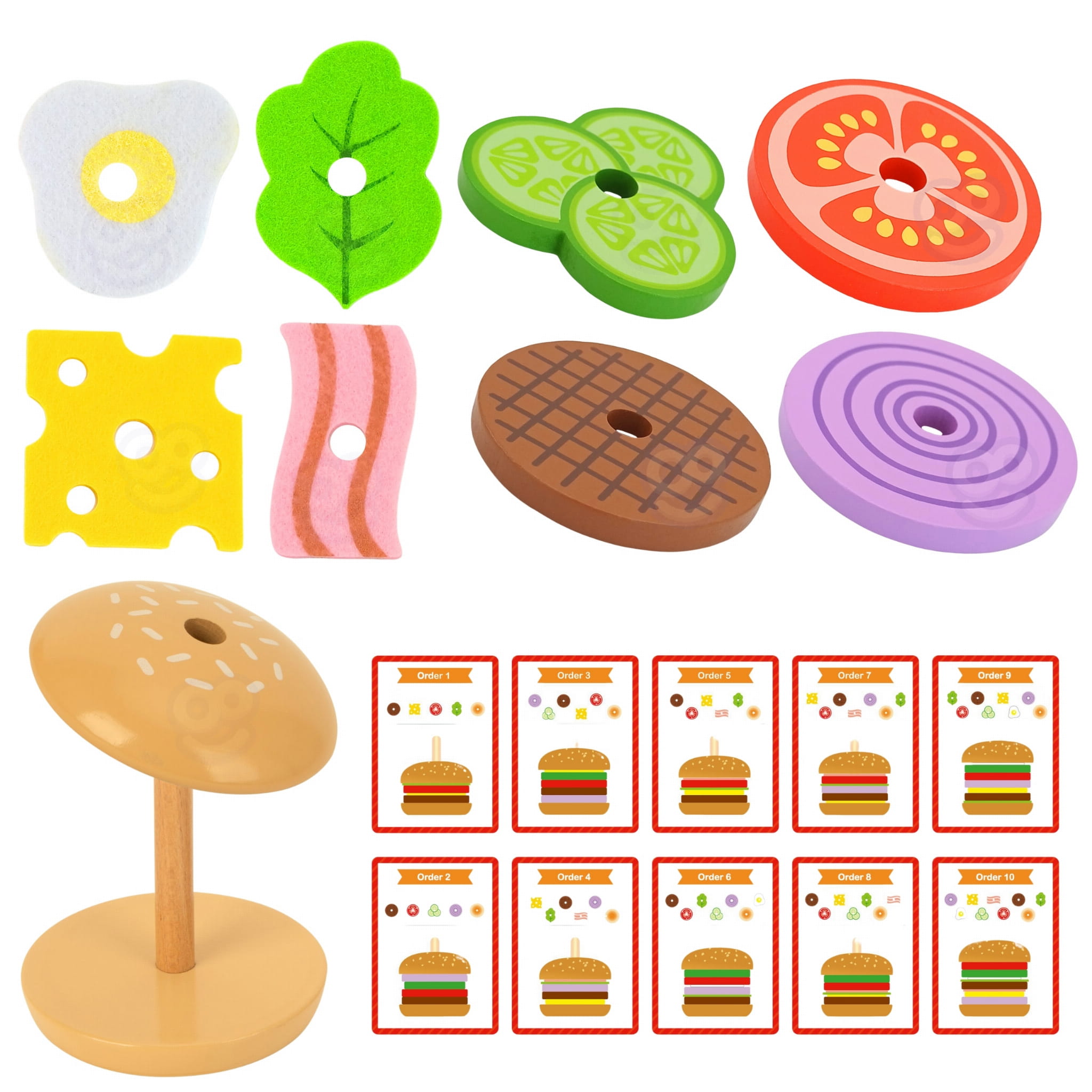 Drewniany burger marki WOOPIE GREEN to wyjątkowa zabawka edukacyjna inspirowana metodą Montessori. Zestaw 15 elementów zawiera 2 bułki, 8 składników burgera oraz 5 kart z 10 wzorami do odtworzenia. Zadaniem dziecka jest ułożenie burgera zgodnie z kartą – patrząc na grubość, kolor i kolejność składników.