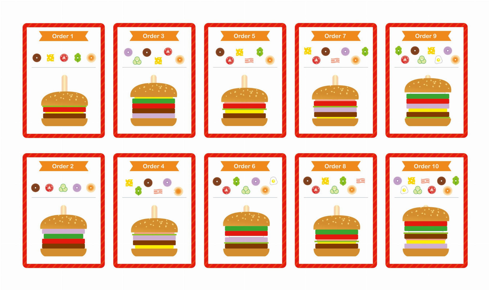 5 kart z 10 wzorami burgerów