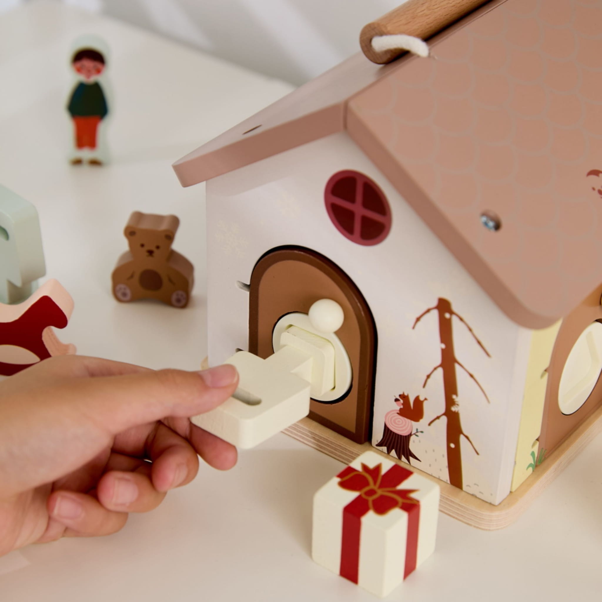 Drewniany domek edukacyjny z zamkami i kluczykami dla dzieci 18M+. Zabawka sensoryczna rozwija małą motorykę, logiczne myślenie i kreatywność.