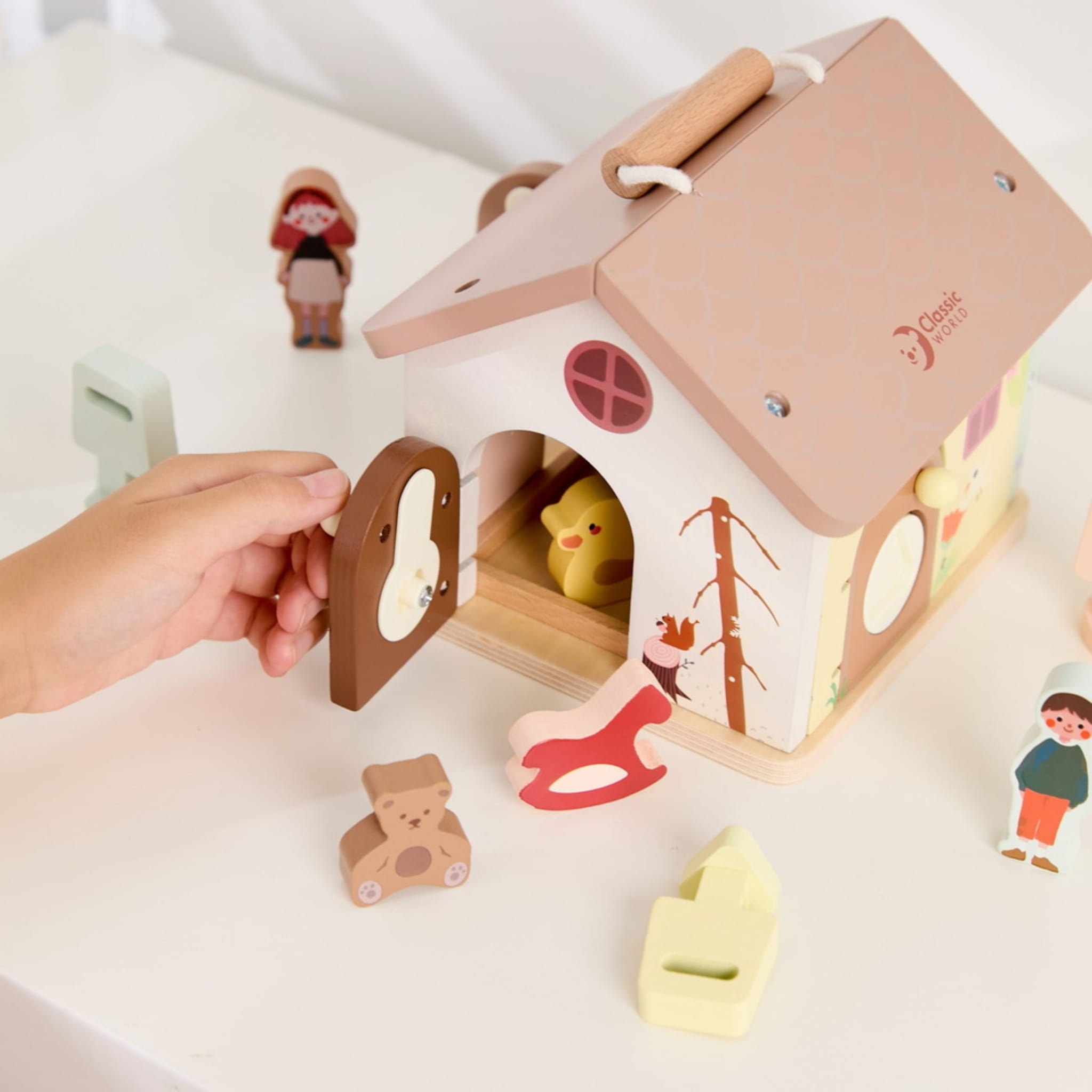 Domek został wykonany z trwałego i bezpiecznego drewna, malowany nietoksycznymi farbami, co zapewnia długotrwałą i bezpieczną zabawę. Solidna konstrukcja i uchwyt do przenoszenia pozwalają zabrać domek w każde miejsce, wspierając zabawę indywidualną i w grupie.
