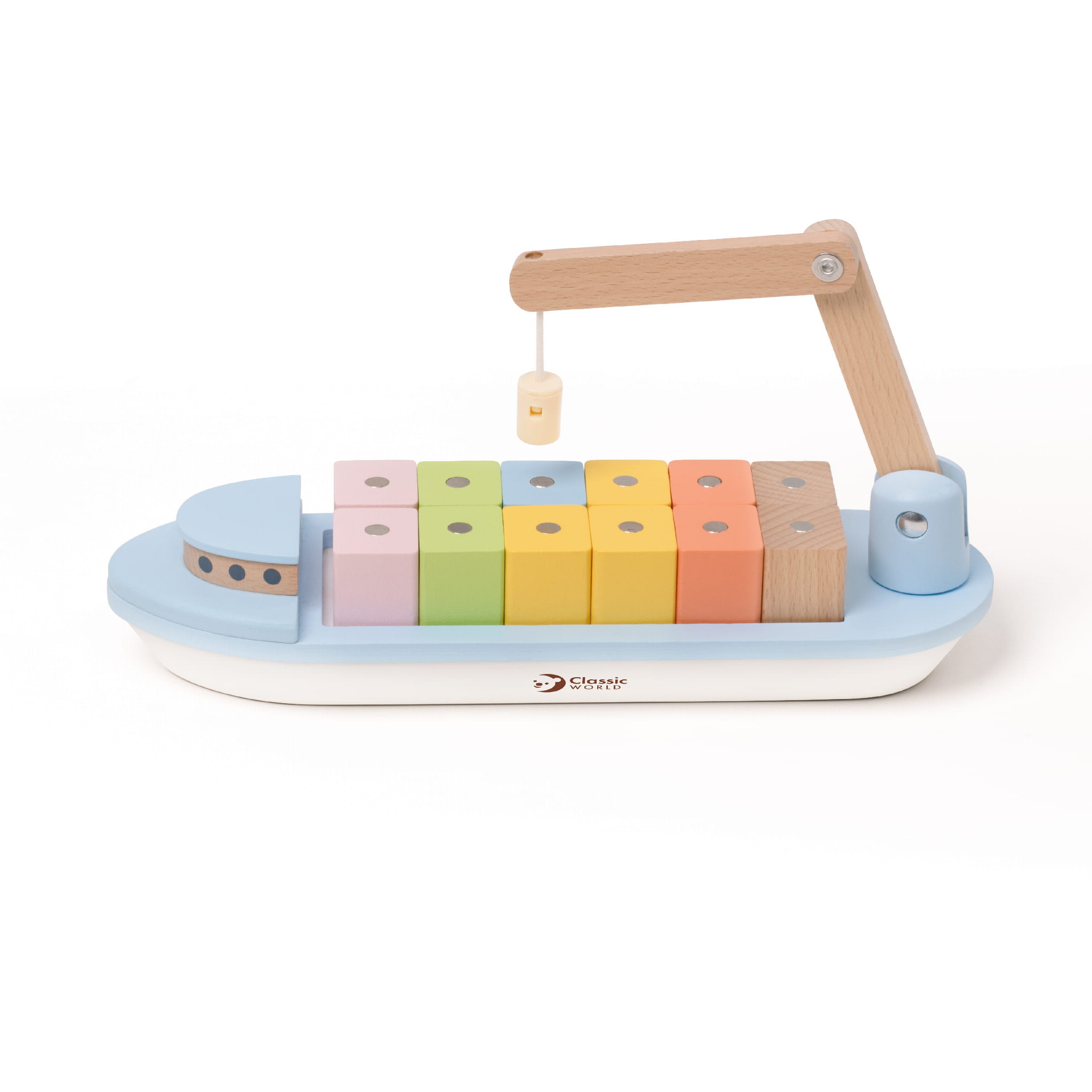 Drewniany Statek Układanie Bloków od marki CLASSIC WORLD to zabawny mały statek towarowy, załadowany obfitymi towarami. Statek ma 12 kolorowych bloków magnetycznych, a dzieci mogą je dowolnie ładować i rozładowywać przesuwając elastyczny żuraw. Kolorowy statek zapewni godziny pomysłowej zabawy dla twojego malucha, poprawi jego zręczność i koncentrację.