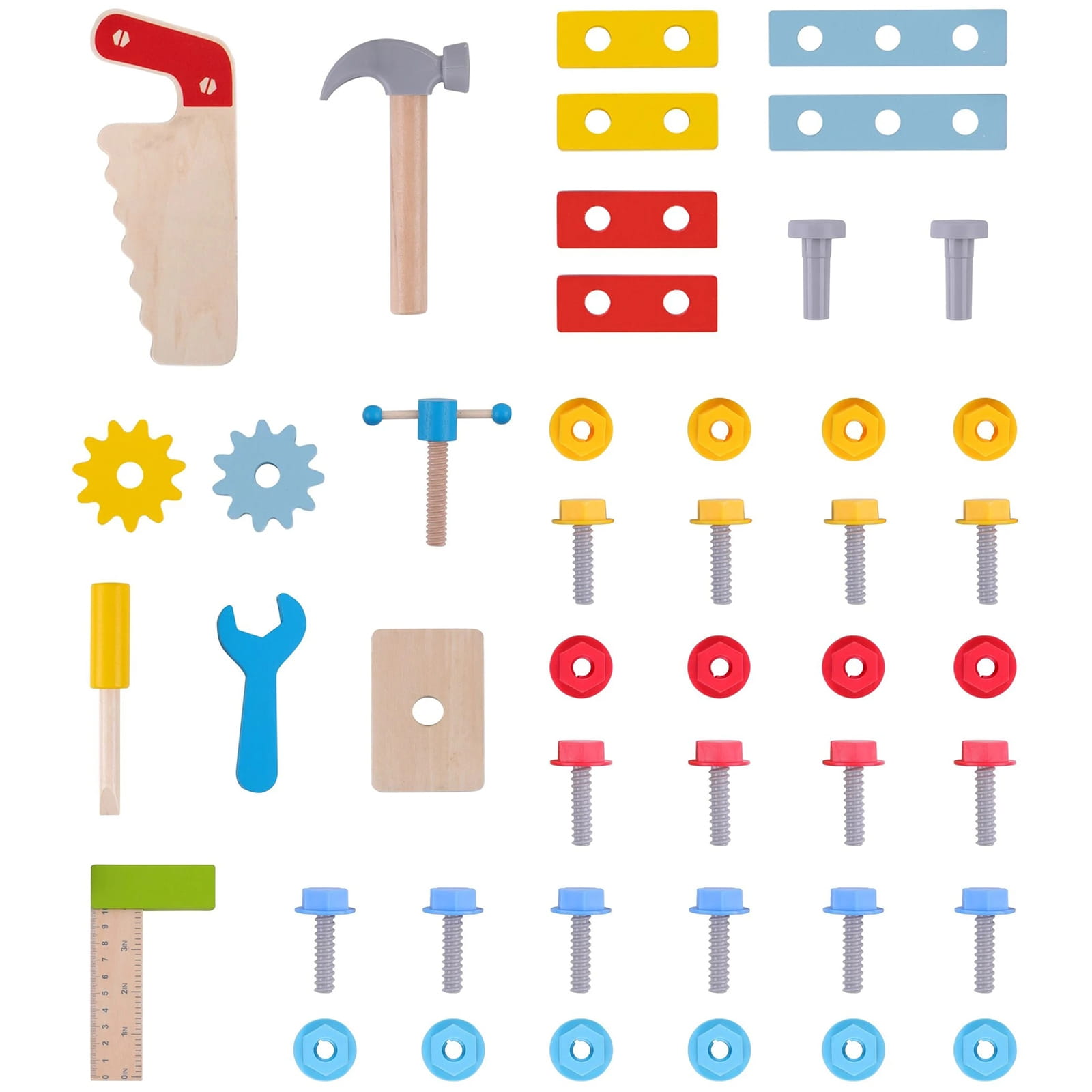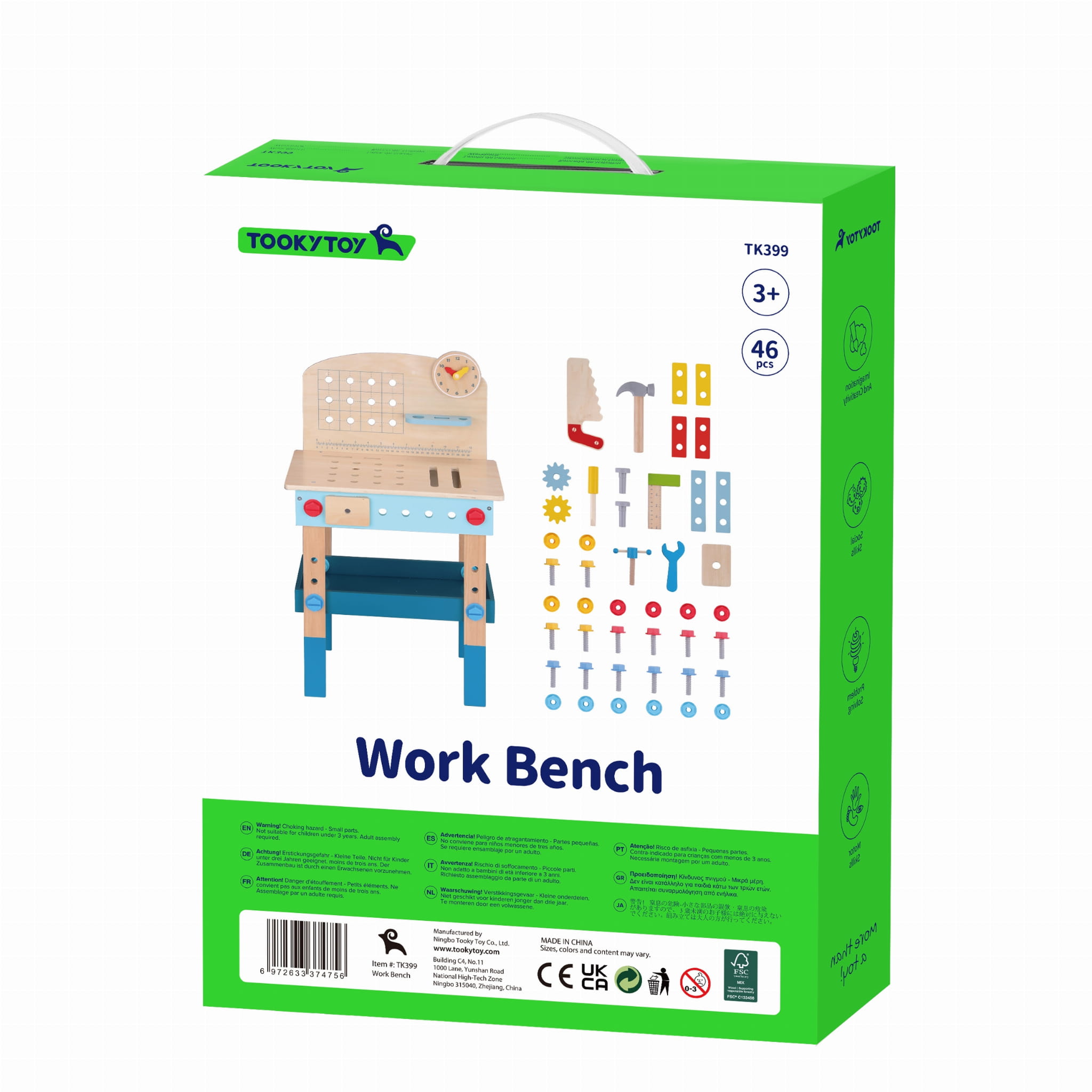 Drewniany stół do majsterkowania Tooky Toy to idealna zabawka dla małych majsterkowiczów. Zestaw zawiera stolik z miejscami na narzędzia oraz akcesoria, takie jak piła, młotek, klucz, śrubokręt, miarka, imadełko, śrubki, nakrętki, podkładki i koła zębate. Elementy można mocować do stołu, co daje dziecku poczucie sprawczości i rozwija zdolności manualne.
