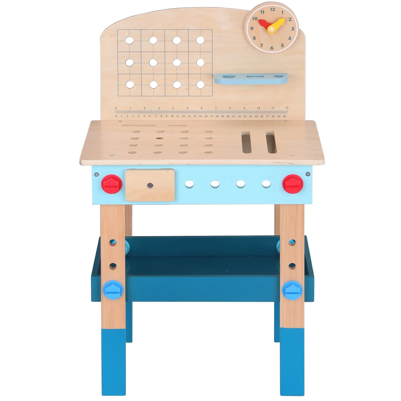 Zabawka wspiera rozwój małej motoryki, koordynacji wzrokowo-ruchowej, kreatywności i wyobraźni. Podczas zabawy dziecko uczy się logicznego myślenia, planowania działań oraz rozumienia zasad funkcjonowania otaczającego świata. Bezpieczne wykonanie z drewna i nietoksyczne farby zapewniają komfort i bezpieczeństwo użytkowania. Stolik z półkami i uchwytami umożliwia przechowywanie wszystkich narzędzi w zasięgu ręki, a zabawkowy zegar dodaje elementu zabawy edukacyjnej.