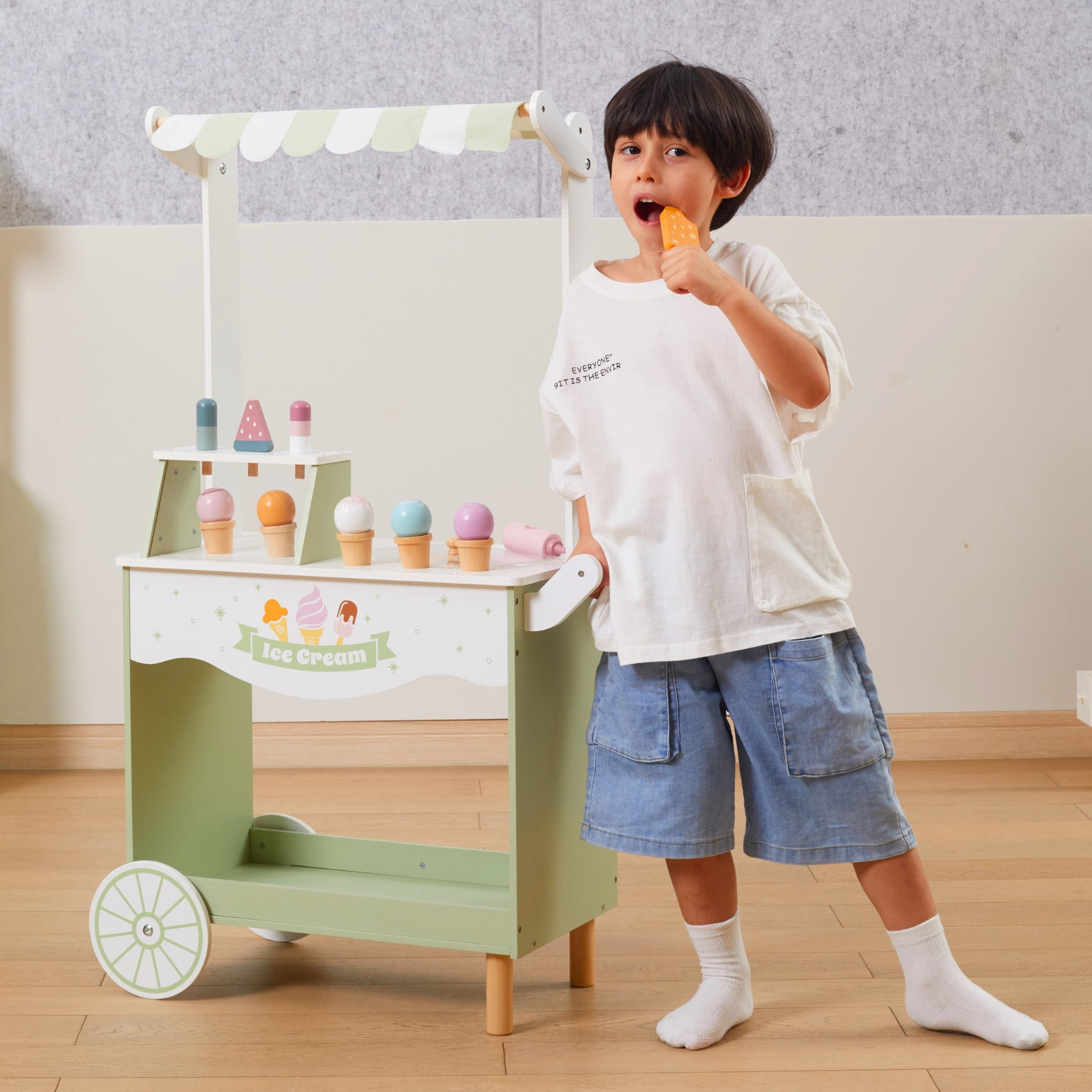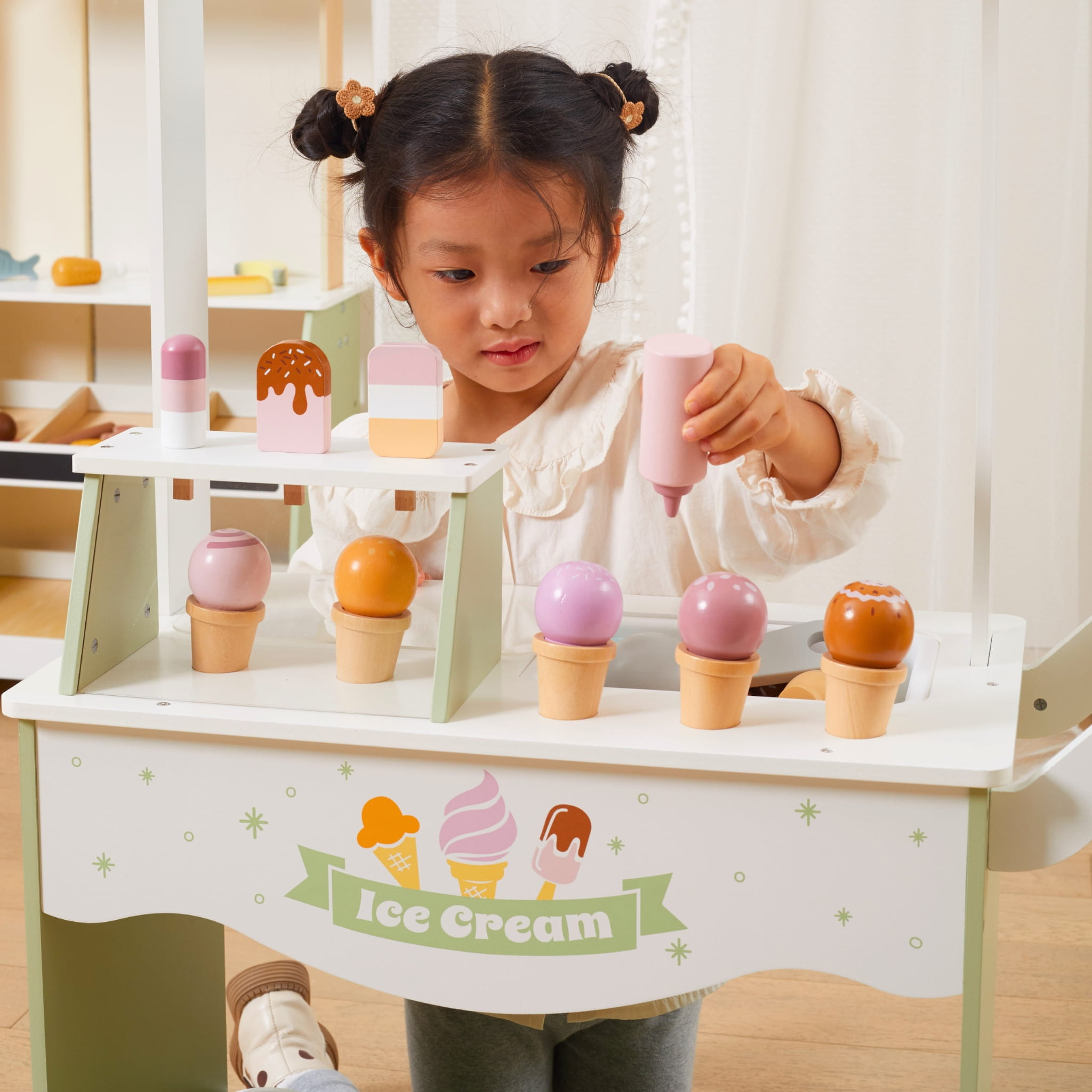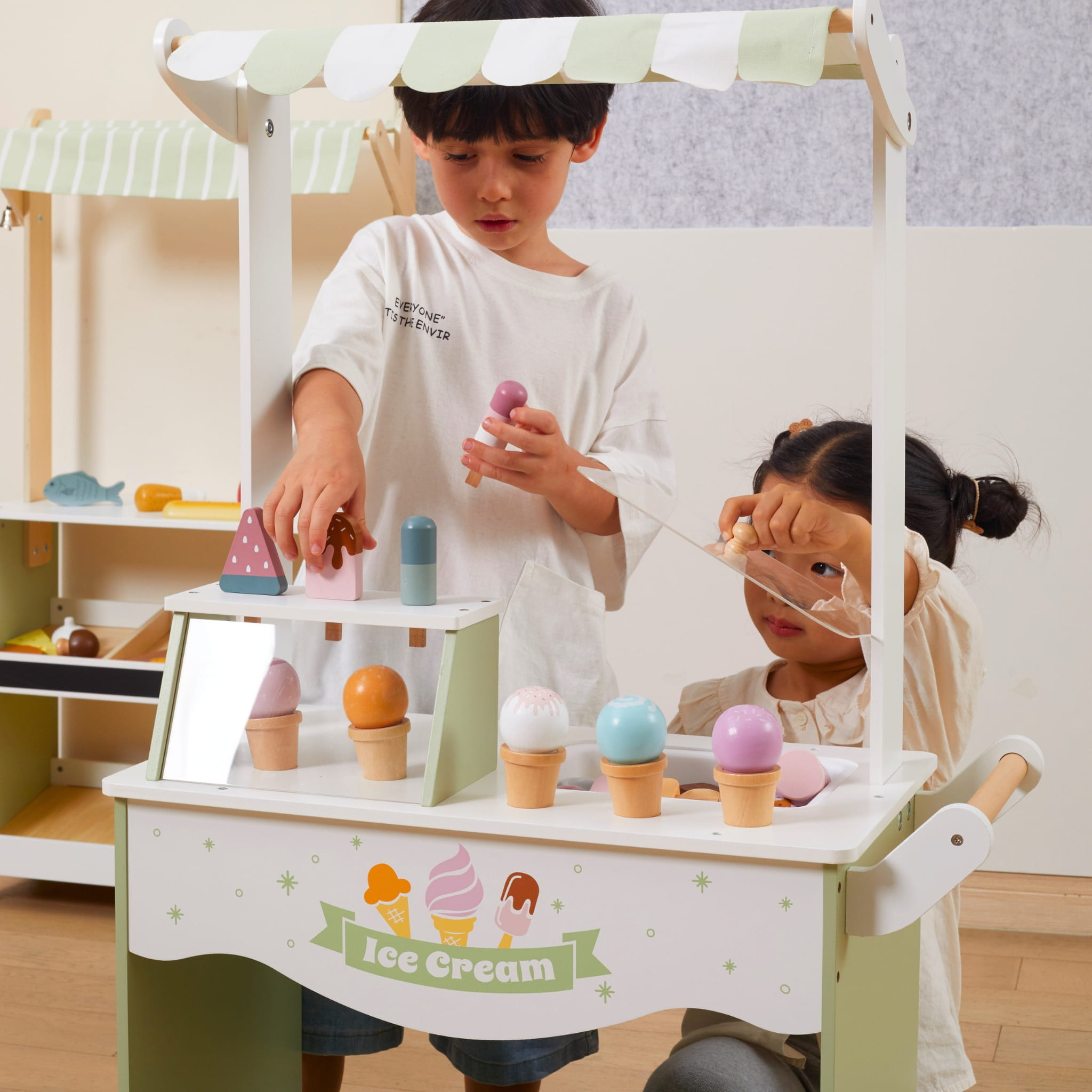 Duży drewniany stragan z lodami to mobilna lodziarnia dla dzieci 3+, która rozwija kreatywność, wyobraźnię i umiejętności społeczne podczas zabawy w małego sprzedawcę.