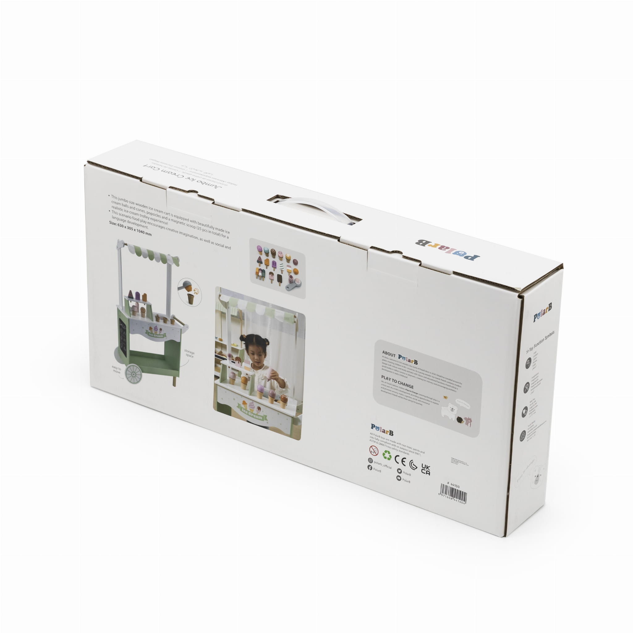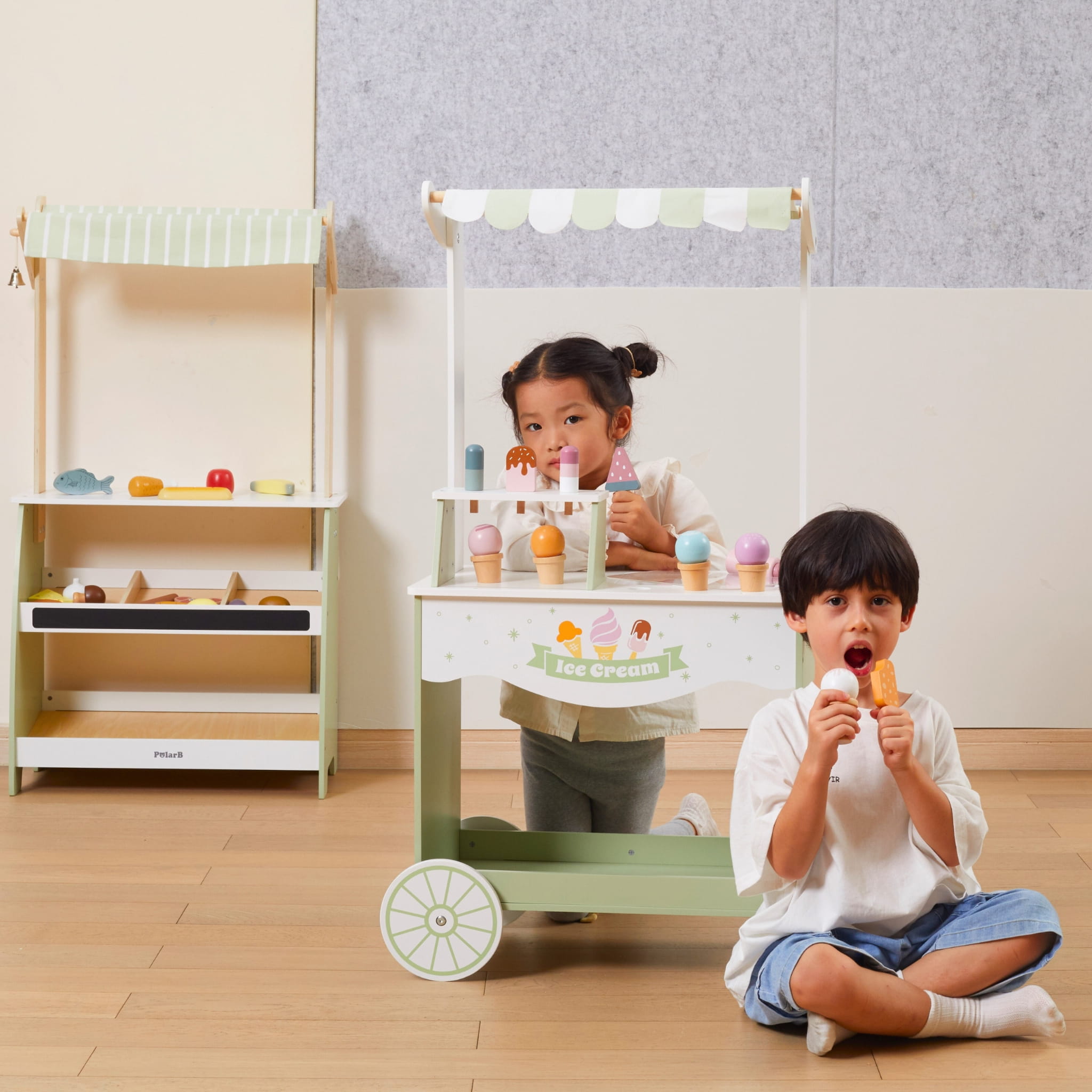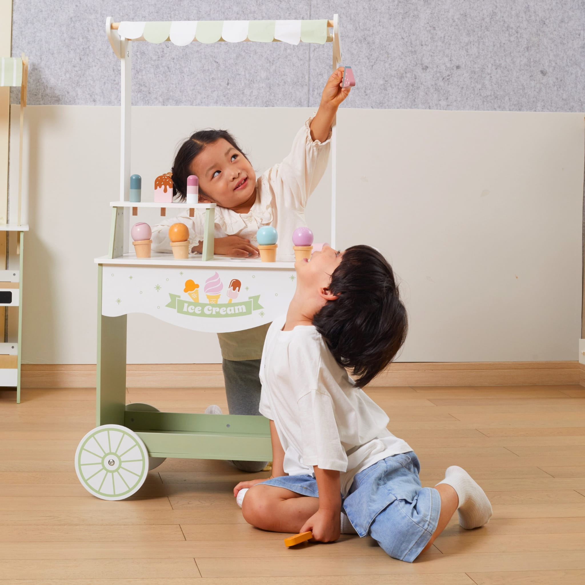 Duży drewniany stragan z lodami to mobilna lodziarnia dla dzieci 3+, która rozwija kreatywność, wyobraźnię i umiejętności społeczne podczas zabawy w małego sprzedawcę.