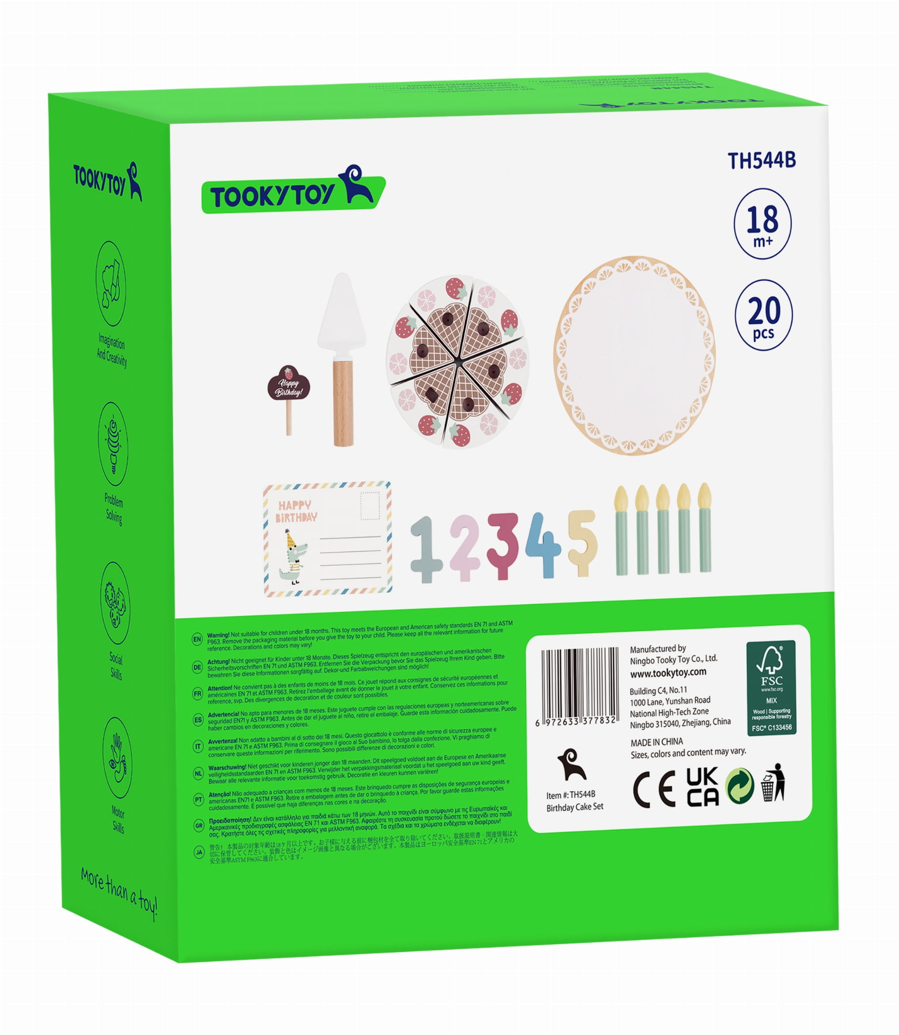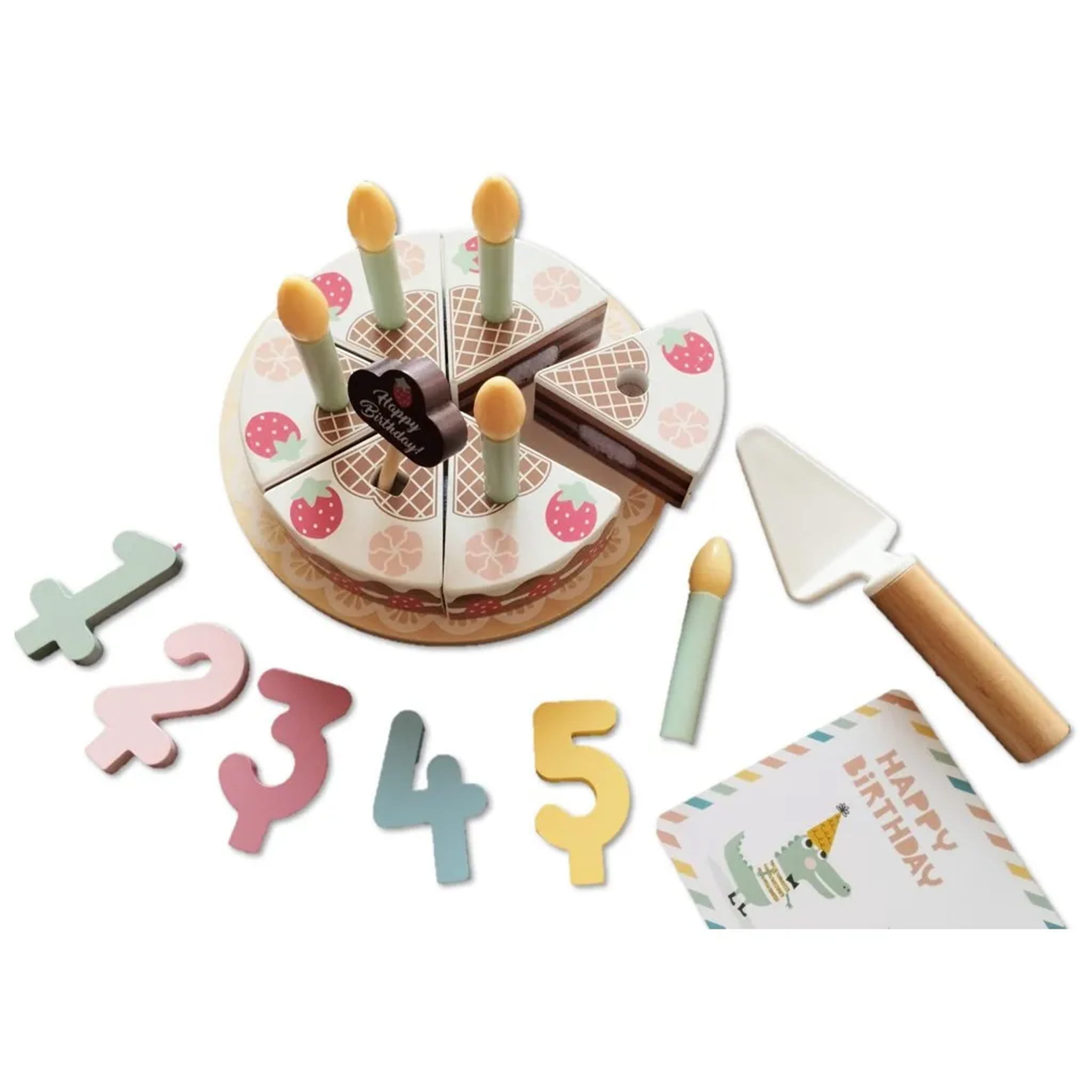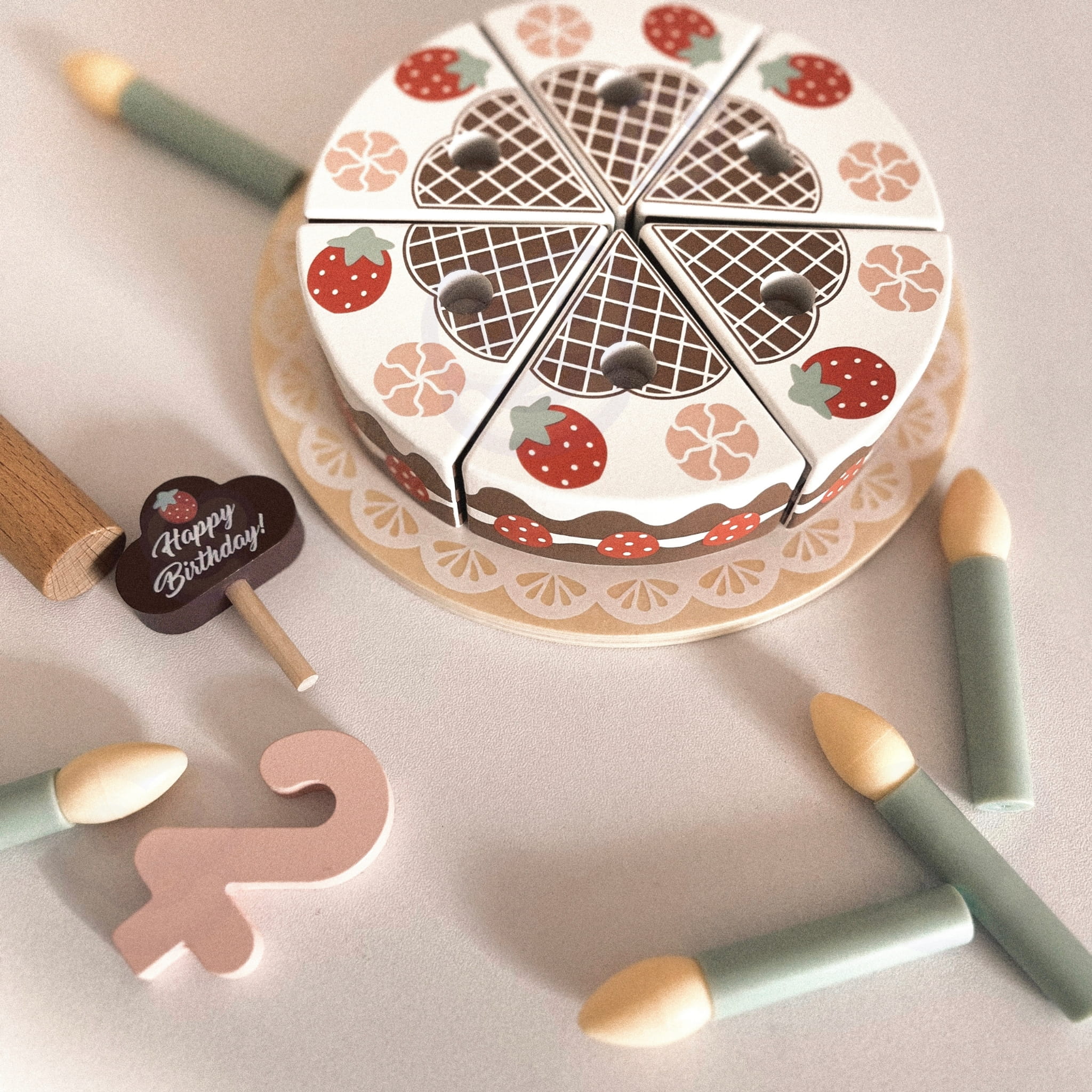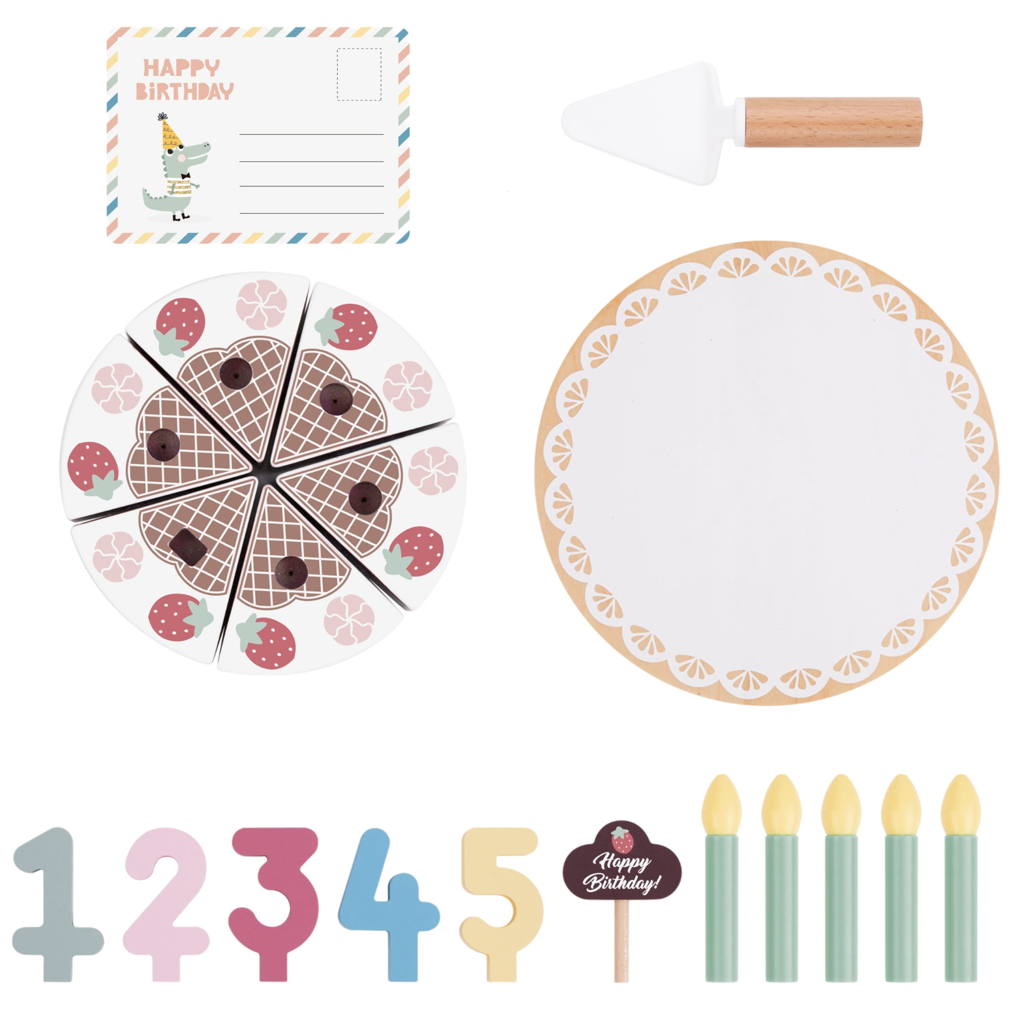 Drewniany tort urodzinowy na rzepy dla dzieci 18m+. Zestaw z 20 elementami, świeczkami i cyframi do krojenia i zabawy w przyjęcie.
