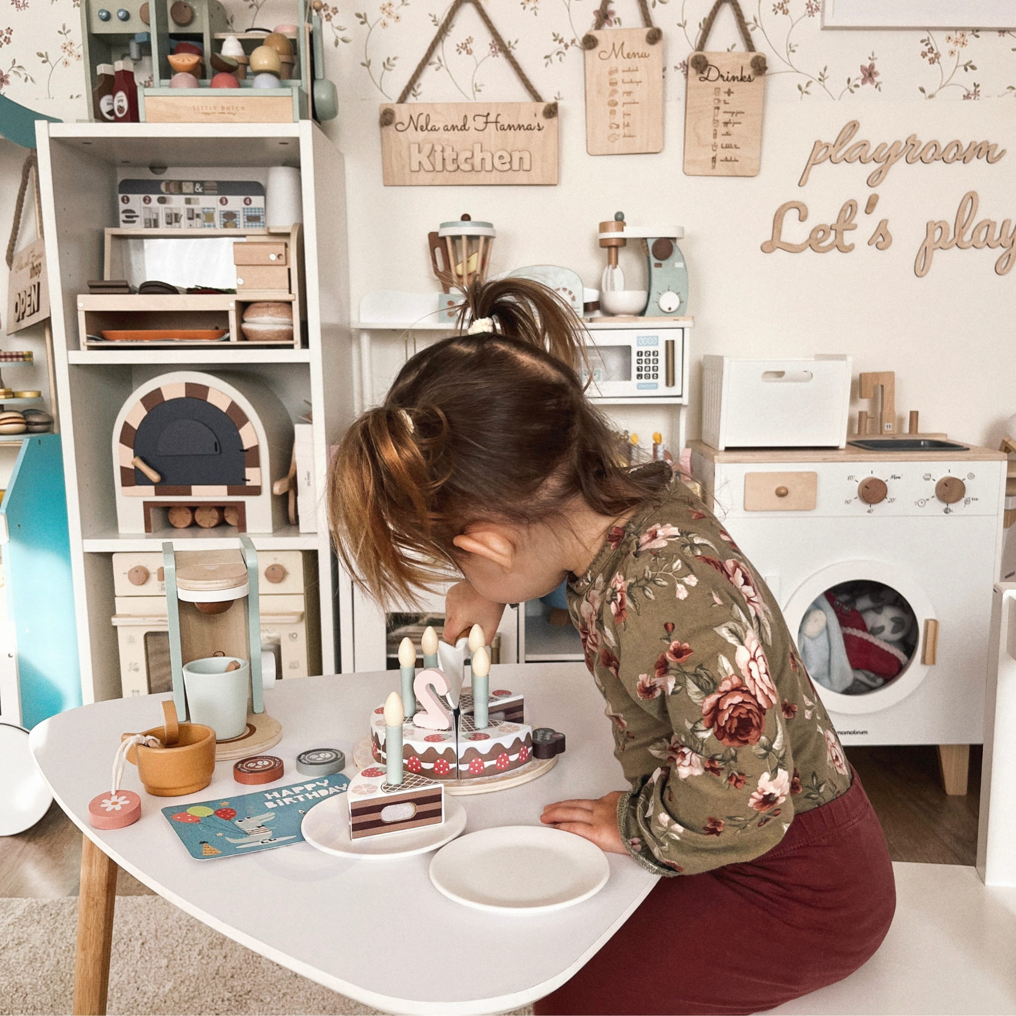 Drewniany tort urodzinowy na rzepy to kreatywna zabawka dla dzieci od 18 miesiąca życia, która pozwala odgrywać scenki z przyjęcia urodzinowego i zabawy w kuchnię. Kolorowy tort składa się z łączonych na rzepy kawałków, które dziecko może „kroić” i ponownie łączyć, ćwicząc precyzję ruchów i koordynację ręka–oko.