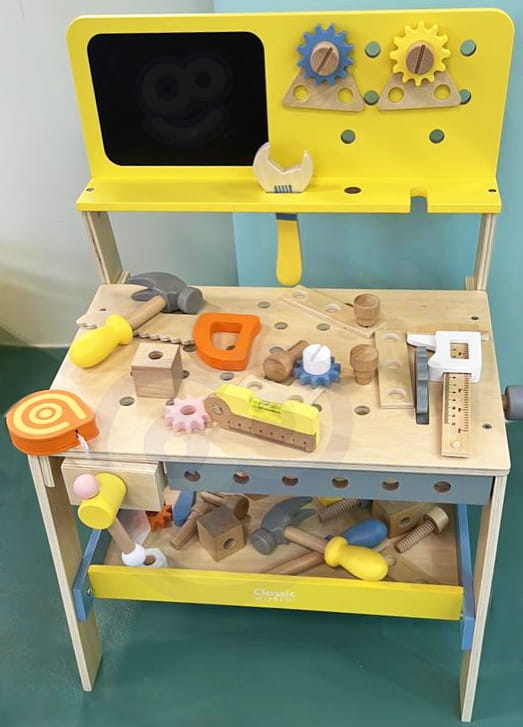 Drewniany warsztat narzędziowy dla dzieci od 3 lat rozwija motorykę małą, kreatywność i wyobraźnię. Zestaw z narzędziami i tablicą kredową pozwala na twórczą zabawę w majsterkowanie.