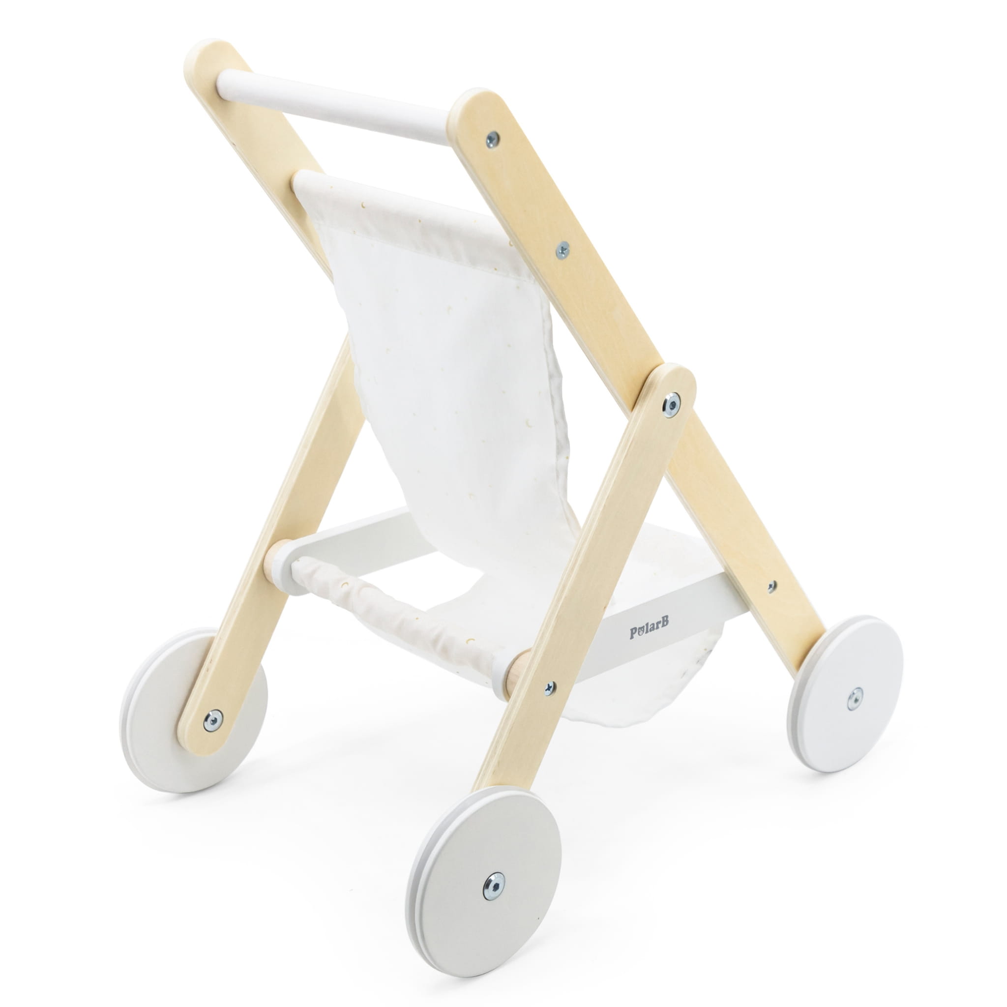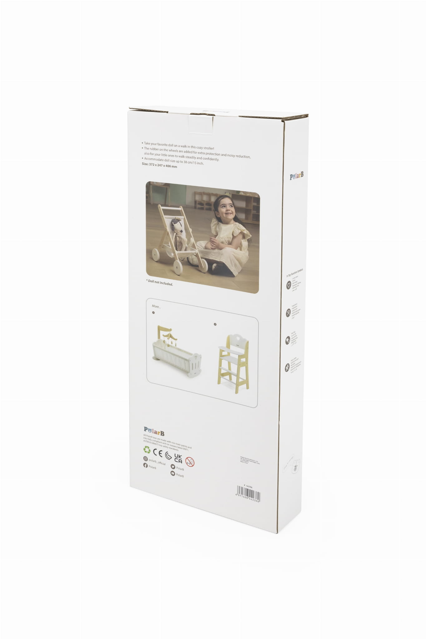 Zabierz swoją ulubioną lalkę lub misia na spacer w drewnianym wózku z serii PolarB od marki VIGA. Wózek posiada solidną drewnianą ramę, materiał ozdobiony jest nadrukiem gwiazd i księżyca, pod spodem poręczny kosz do przechowywania akcesoriów. Guma na kołach została dodana dla dodatkowej ochrony i redukcji hałasu a także dla najmłodszych aby mogli chodzić stabilnie i pewnie. Pasuje do lalek o wysokości do 38 cm