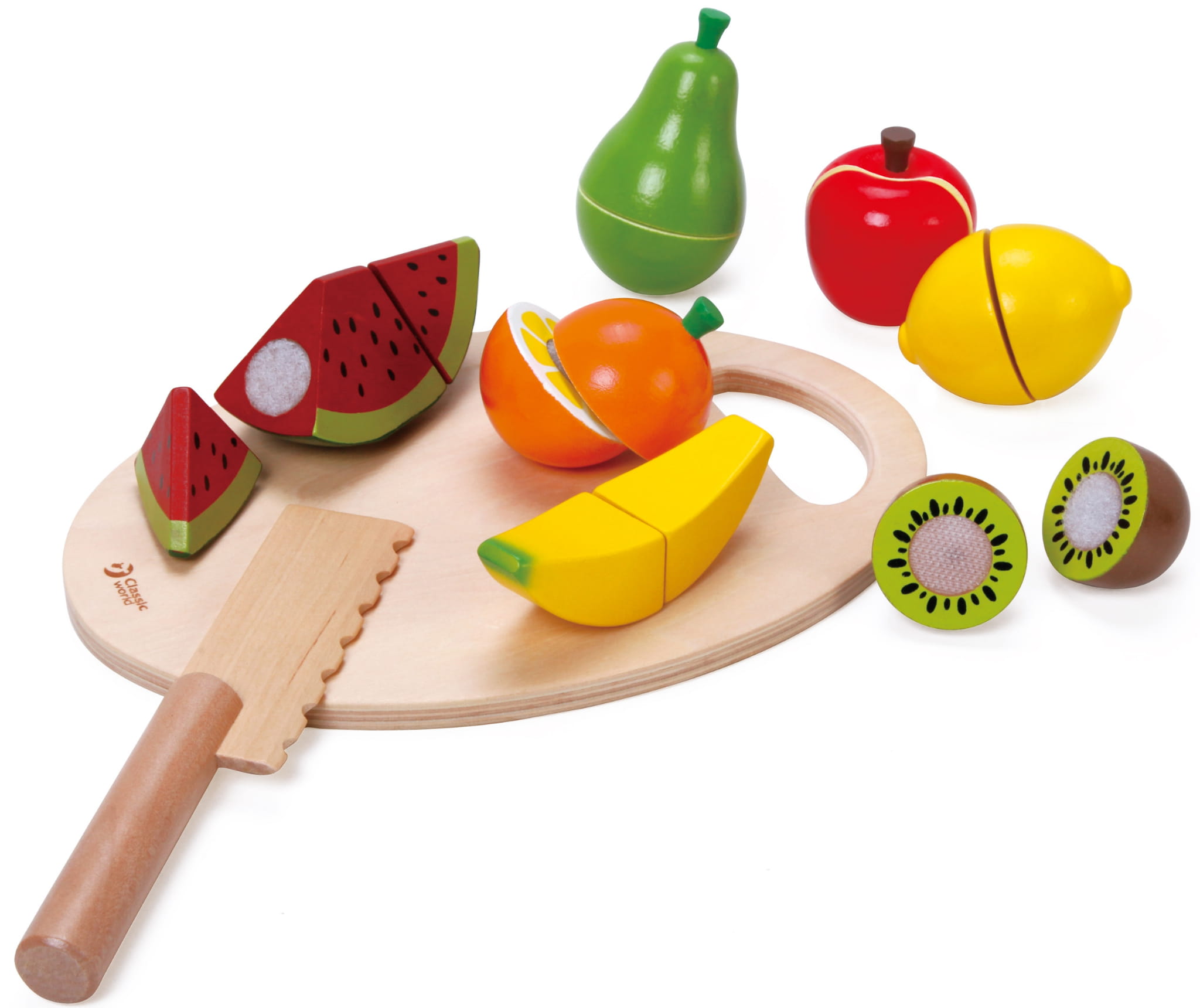 - - Dzieci, które wyjątkowo lubią obserwować co się dzieje w kuchni mogą spróbować swoich sił na drewnianej desce z owocami, których części połączone są za pomocą rzepa.